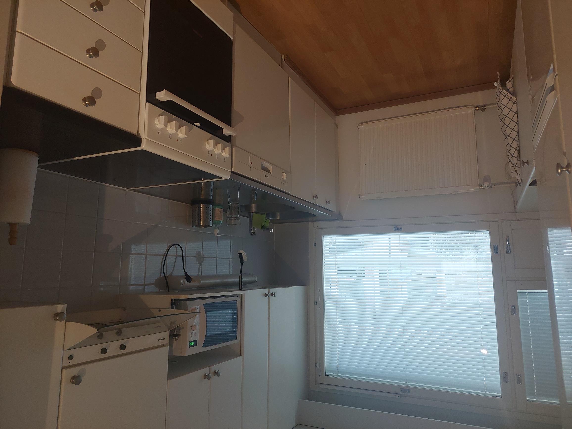 Liesi (Keraaminen liesi), työtasot (laminaatti), seinät (maali), lattiat (laminaatti), jääkaappipakastin, astianpesukone, liesi ja liesituuletin |