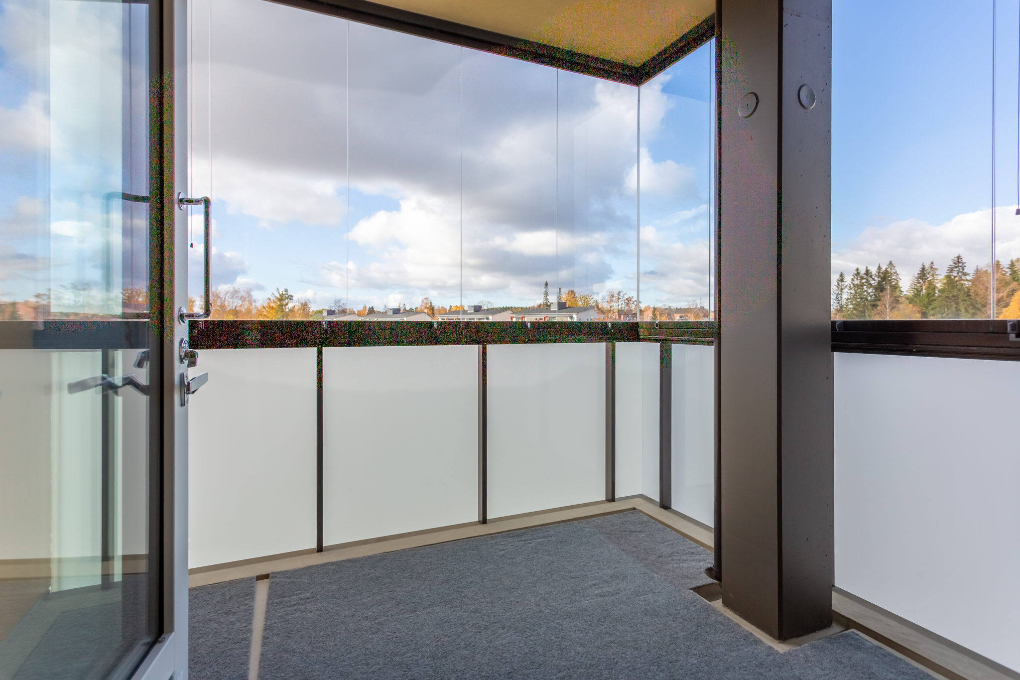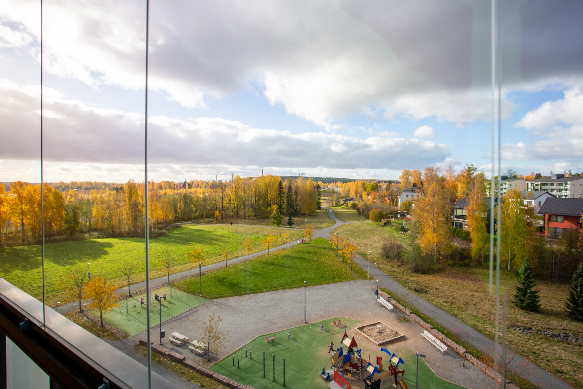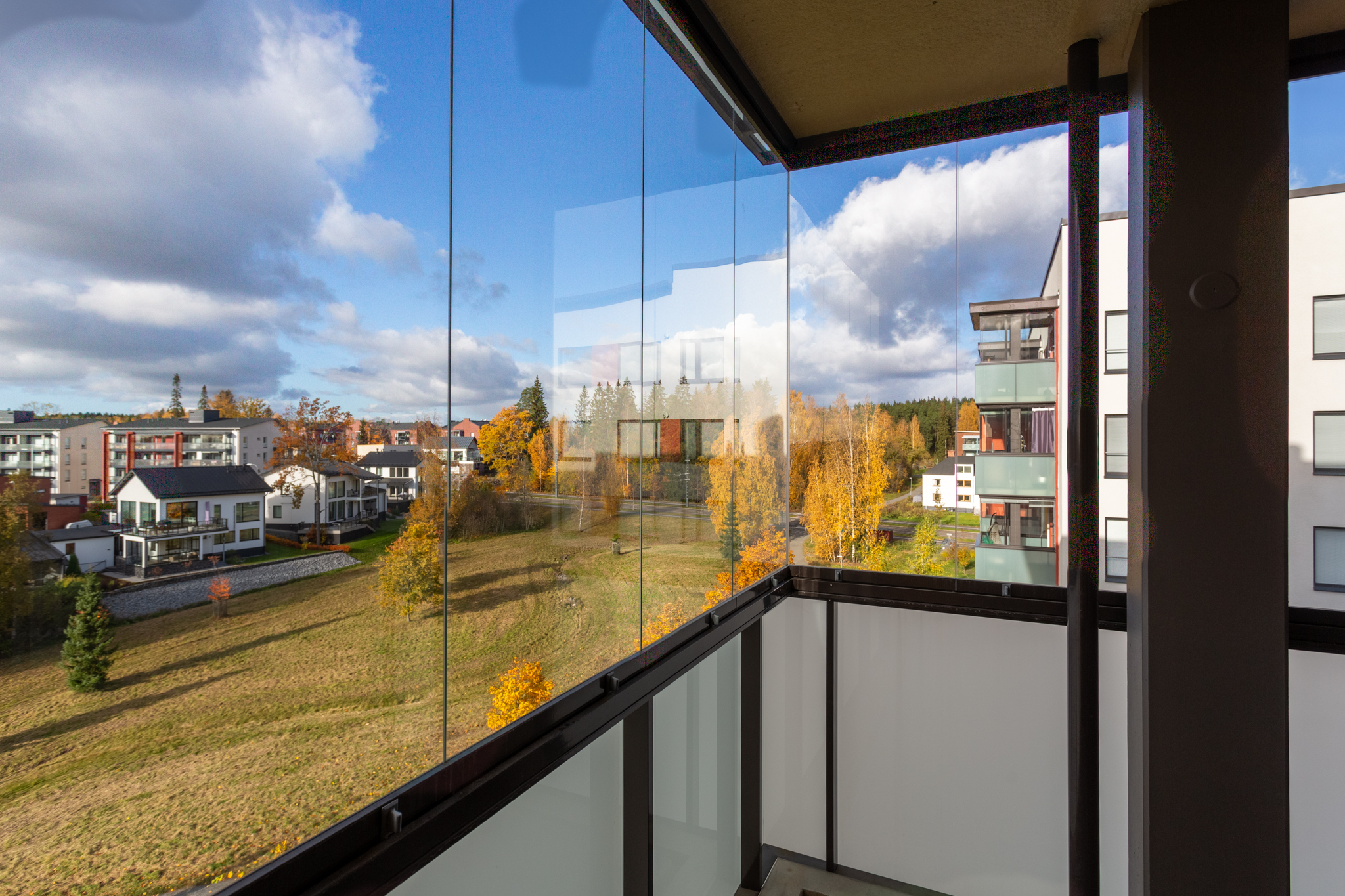 Parvekkeelta on kauniit näkymät vehreälle puistoalueelle ja pikkasen maisemassa pilkistää järvikin.