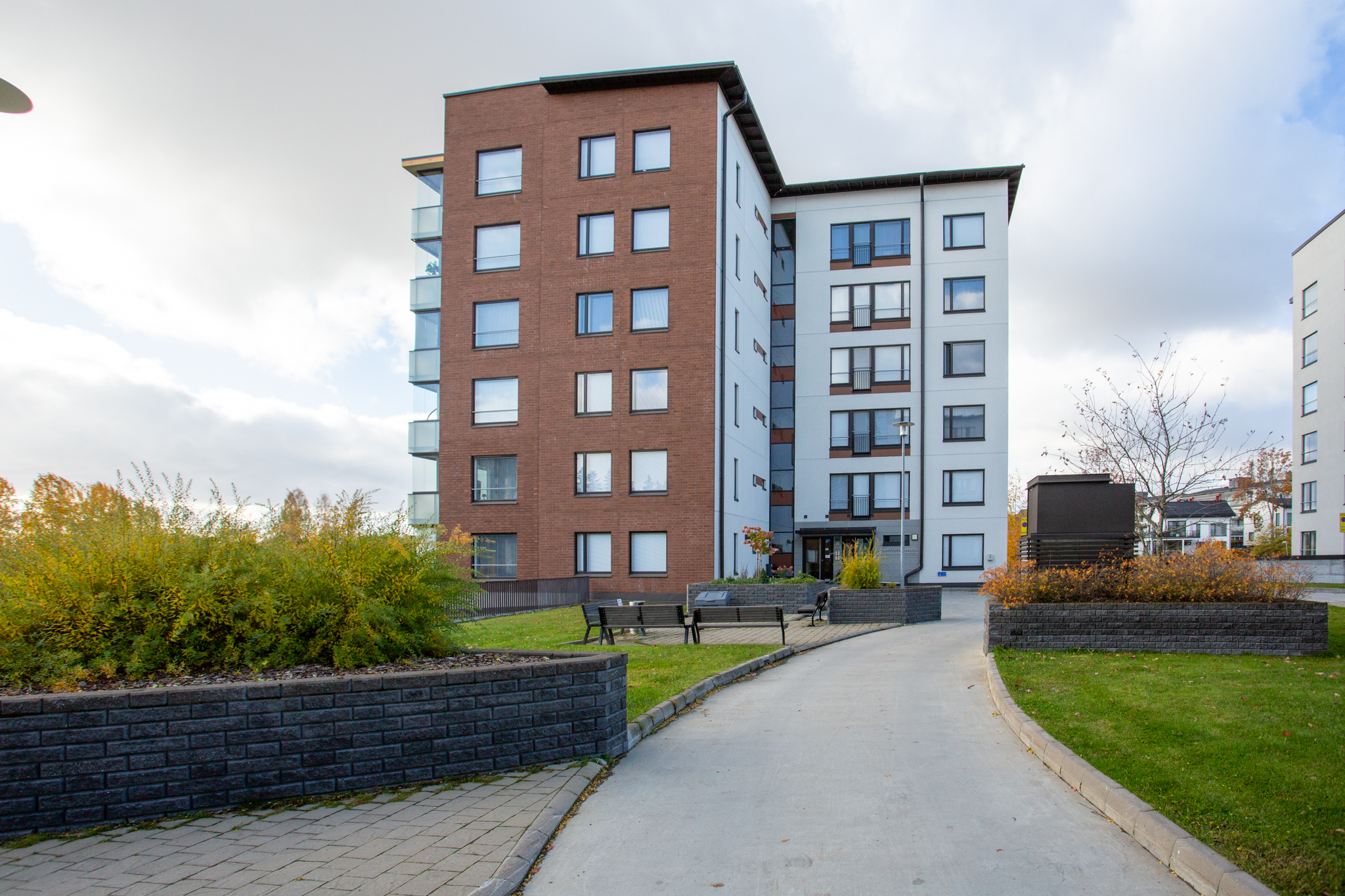 Hyvällä hoidolla oleva asuntoyhtiö asemoituu puistoalueen reunaan.