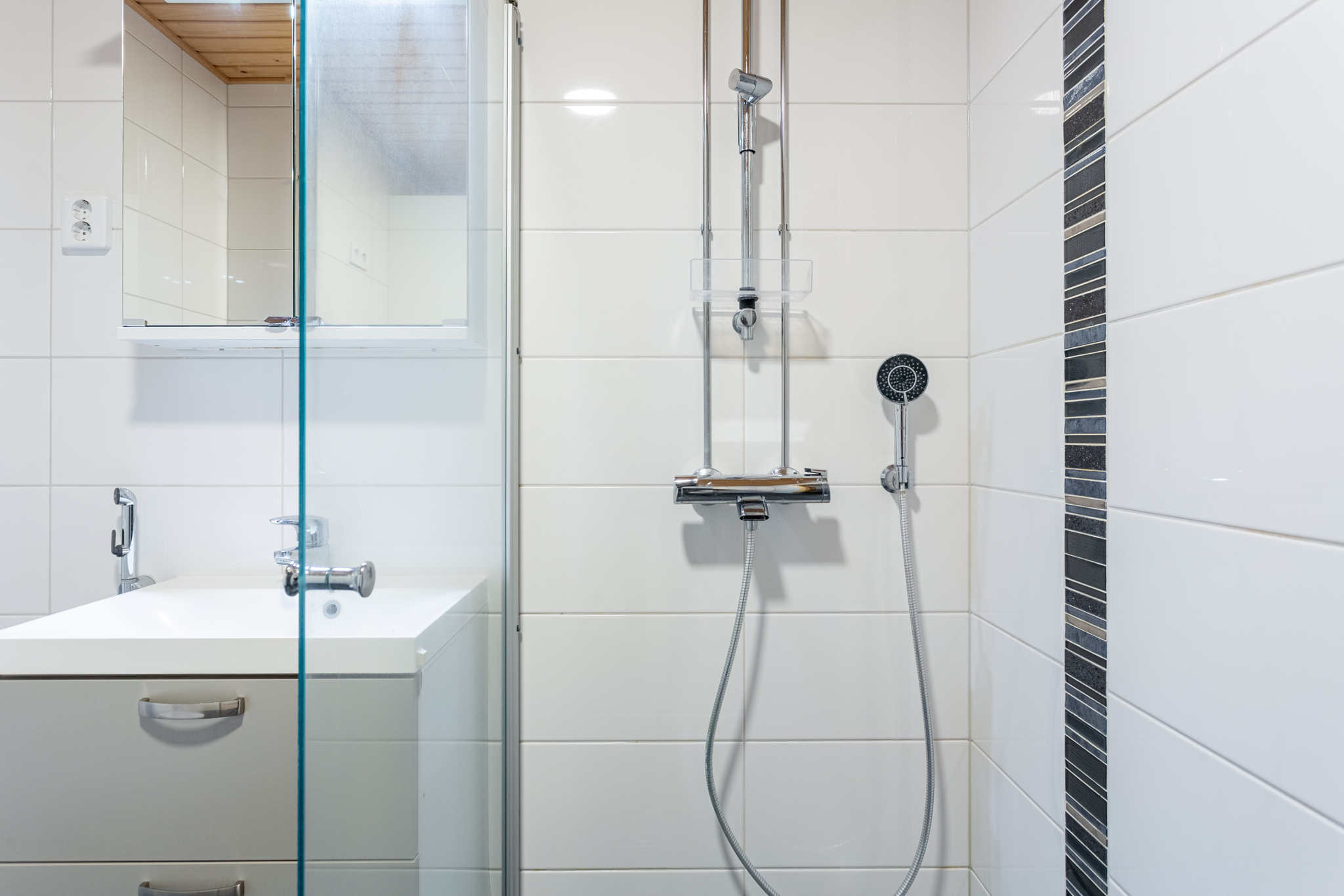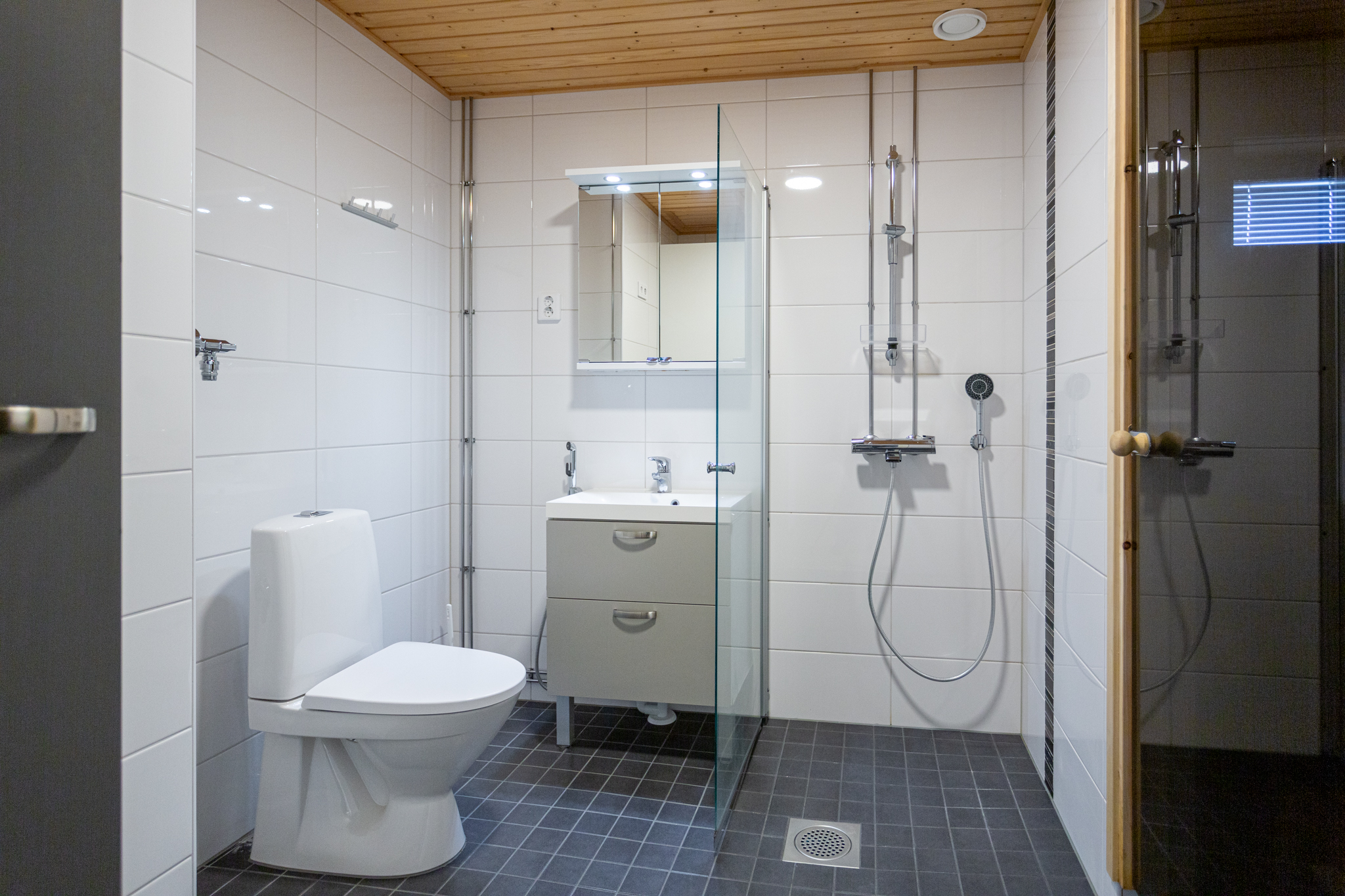 | Kylpyhuoneen kuvaus | WC-istuin, pesukoneliitäntä, lattialämmitys, peilikaappi, suihku, pesuallas, allaskaappi, bidee-suihku ja suihkuseinä, seinät (kaakeli), lattiat (laatta) |