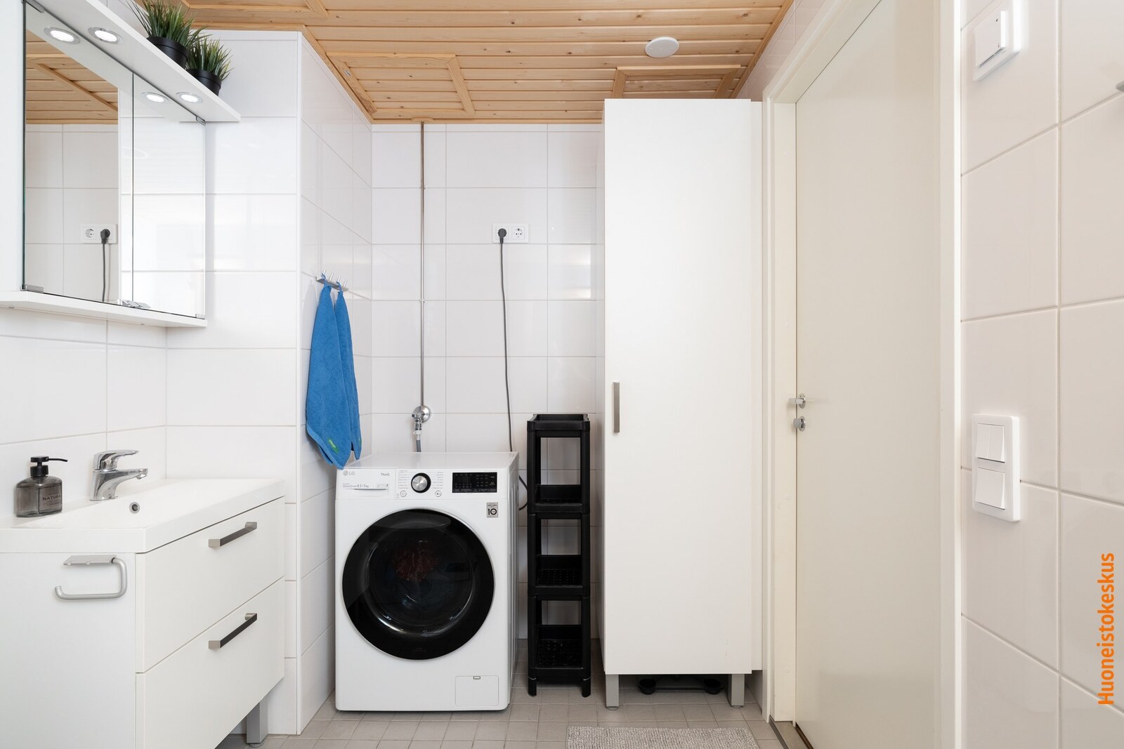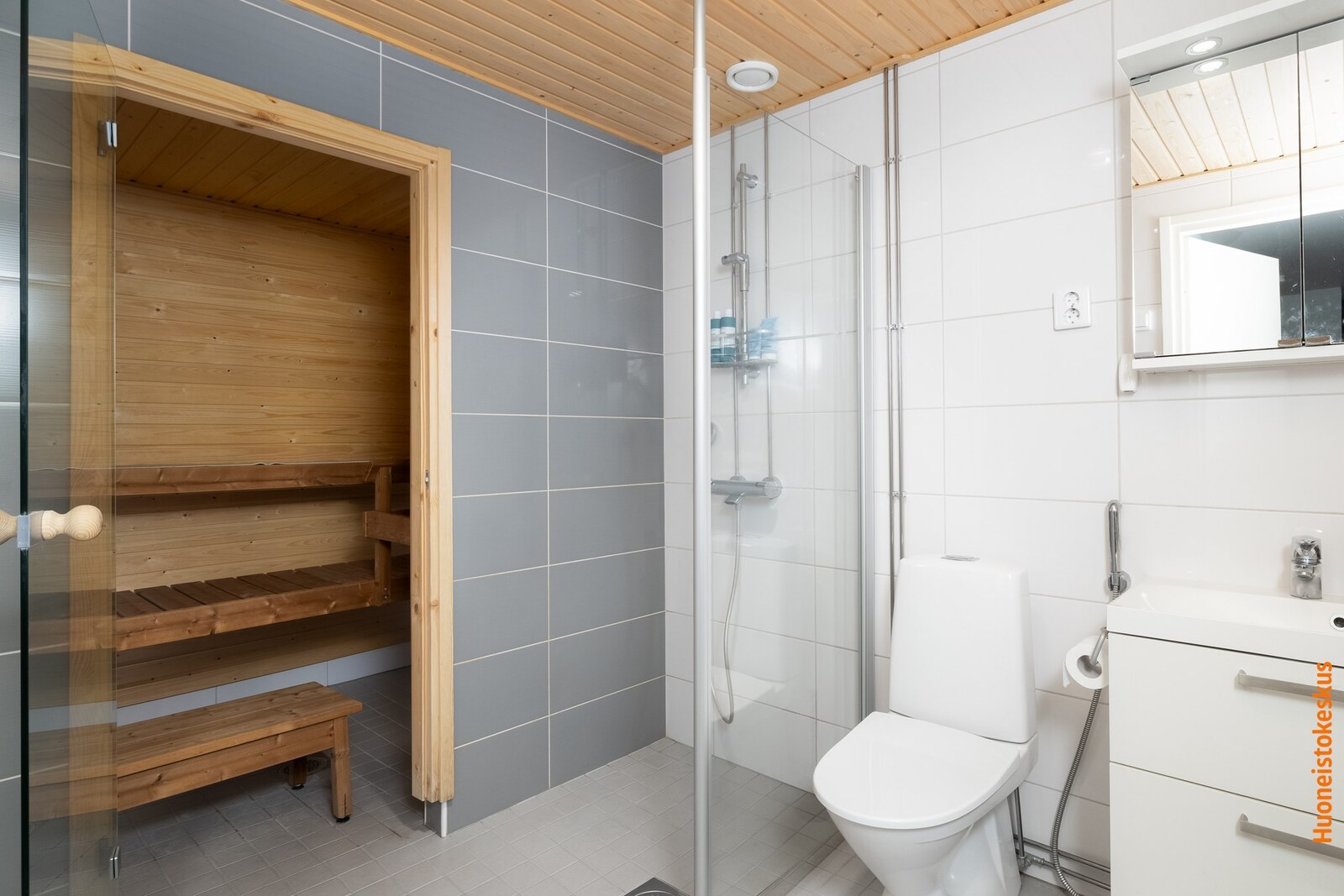 Allaskaappi, lattialämmitys, peilikaappi, pesukoneliitäntä, suihku ja wc-istuin, seinät (kaakeli), lattiat (laatta) |