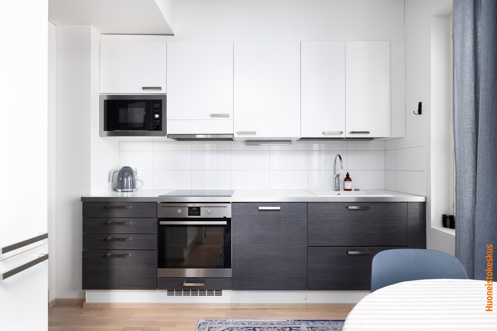 Liesi (Induktioliesi ja erillisuuni), työtasot (laminaatti), seinät (maali), lattiat (parketti), astianpesukone, erillisuuni, jääkaappipakastin, liesi ja liesituuletin |