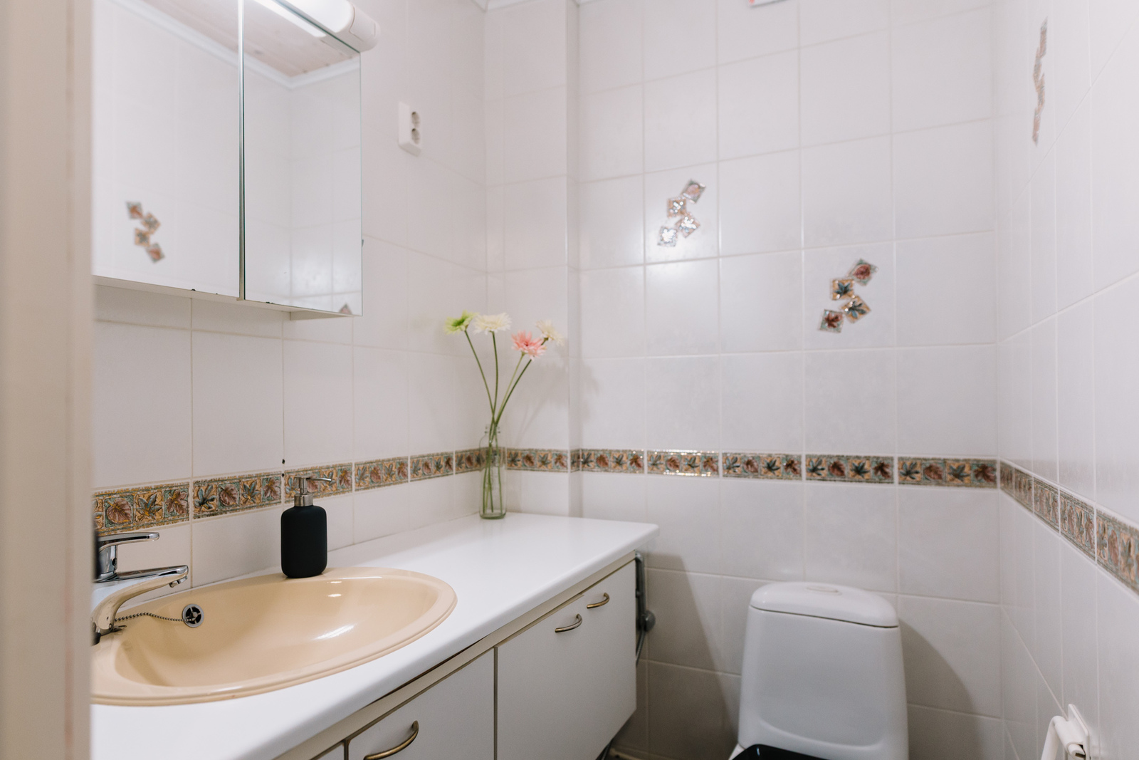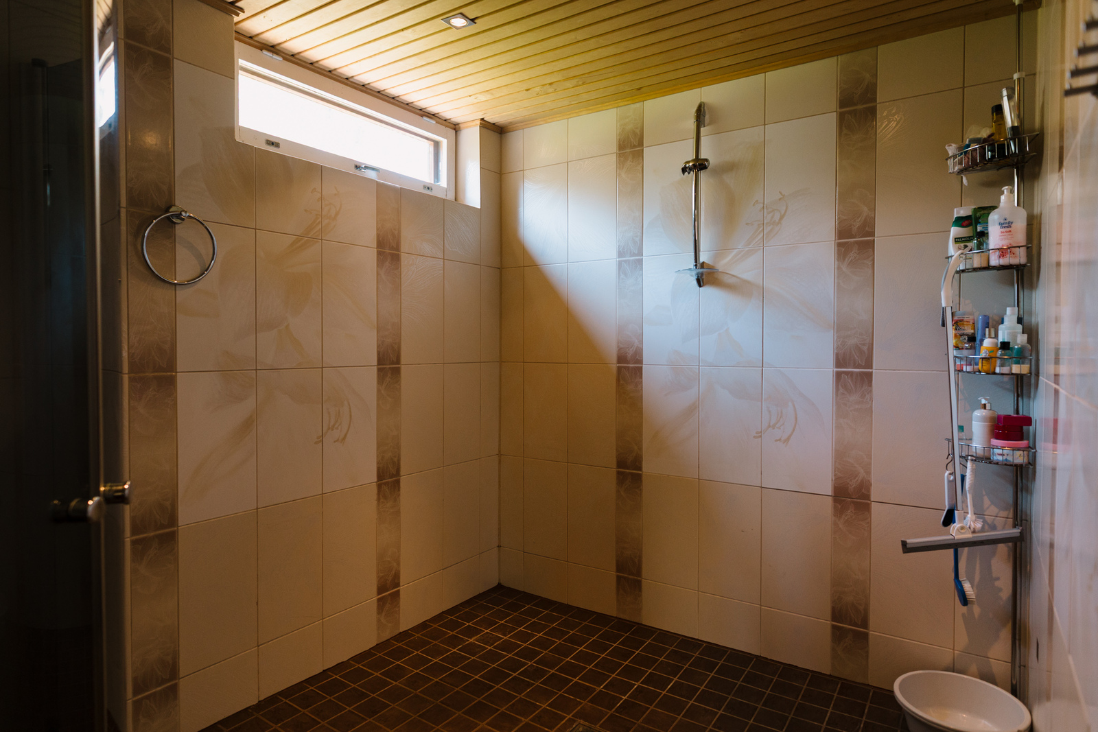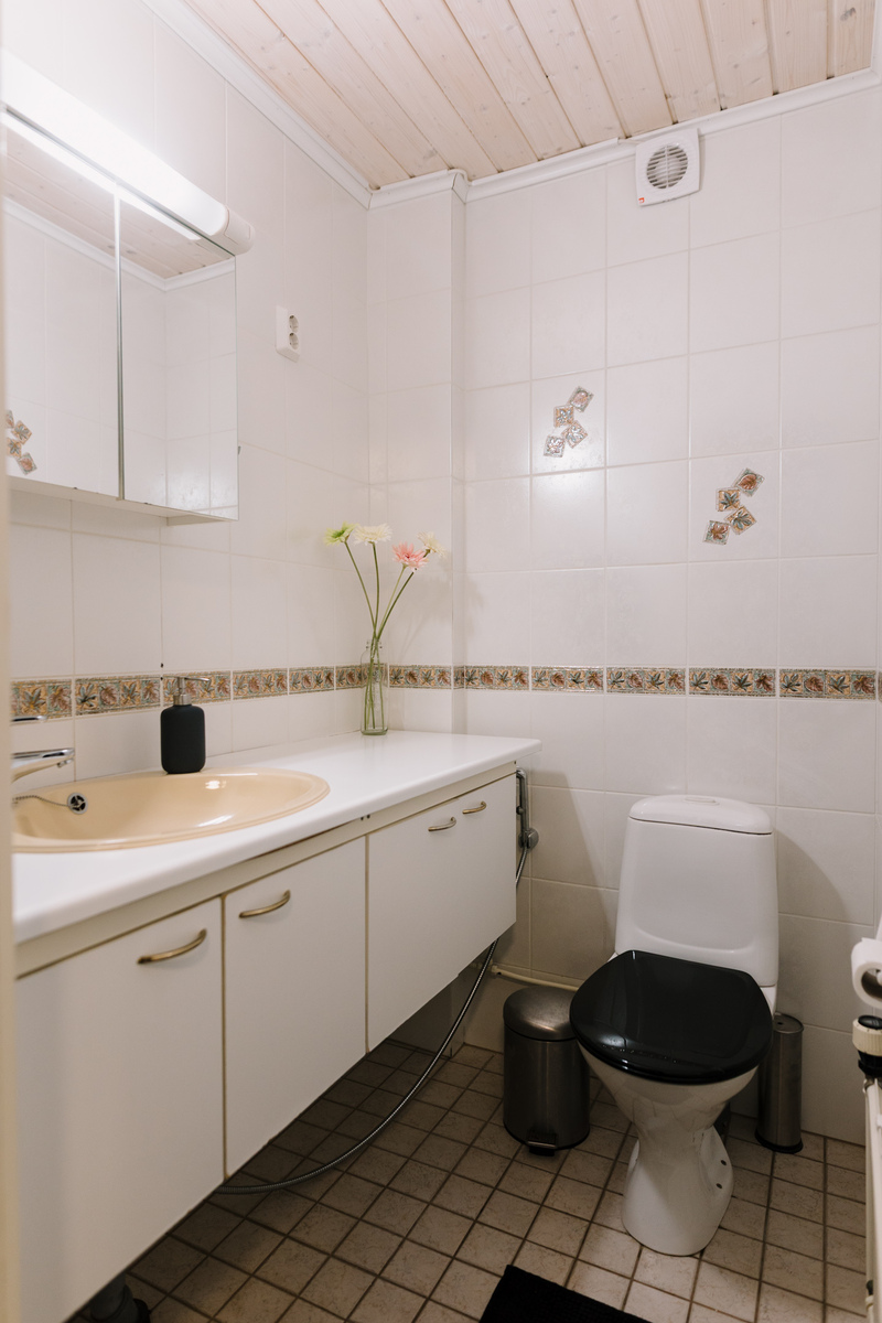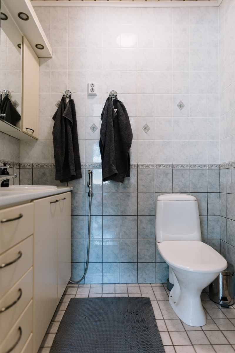 | Kylpyhuoneen kuvaus | Lattialämmitys, suihku ja asennettuja erikoisvarusteita, kiinteät valaisimet, seinät (kaakeli), lattiat (laatta) |