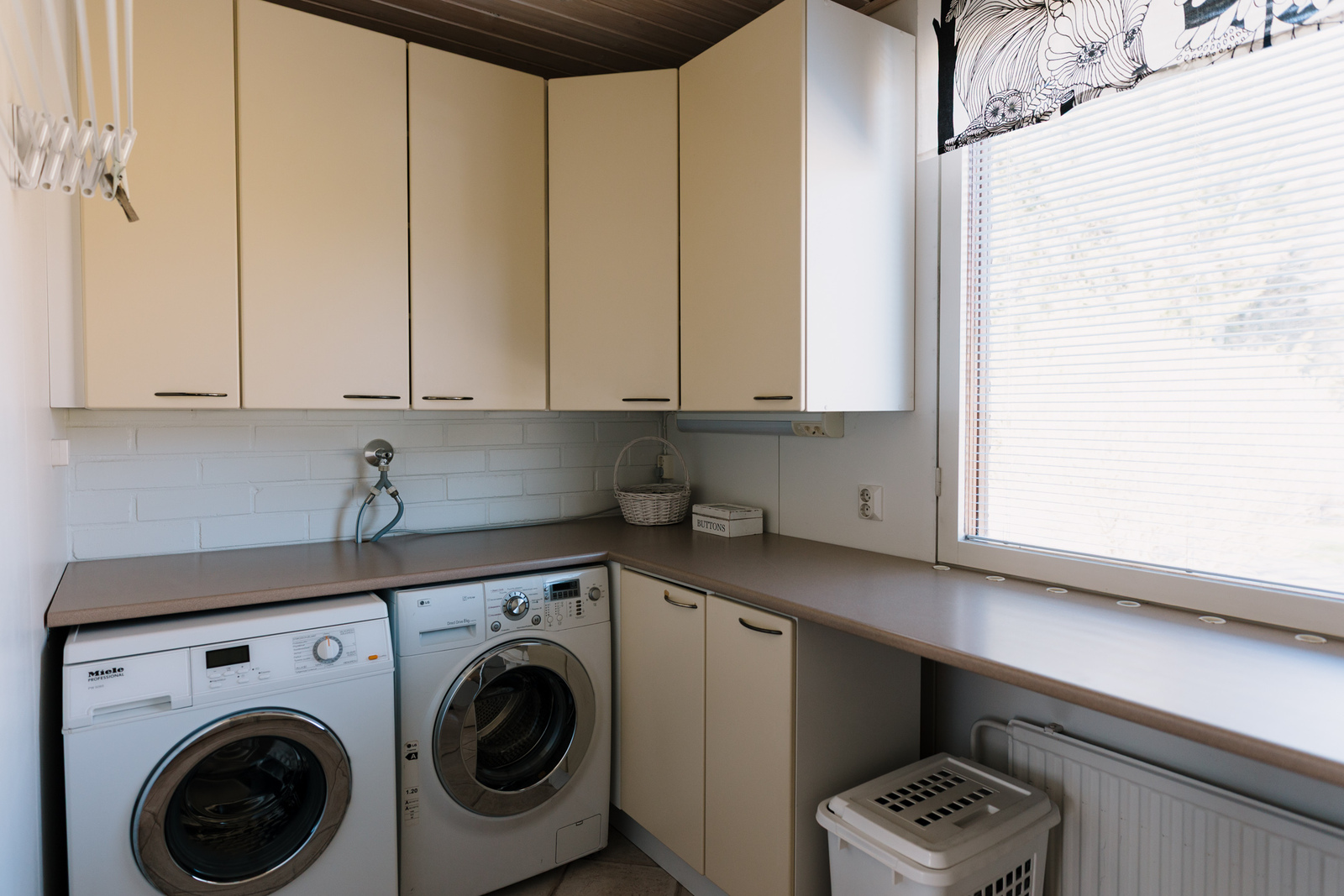 | Kodinhoitohuoneen kuvaus | Pöytätaso, lattialämmitys ja pesukoneliitäntä, lattiat (kivi), seinät (maali) |