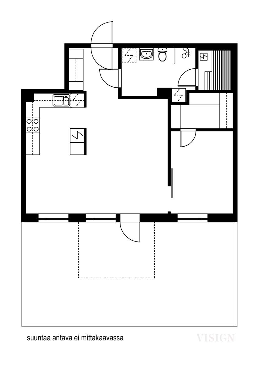 | Olohuoneen kuvaus | Seinät (maali), lattiat (parketti), Mahdollisuuksien olohuone, jossa useampi paikkavaihtoehto ruokapöydälle ja sohvalle. Iso asunnon levyinen terassialue viihtyisänä olohuoneen jatkeena. |