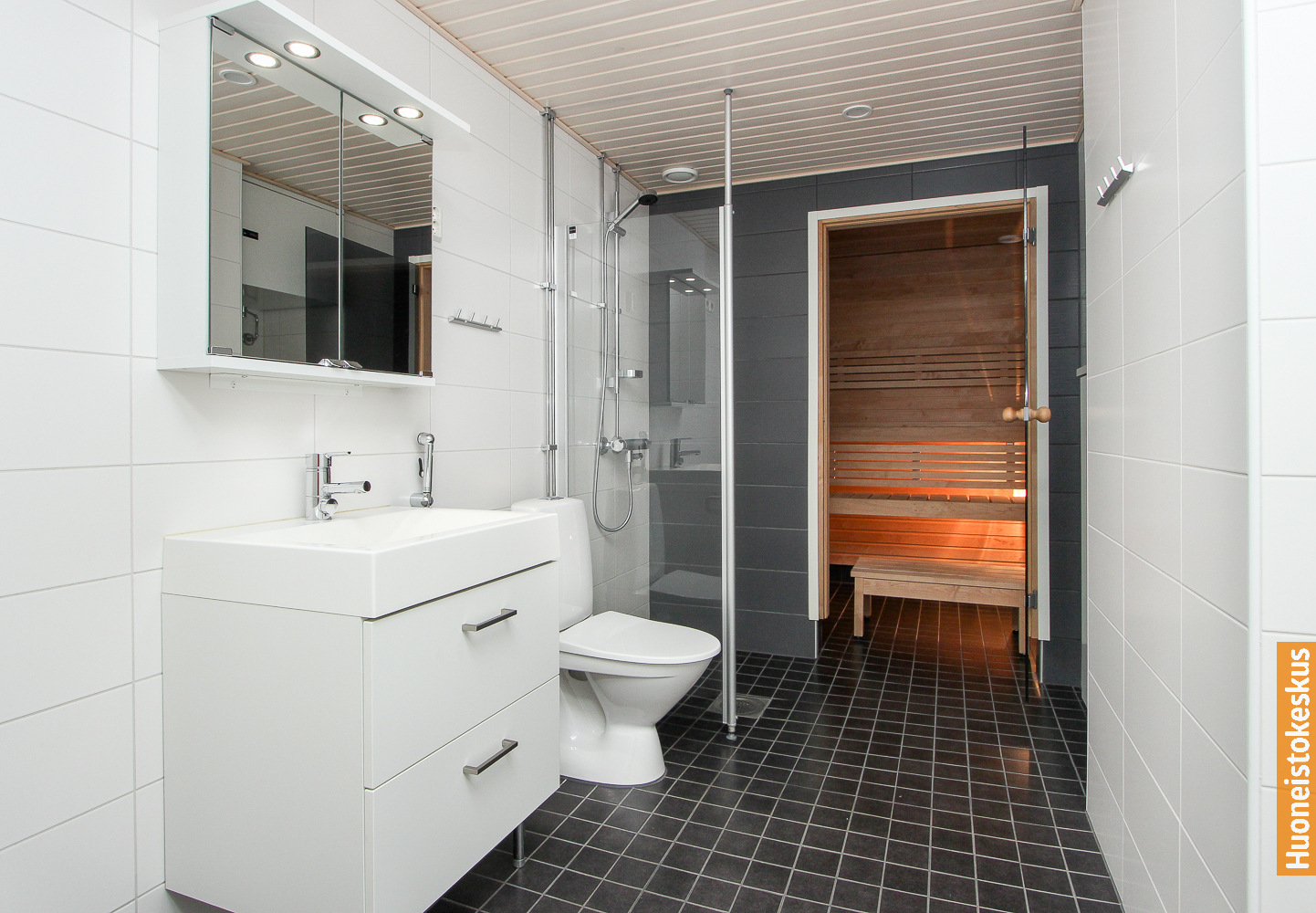 | Kylpyhuoneen kuvaus | Lattialämmitys, suihkuseinä, wc-istuin, peilikaappi ja pesukoneliitäntä, seinät (kaakeli), lattiat (laatta), Tilava kylpyhuone, jossa paikka pesutornille. |