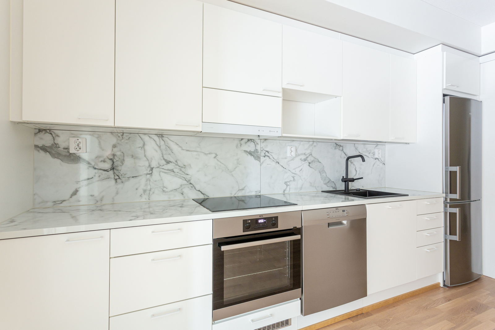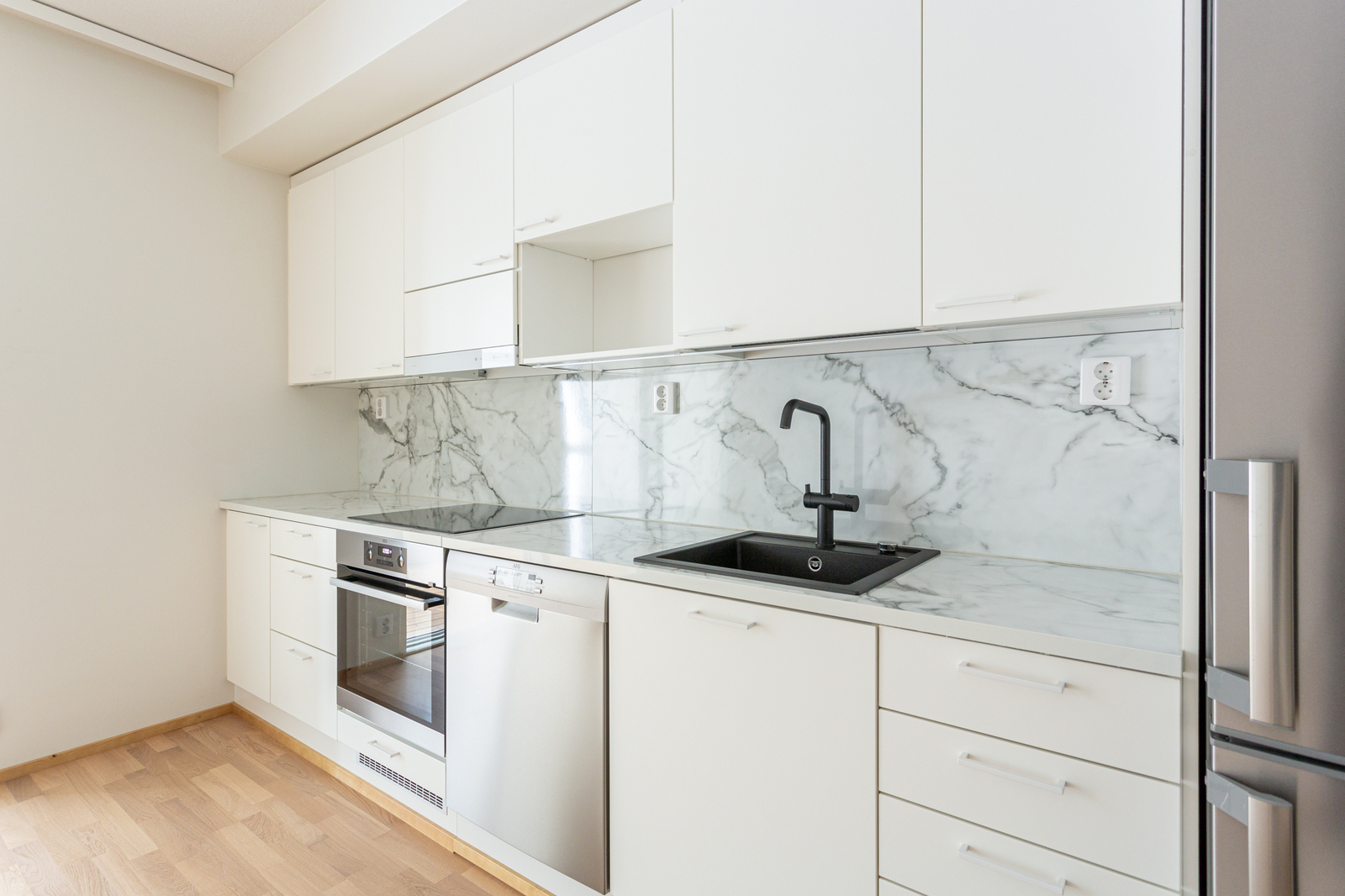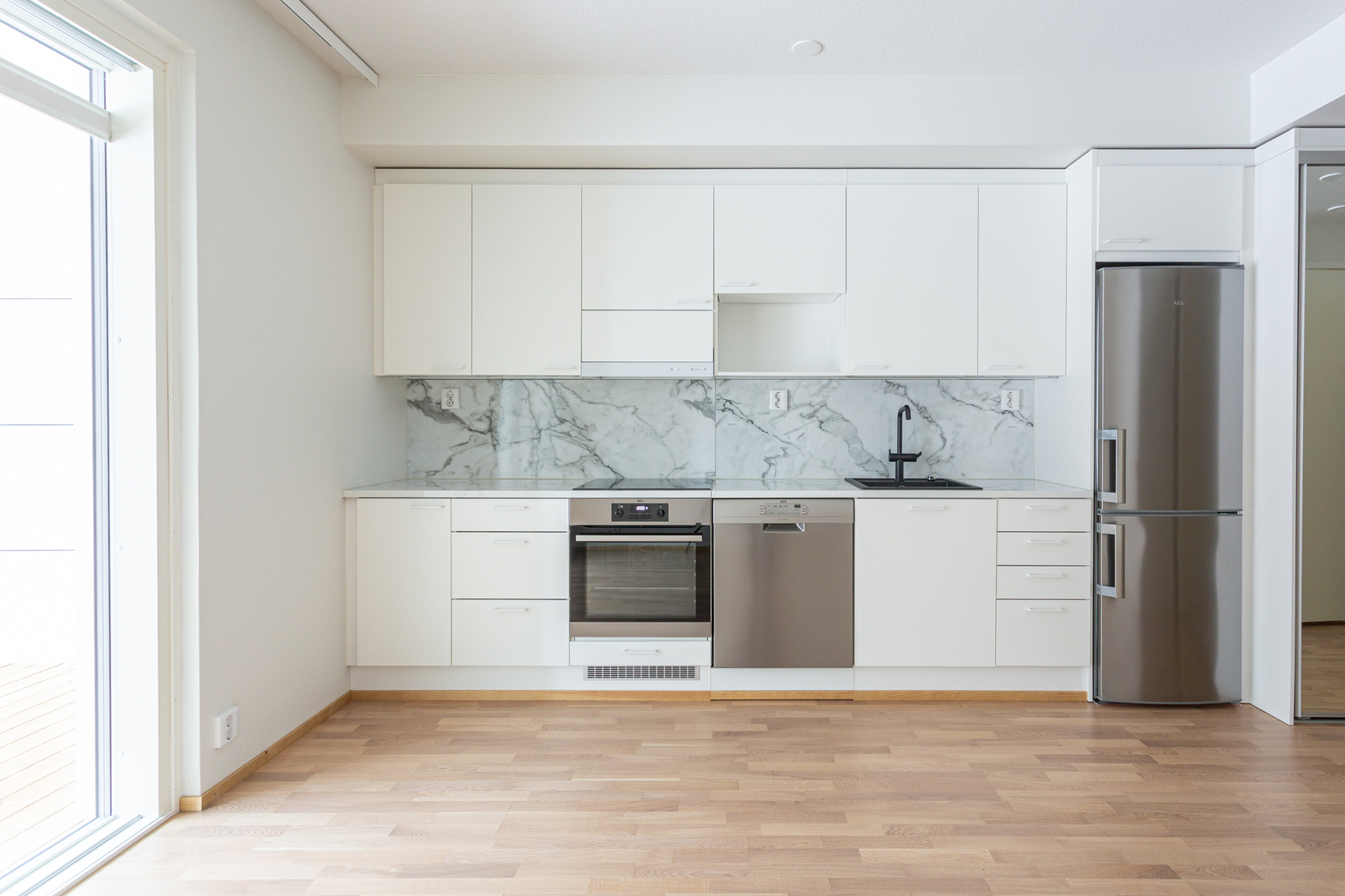 Ajanmukainen uudenveroinen tyylikäs keittotila kodinkoneineen täyttää vaativankin asukkaan toiveet.