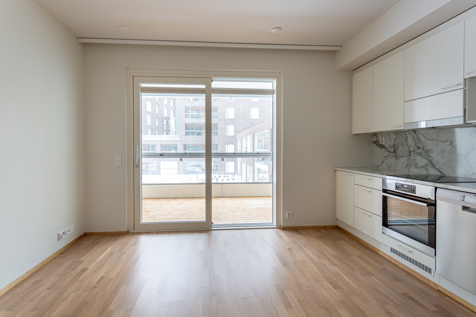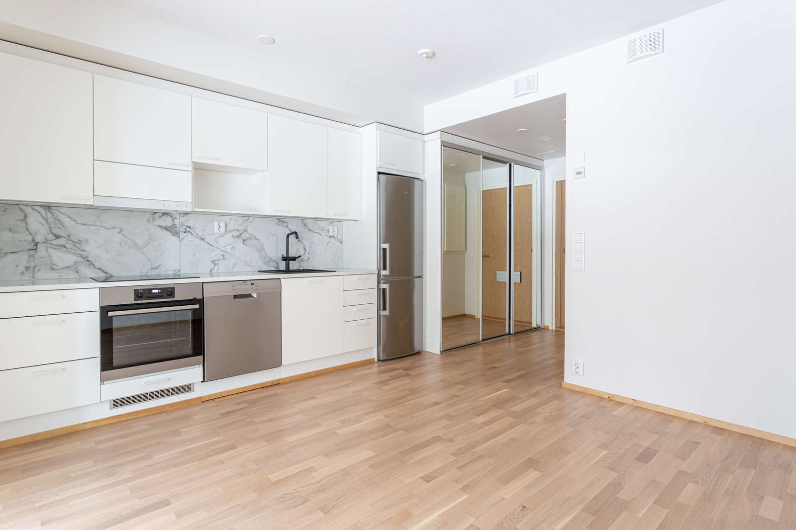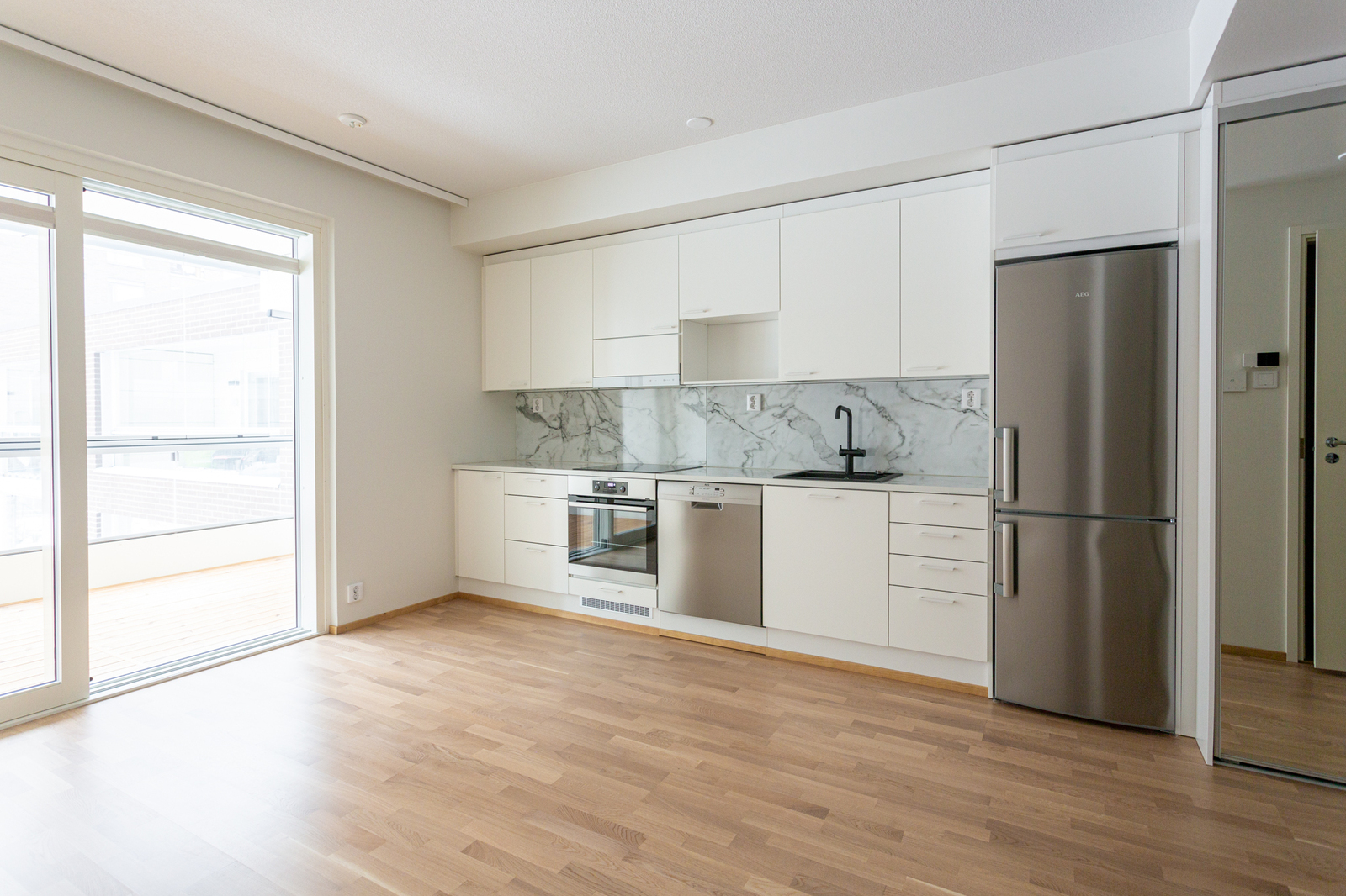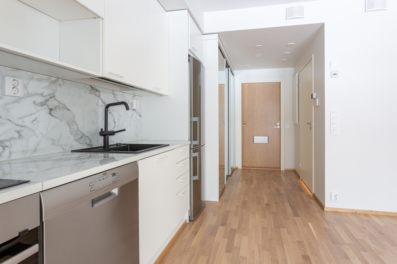 Ajanmukainen uudenveroinen tyylikäs keittotila kodinkoneineen täyttää vaativankin asukkaan toiveet.