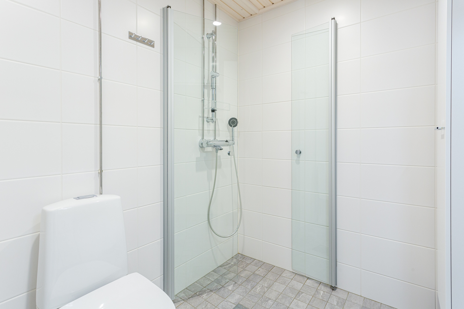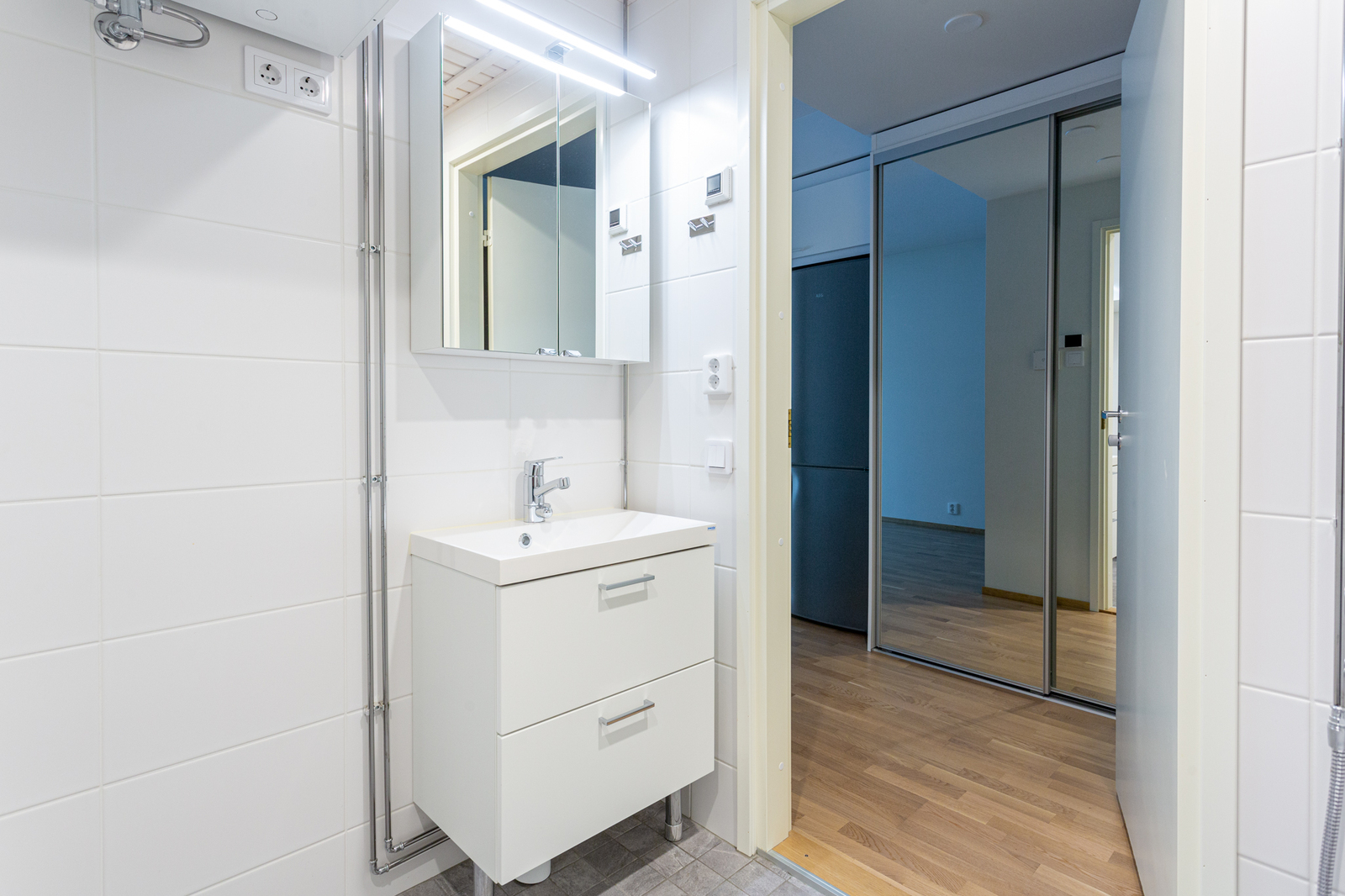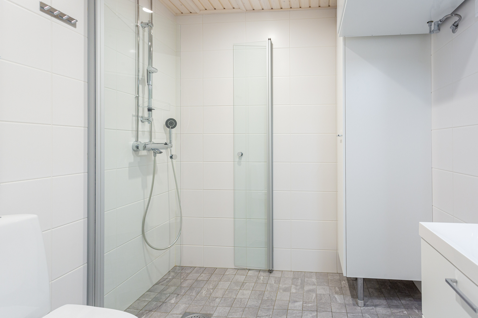 | Kylpyhuoneen kuvaus | Allaskaappi, wc-istuin, pesukoneliitäntä, suihkuseinä, peilikaappi, suihku ja kiinteät valaisimet, seinät (kaakeli), lattiat (laatta) |