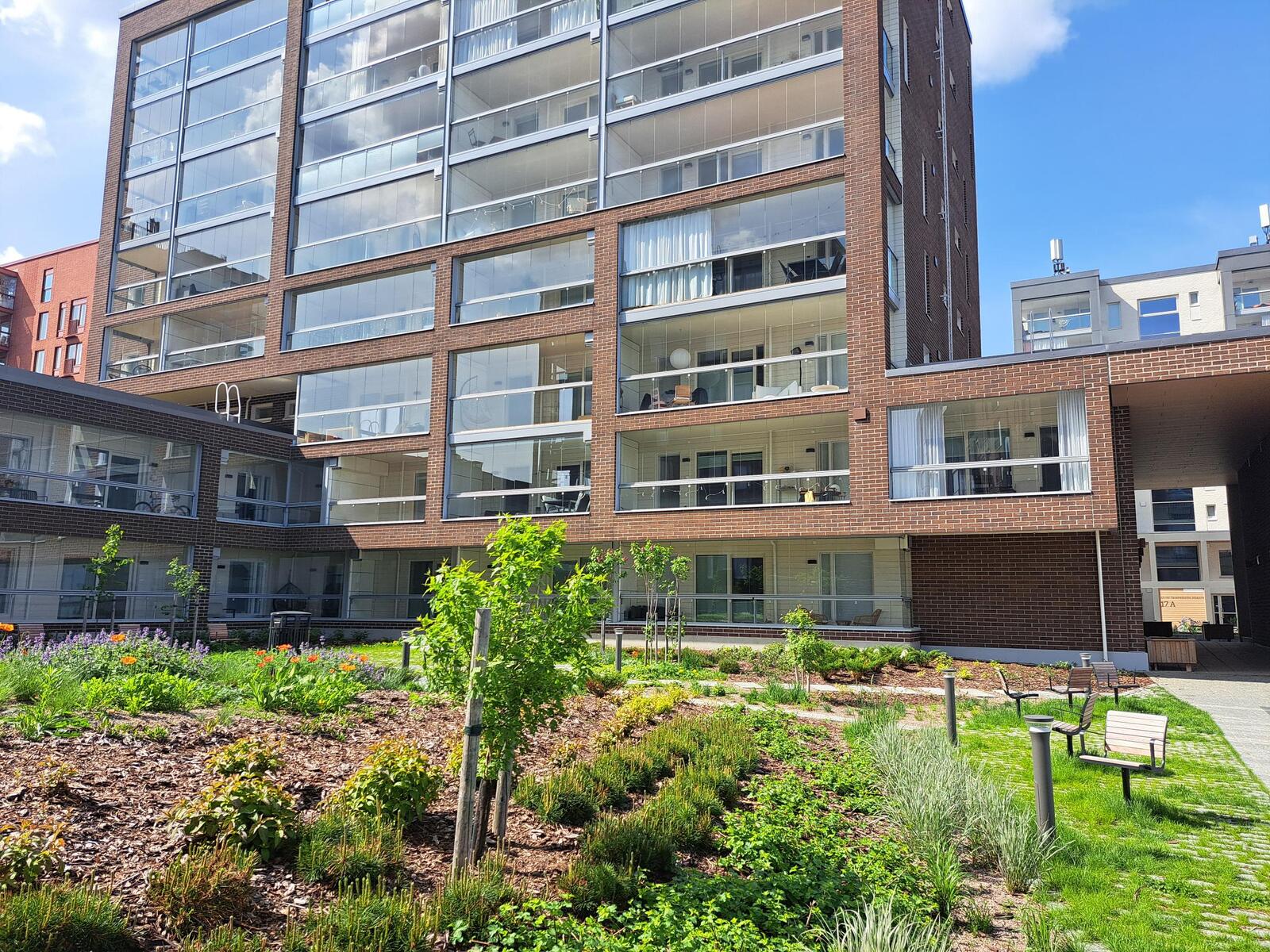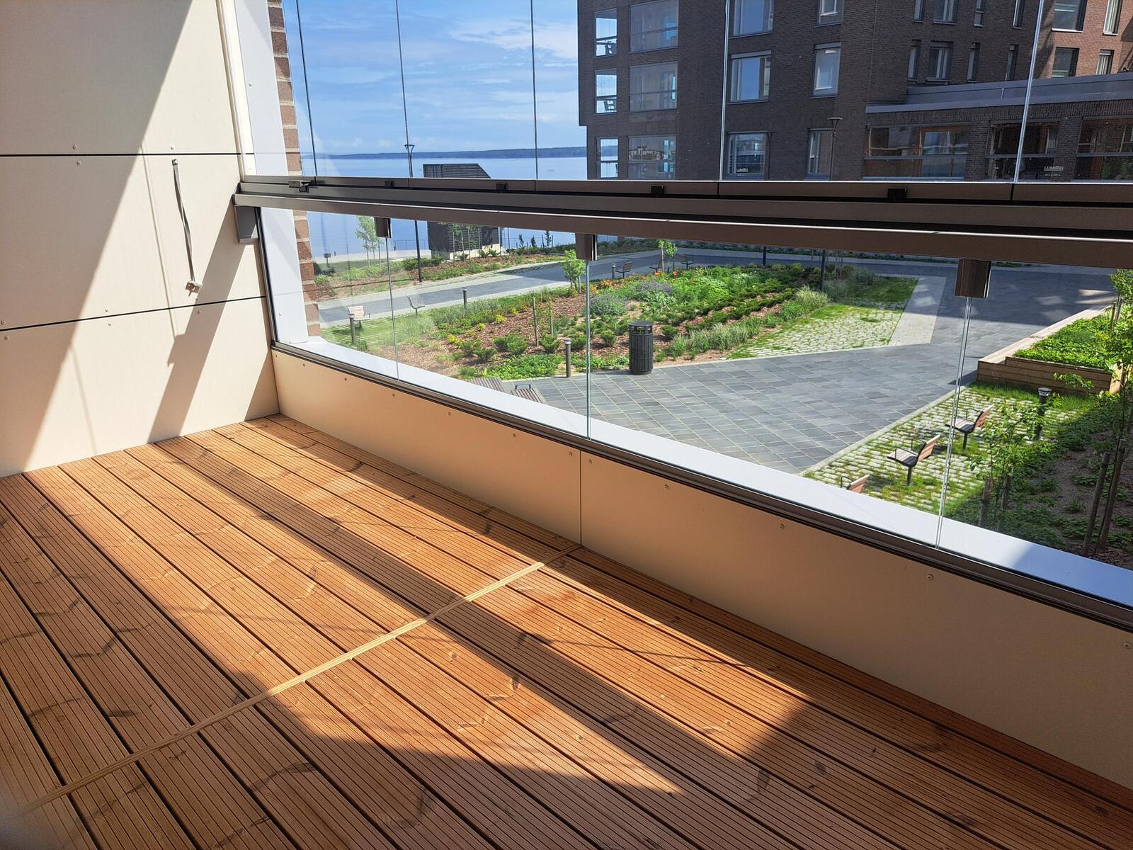 Asunnon isolta lasitetulta parvekkeelta, kauniiden pihaistutusten ylitse näkyy Näsijärvi ja aluehan on todella muutoinkin viehättävä niin asumiseen kuin ulkoiluunkin.