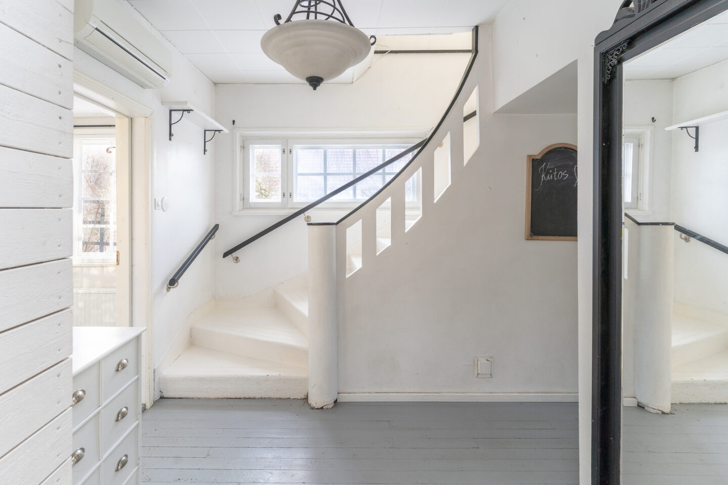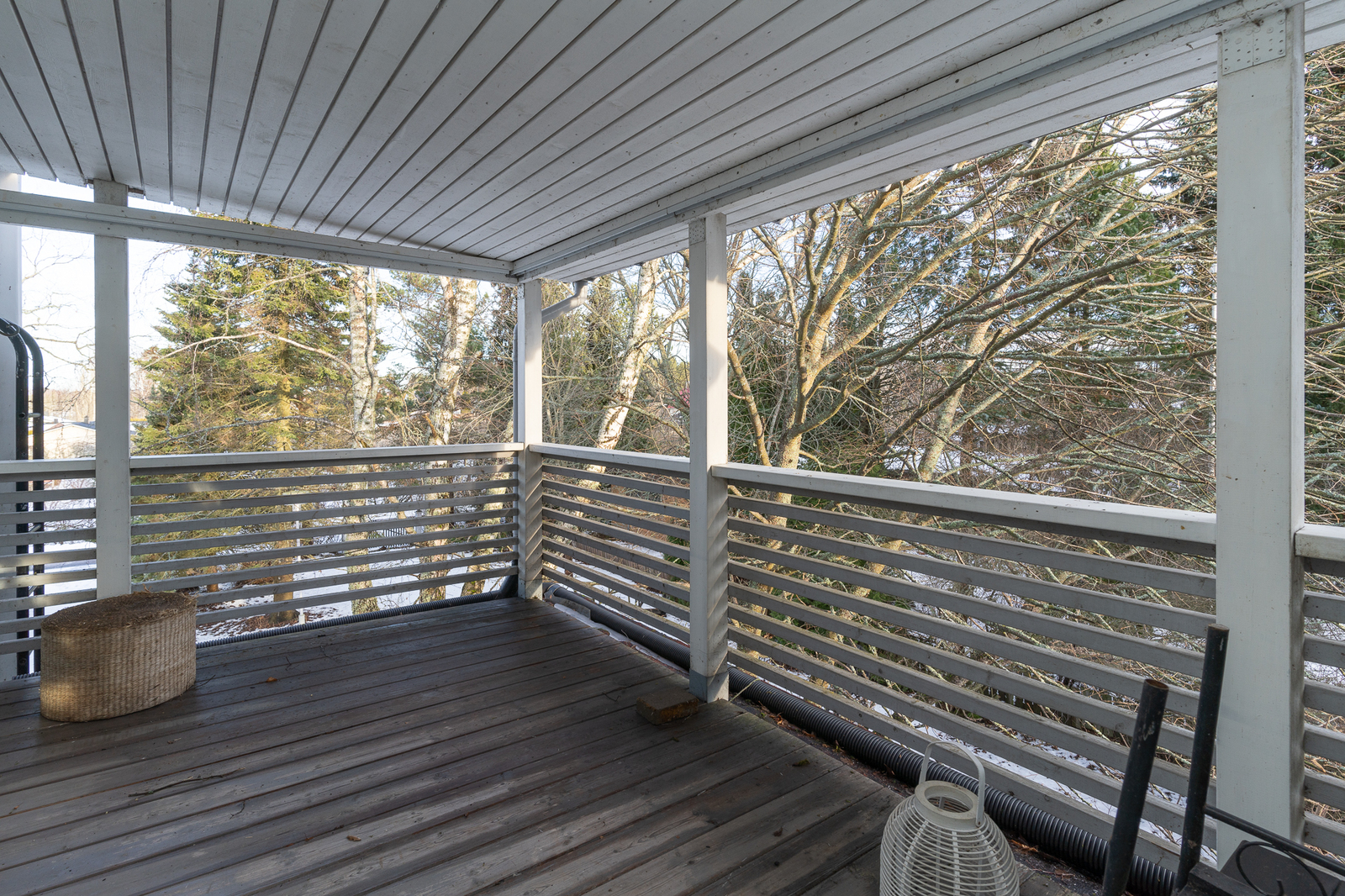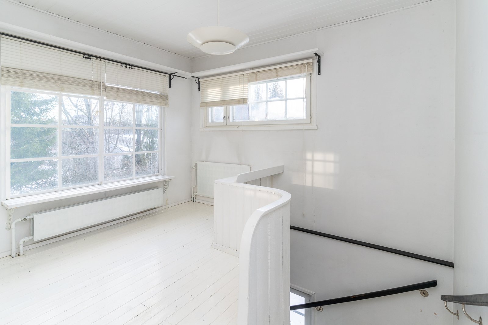 | Tilojen kuvaus | Kirjastossa lattia Saima- parkettia, seinät Ensolevy-paneelia. Pieni Jotul-valurautatakka. Eteisessä lattia lautaa, seinät maalatut. Kellaritilassa lattia maalattua betonia, seinät tiiltä ja maalattu. Suihku/Tassuamme. Pk-liitäntä. Nikkariverstas ja työtila. Yläkerran aulassa lattia lautaa, seinät maalatut, ovi katetulle terassille. |