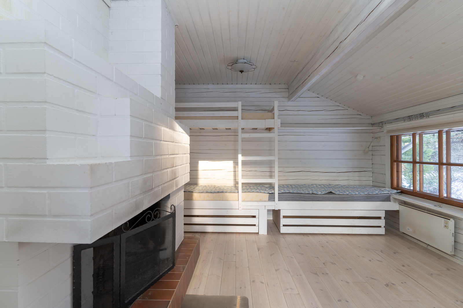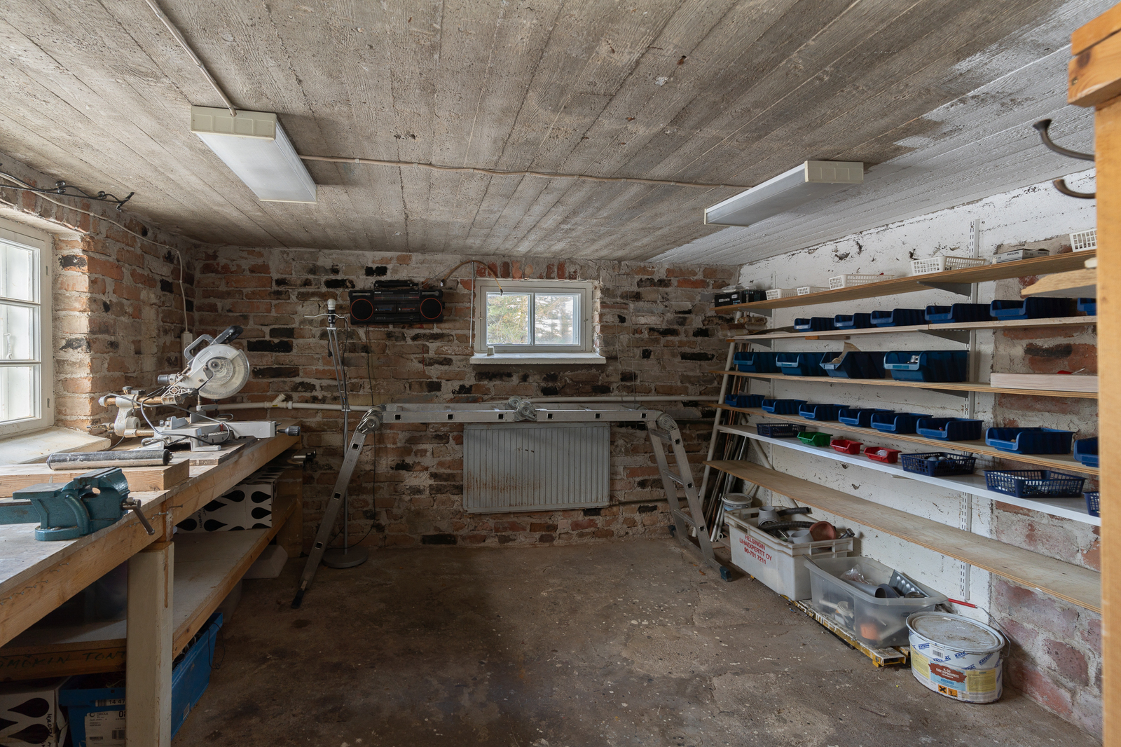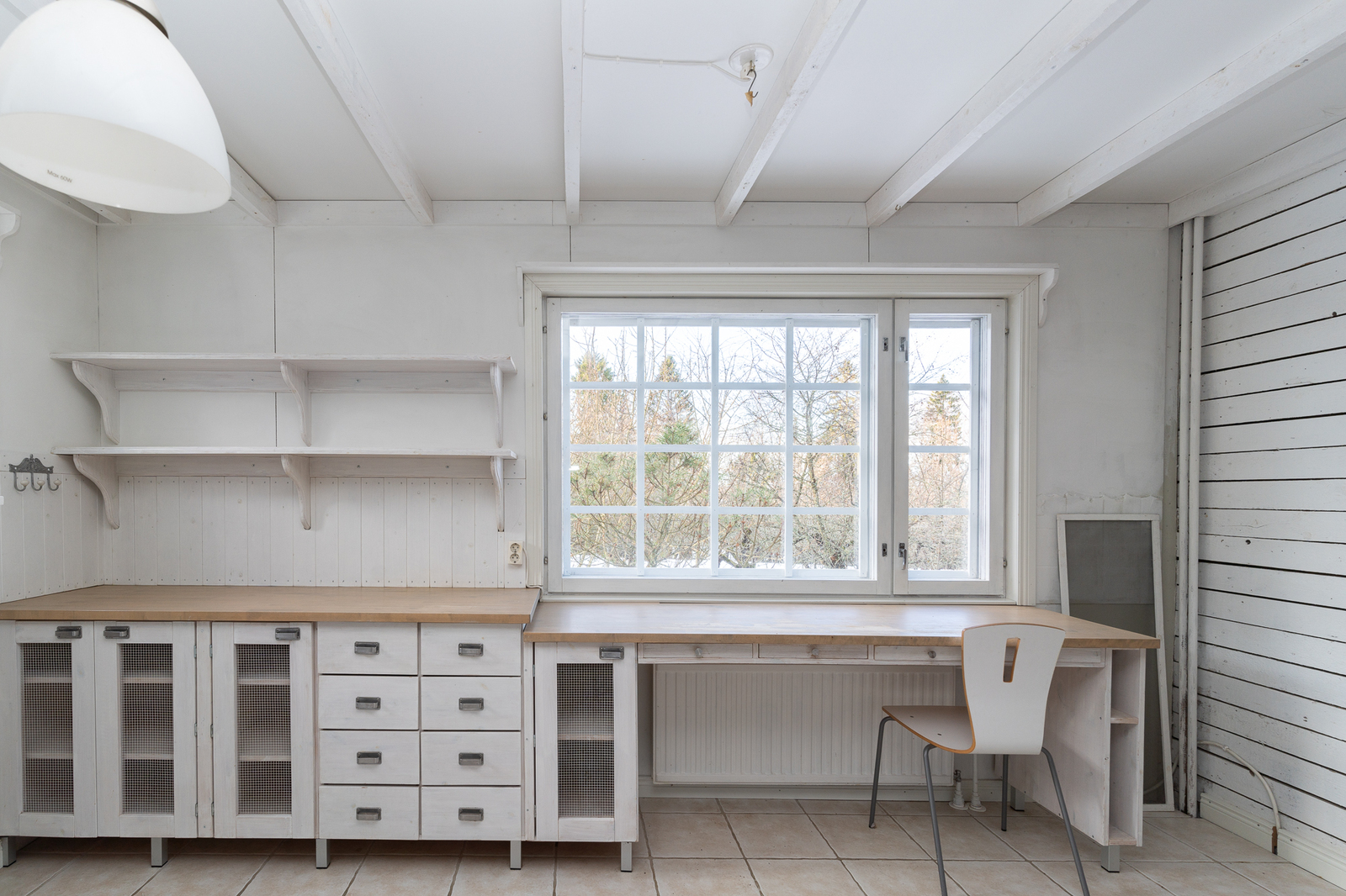 | Muut huoneet ja tilat | Kirjastossa lattia Saima- parkettia, seinät Ensolevy-paneelia. Pieni Jotul-valurautatakka. Eteisessä lattia lautaa, seinät maalatut. Kellaritilassa lattia maalattua betonia, seinät tiiltä ja maalattu. Suihku/Tassuamme. Pk-liitäntä. Nikkariverstas ja työtila. Yläkerran aulassa lattia lautaa, seinät maalatut, ovi katetulle terassille. |