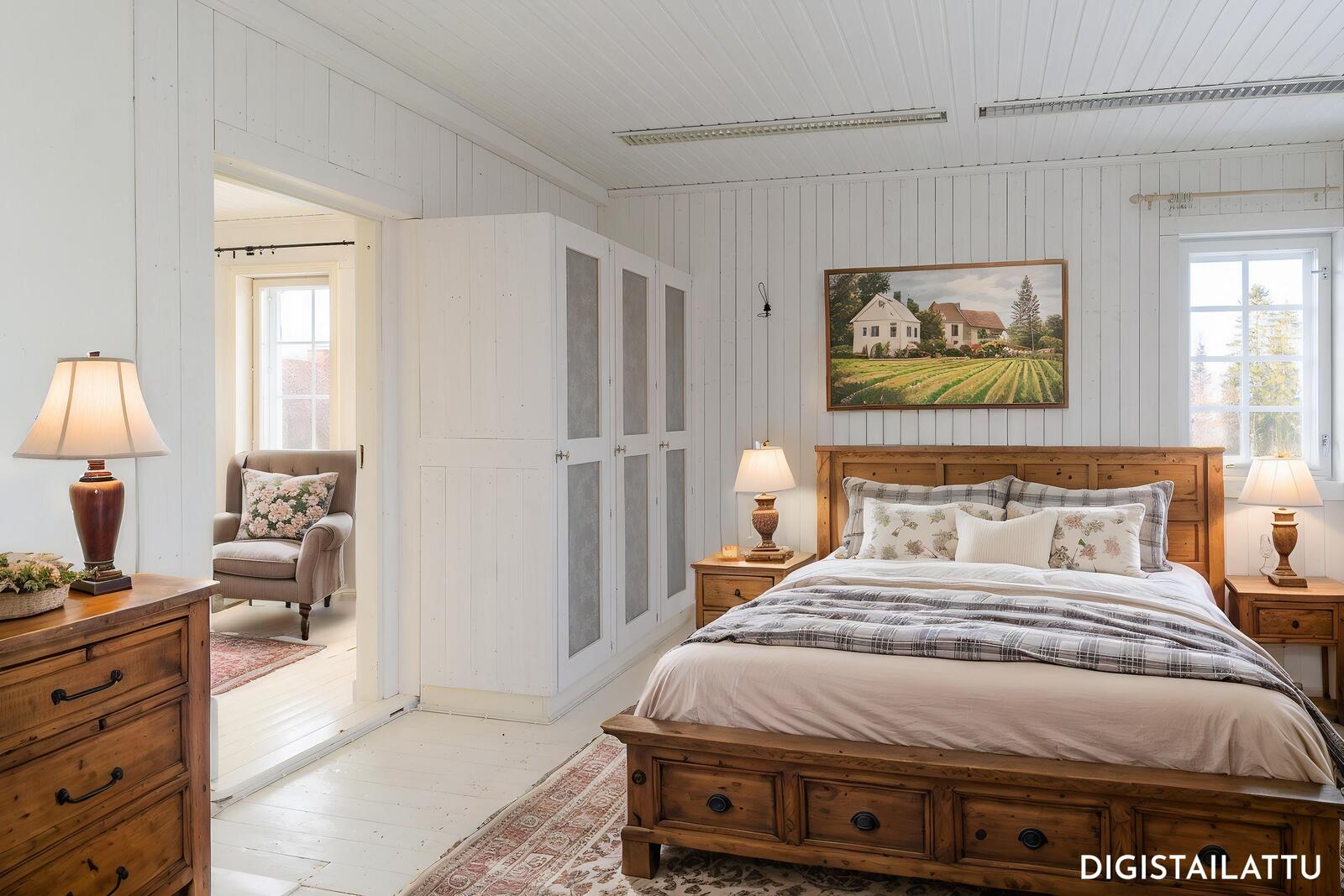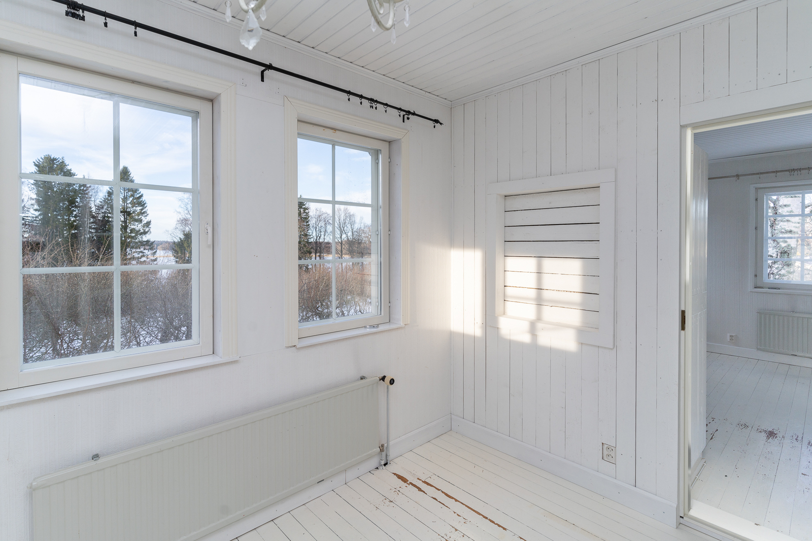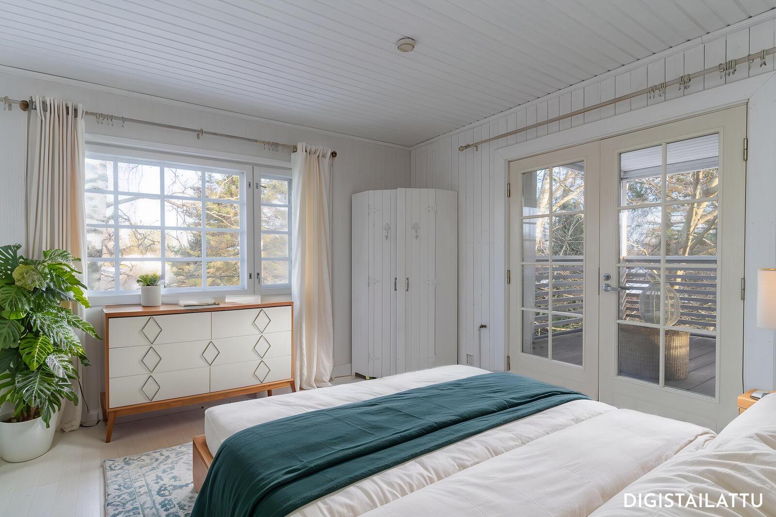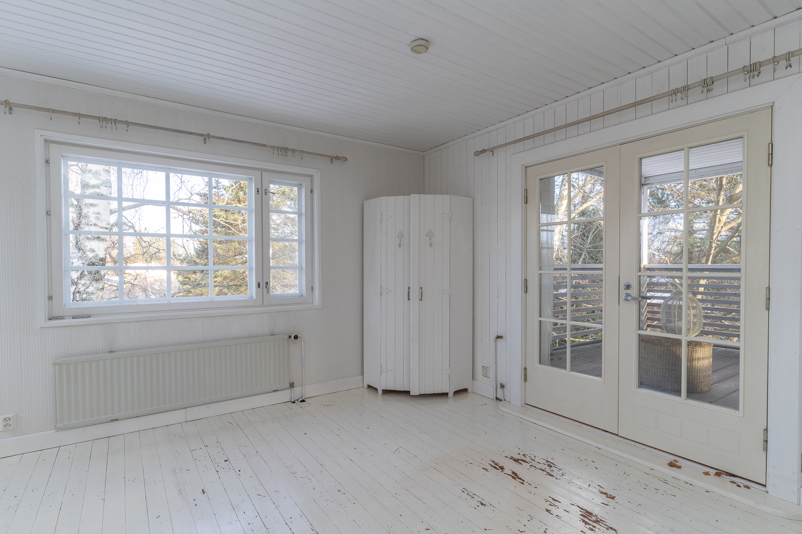 | Makuuhuoneen kuvaus | Lukumäärä: 2, Yläkerran makuuhuoneissa lattia lautaa, seinät maalattua ja tapettia. Kaapistot. Toisesta makuuhuoneesta pariovet katetulle terassille. |