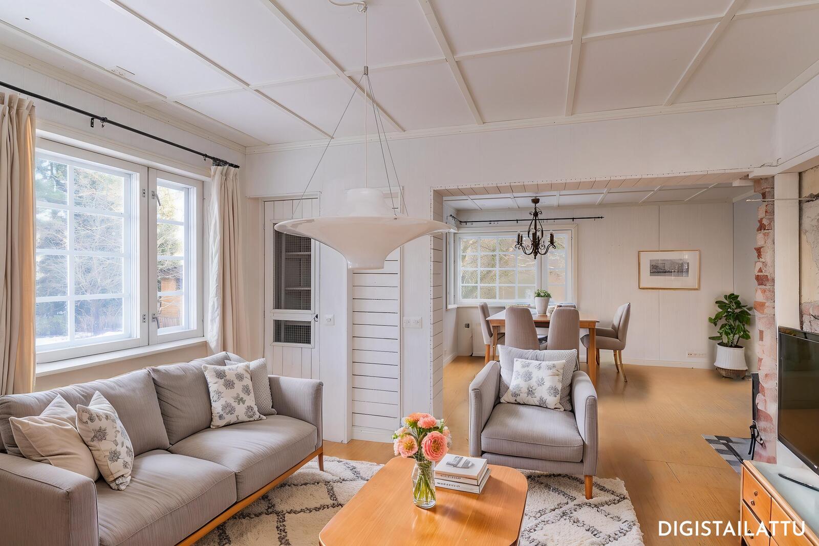 | Olohuoneen kuvaus | Olohuoneessa lattia Saima-parkettia, seinät maalattu Ensolevy-paneelia. |