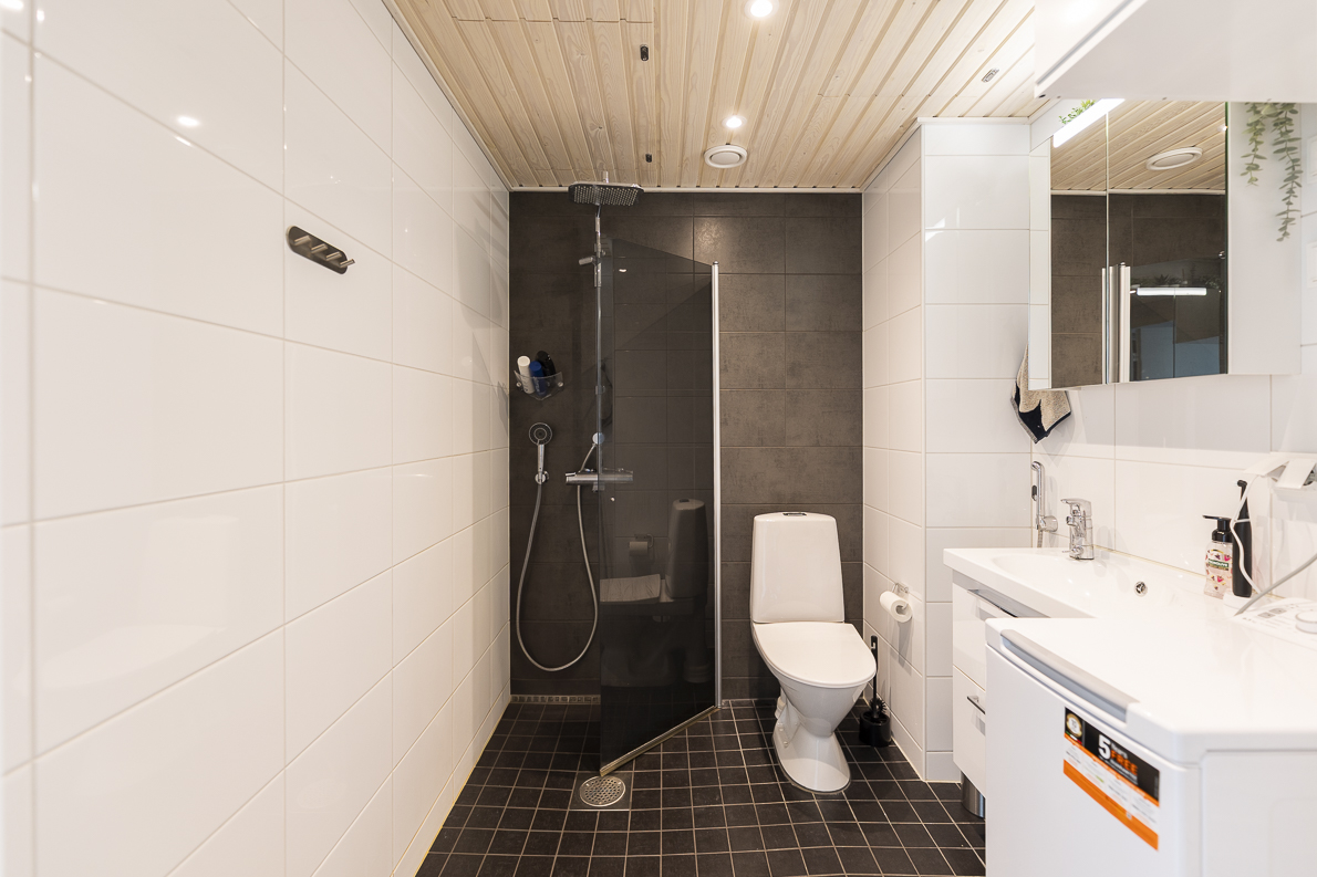| Kylpyhuoneen kuvaus | WC-istuin, suihku, suihkuseinä, pesukoneliitäntä ja peilikaappi, seinät (kaakeli), lattiat (laatta) |