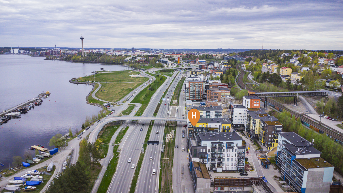 Liikenneyhteydet ovat erinomaiset: raitiovaunu- ja bussipysäkit sijaitsevat kävelyetäisyydellä, ja pyöräilyreitit kulkevat aivan vierestä. Lähimpään kauppaan kävelet muutamassa minuutissa, ja rantamaisemat houkuttelevat lenkkeilijää. Ratikkapysäkki on aivan naapurissa, joten kaupungin sykkeeseen pääset minuuteissa.