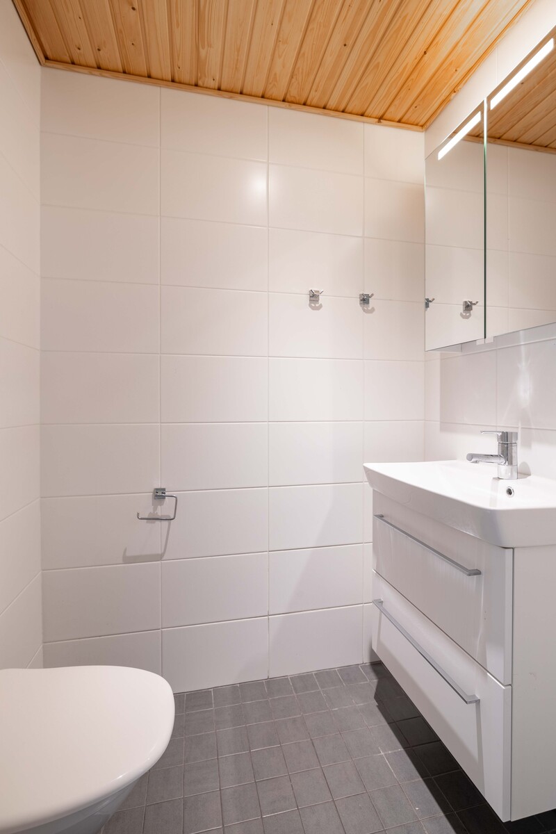 Lattialämmitys, peilikaappi, suihkuseinä, suihku, wc-istuin ja pesukoneliitäntä, seinät (kaakeli), lattiat (laatta) |