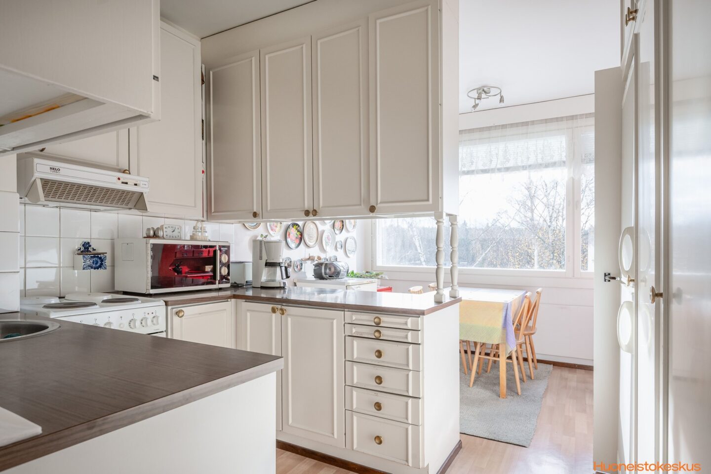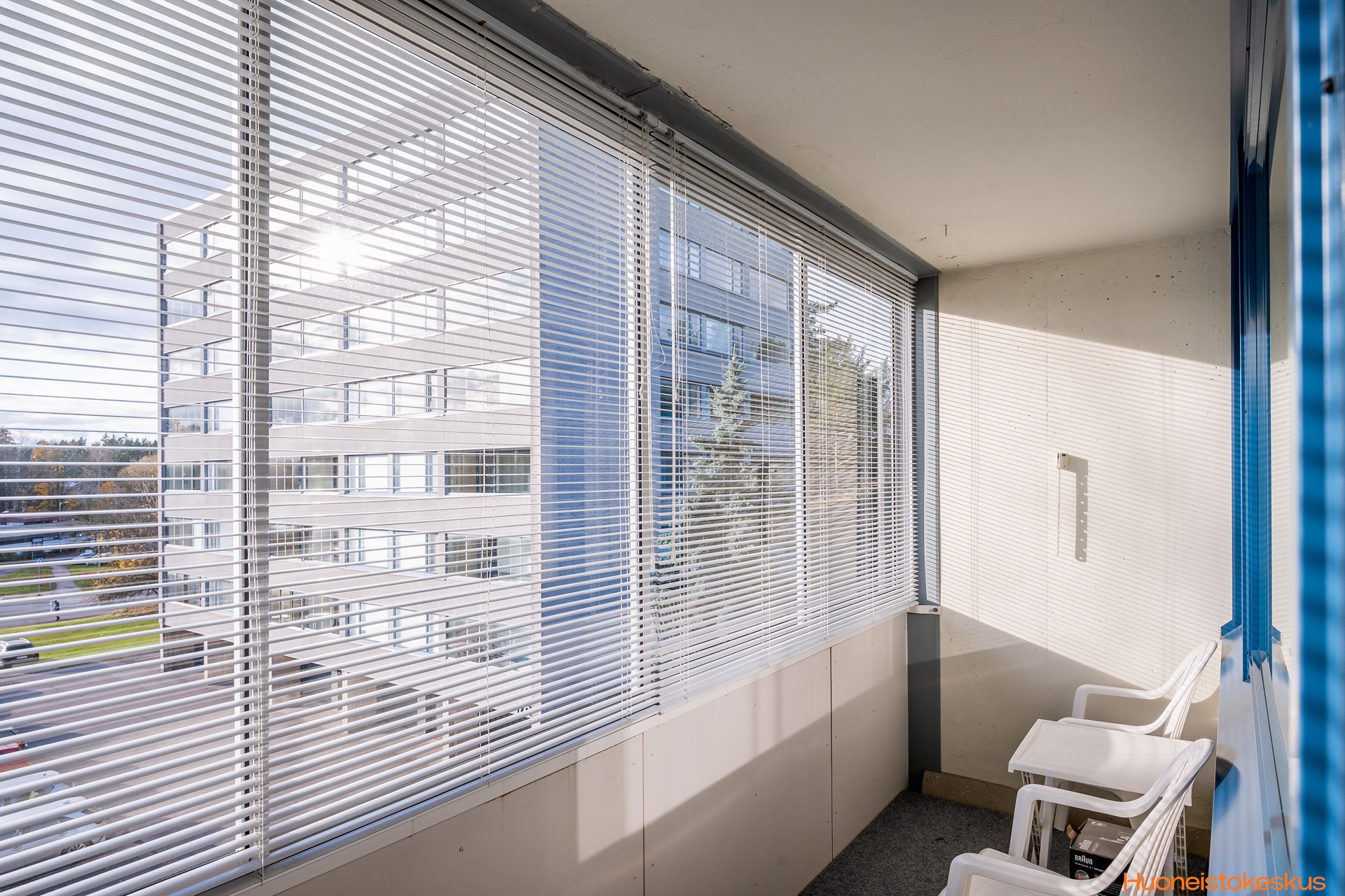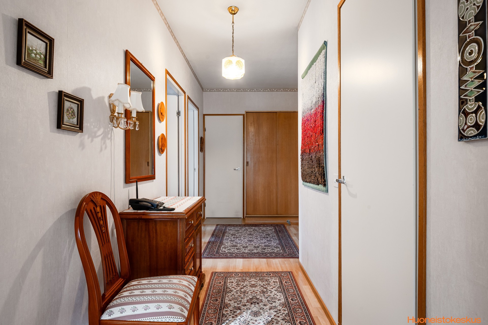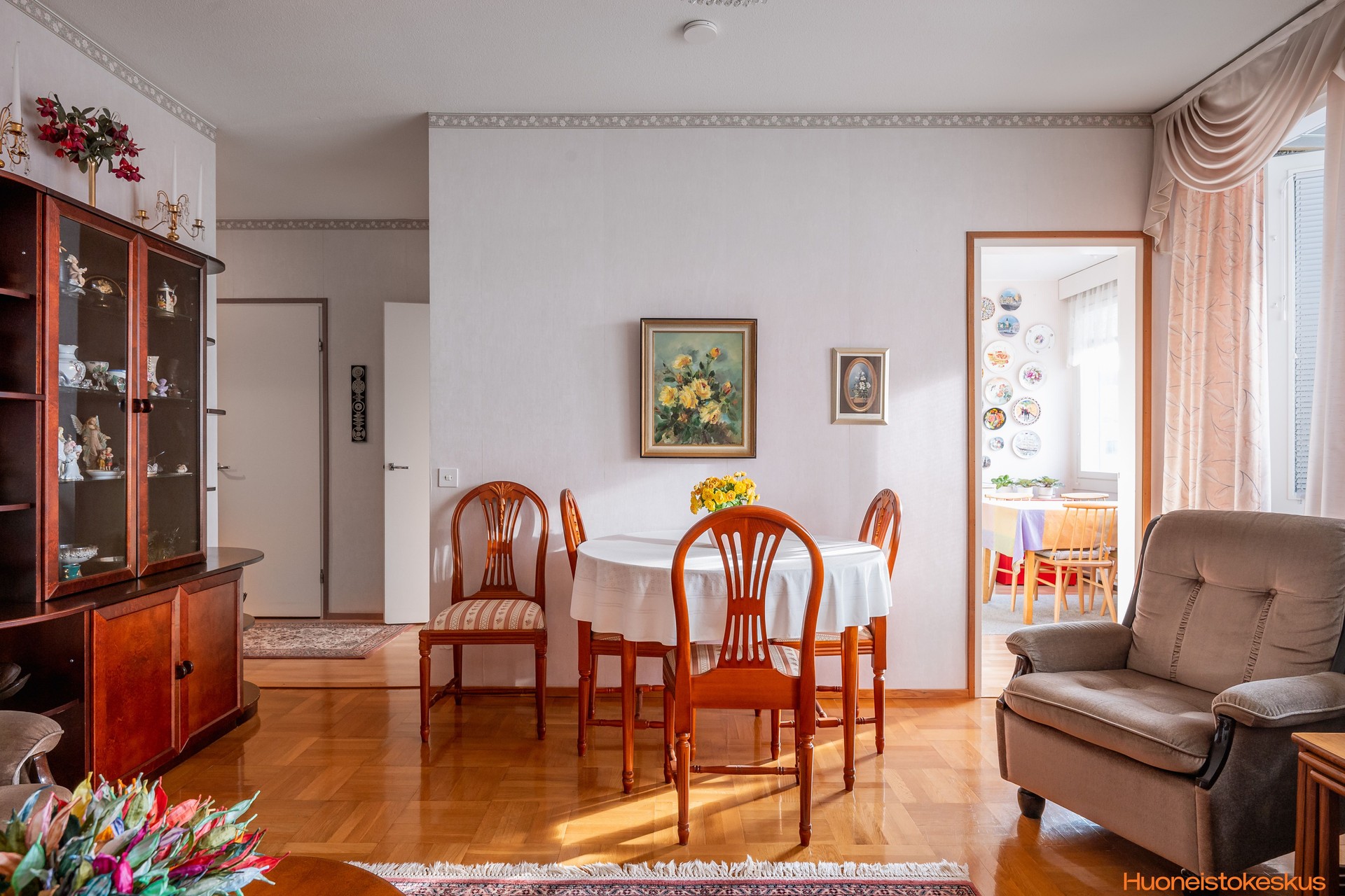 Pohja on toimiva, keittiö on tilava ja sinne sopii hyvin ruokapöytä. Olohuoneesta on käynti lasitetulle parvekkeelle, josta avarat näkymät ympäristöön. Kaksi makuuhuonetta, ikkunat rauhalliselle puolelle. Tilava kylpyhuone remontoitu putkiremontin yhdessä ja siellä myös wc-istuin, lisäksi asunnossa erillinen wc.