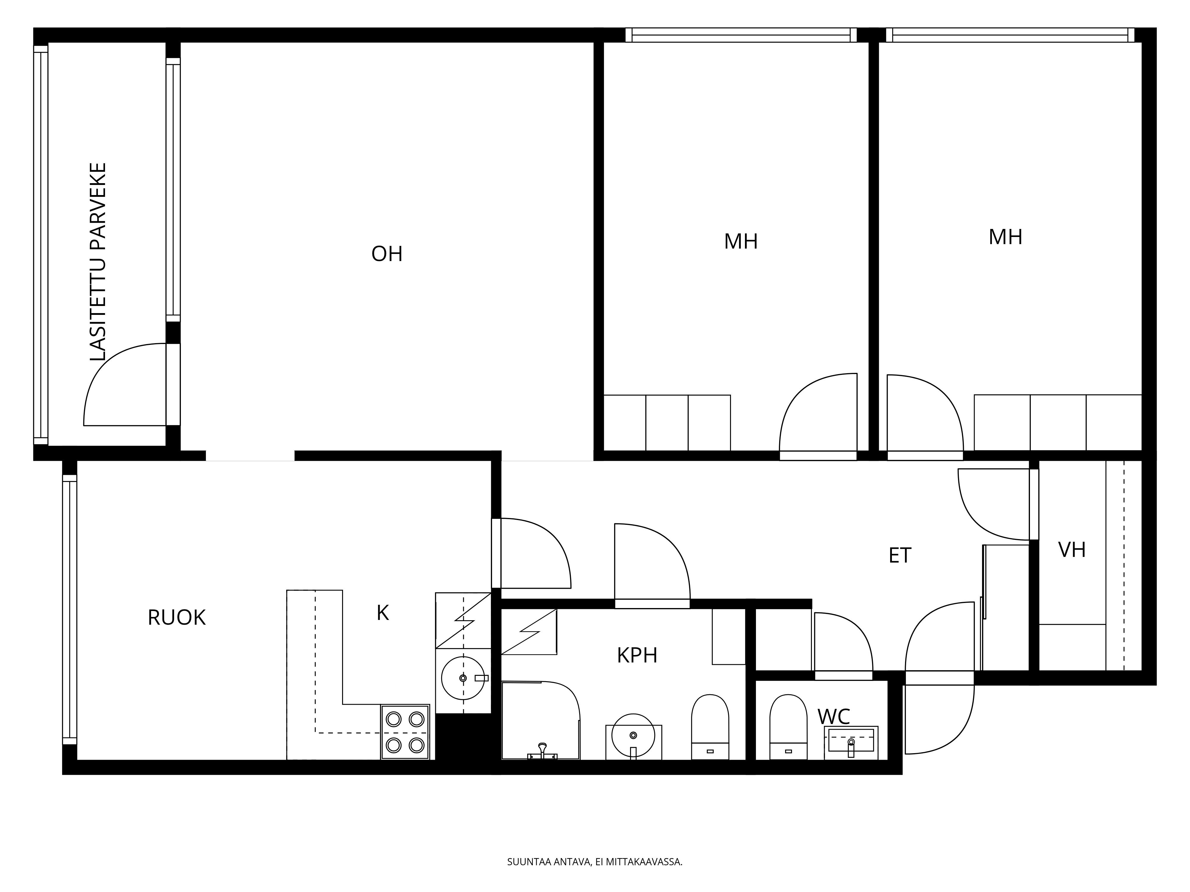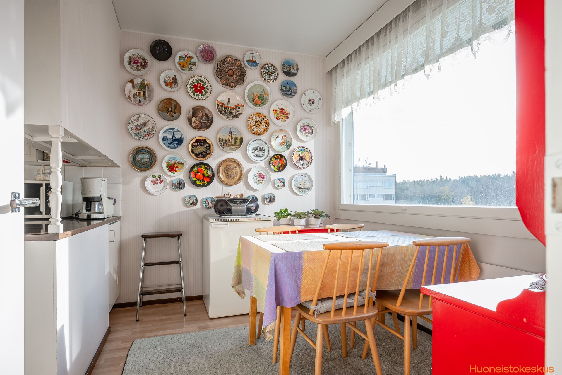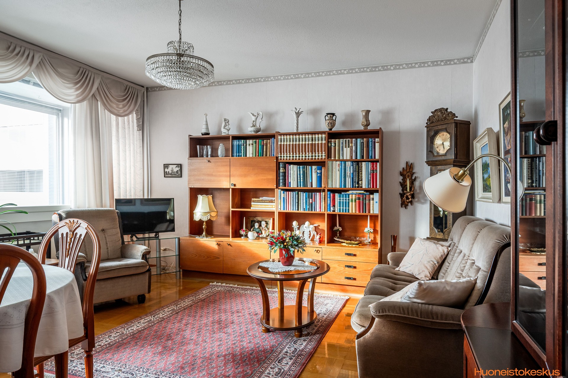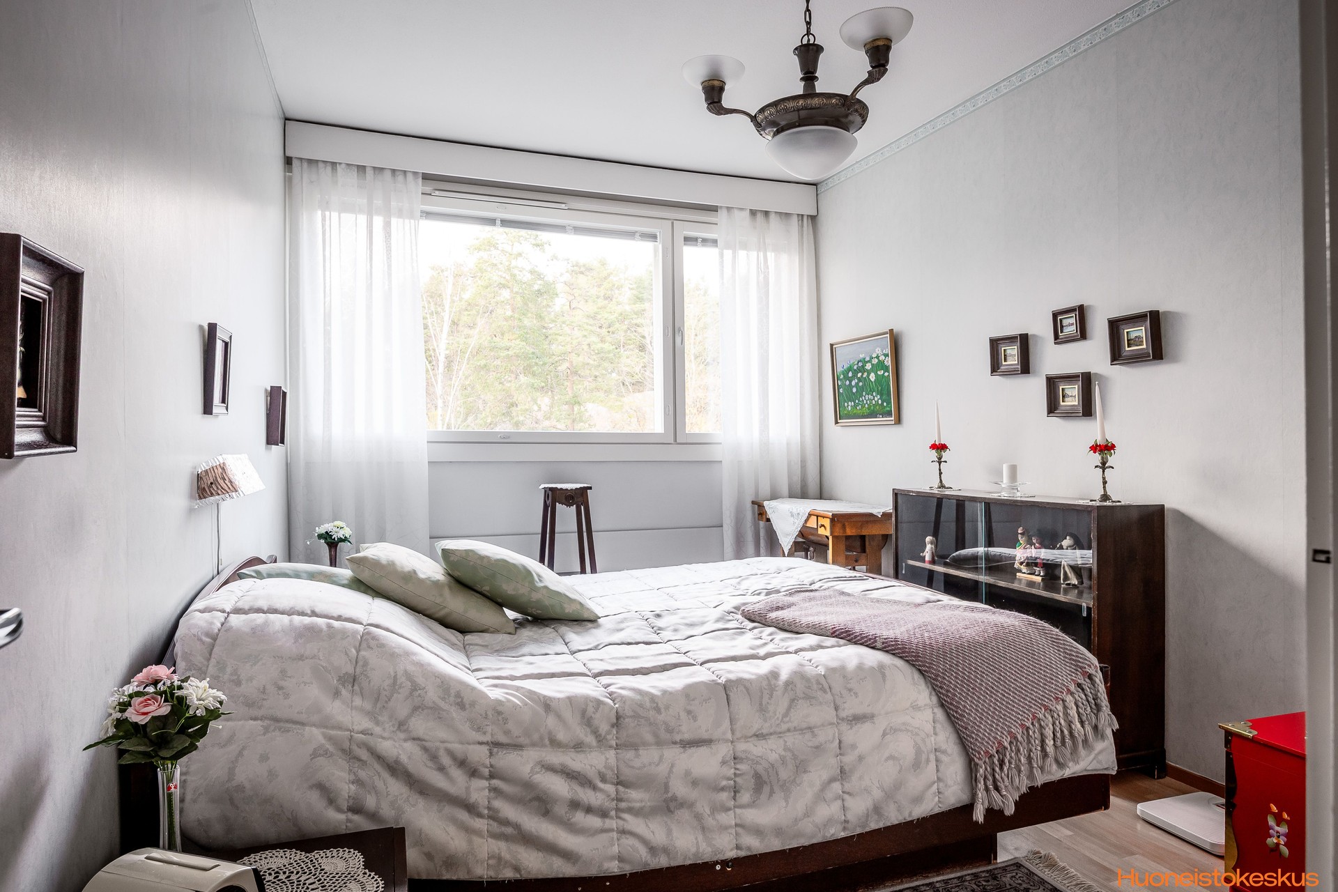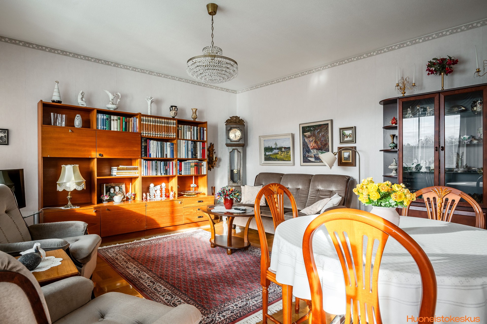 Pohja on toimiva, keittiö on tilava ja sinne sopii hyvin ruokapöytä. Olohuoneesta on käynti lasitetulle parvekkeelle, josta avarat näkymät ympäristöön. Kaksi makuuhuonetta, ikkunat rauhalliselle puolelle. Tilava kylpyhuone remontoitu putkiremontin yhdessä ja siellä myös wc-istuin, lisäksi asunnossa erillinen wc.