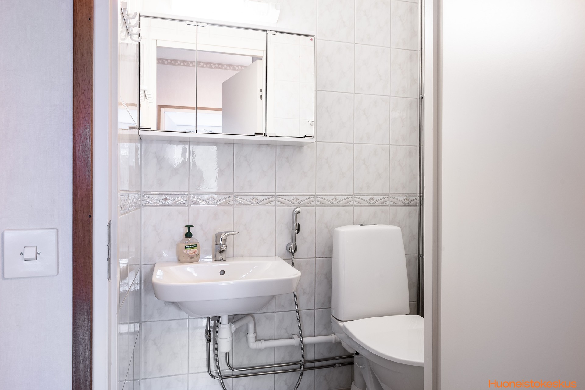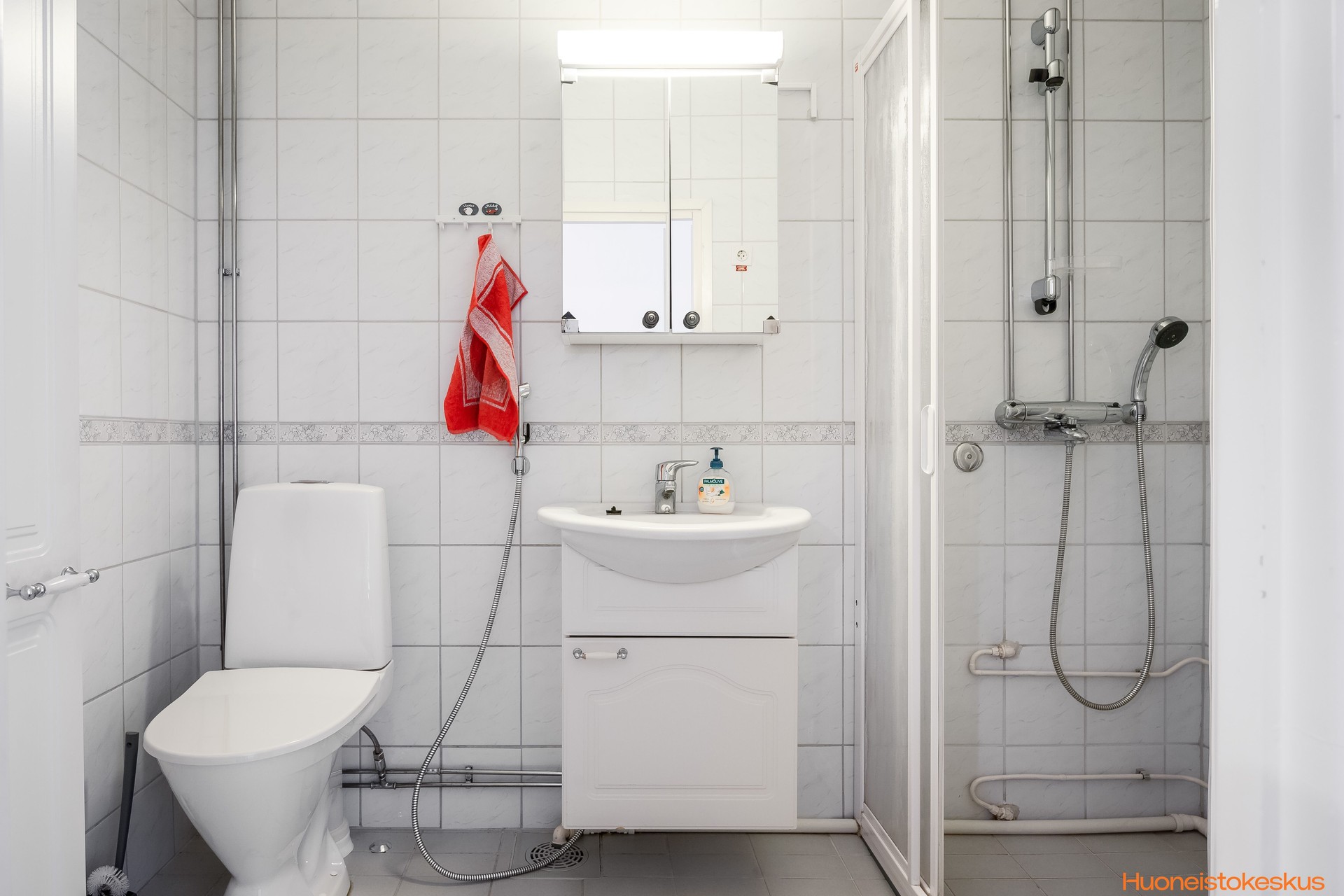| Kylpyhuoneen kuvaus | Suihku, suihkuseinä, pesukoneliitäntä, wc-istuin, peilikaappi, allaskaappi ja kylpyhuonekaapisto, seinät (kaakeli), lattiat (laatta) |