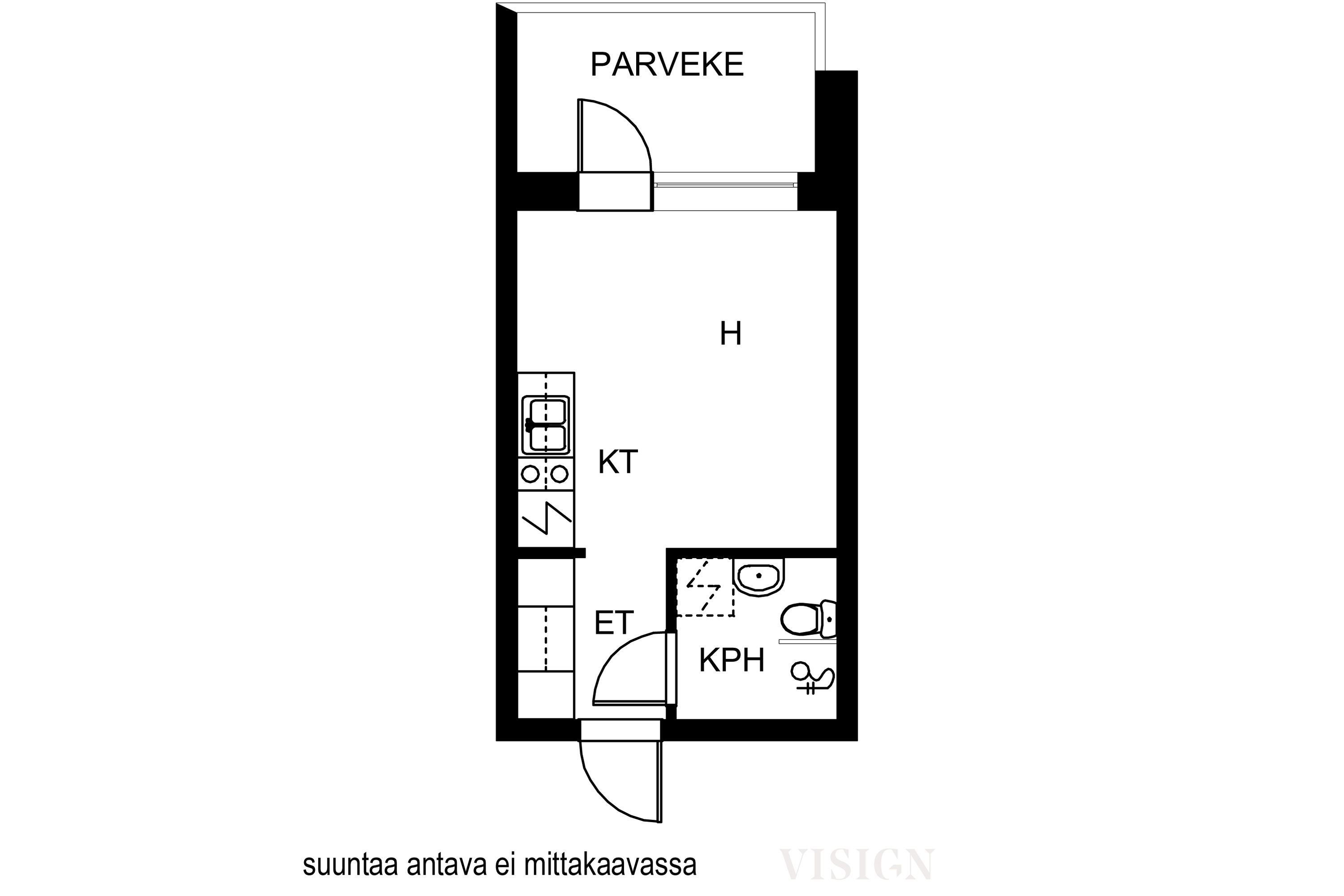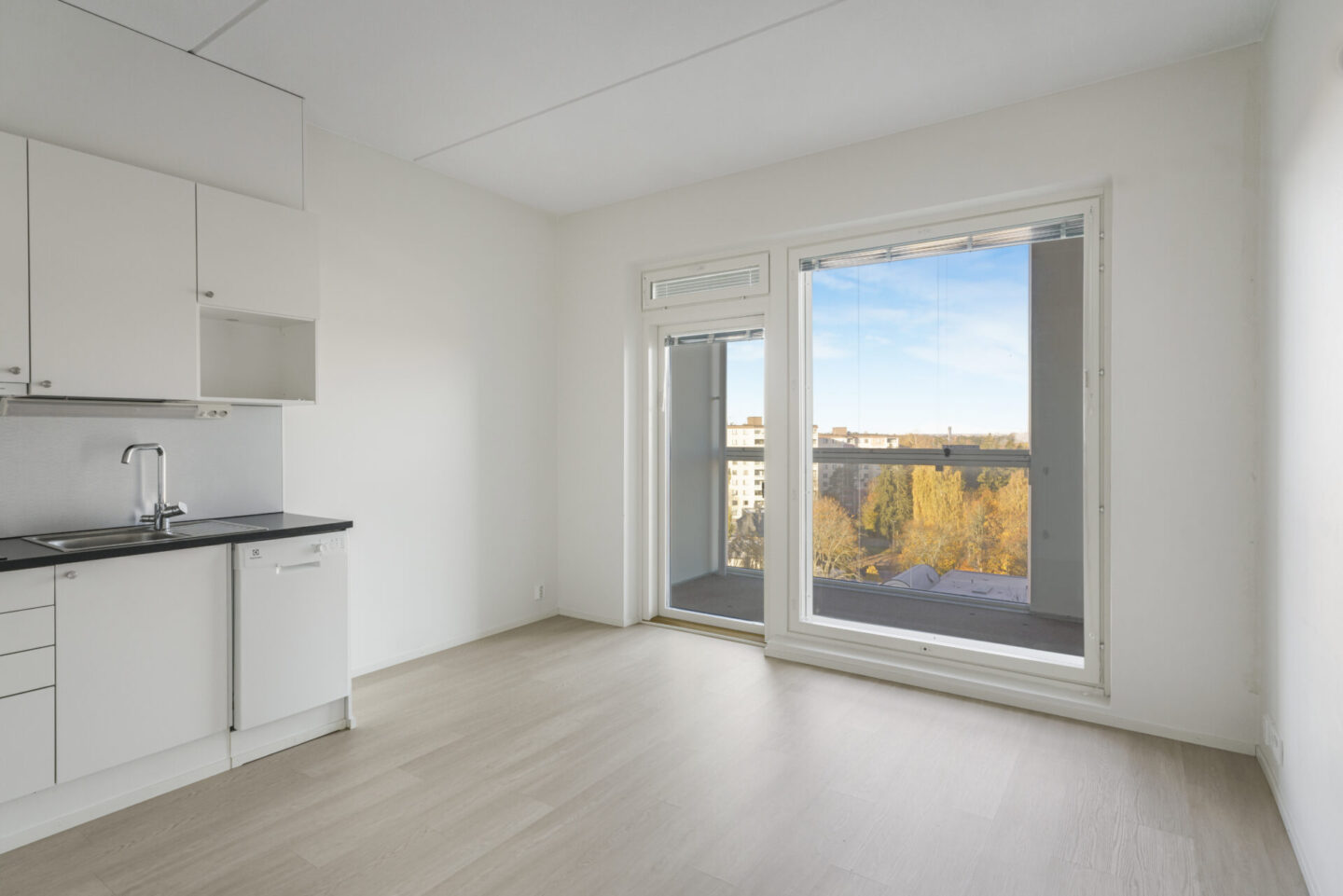 Asunnon tehokkaat 23 neliötä on suunniteltu käytännöllisesti. Huoneisto tuntuu tilavammalta korkean huonekorkeuden sekä valoisuuden ansiosta. Lasitettu parveke tarjoaa lisätilaa ja mahdollisuuden nauttia ulkoilmasta ympäri vuoden.