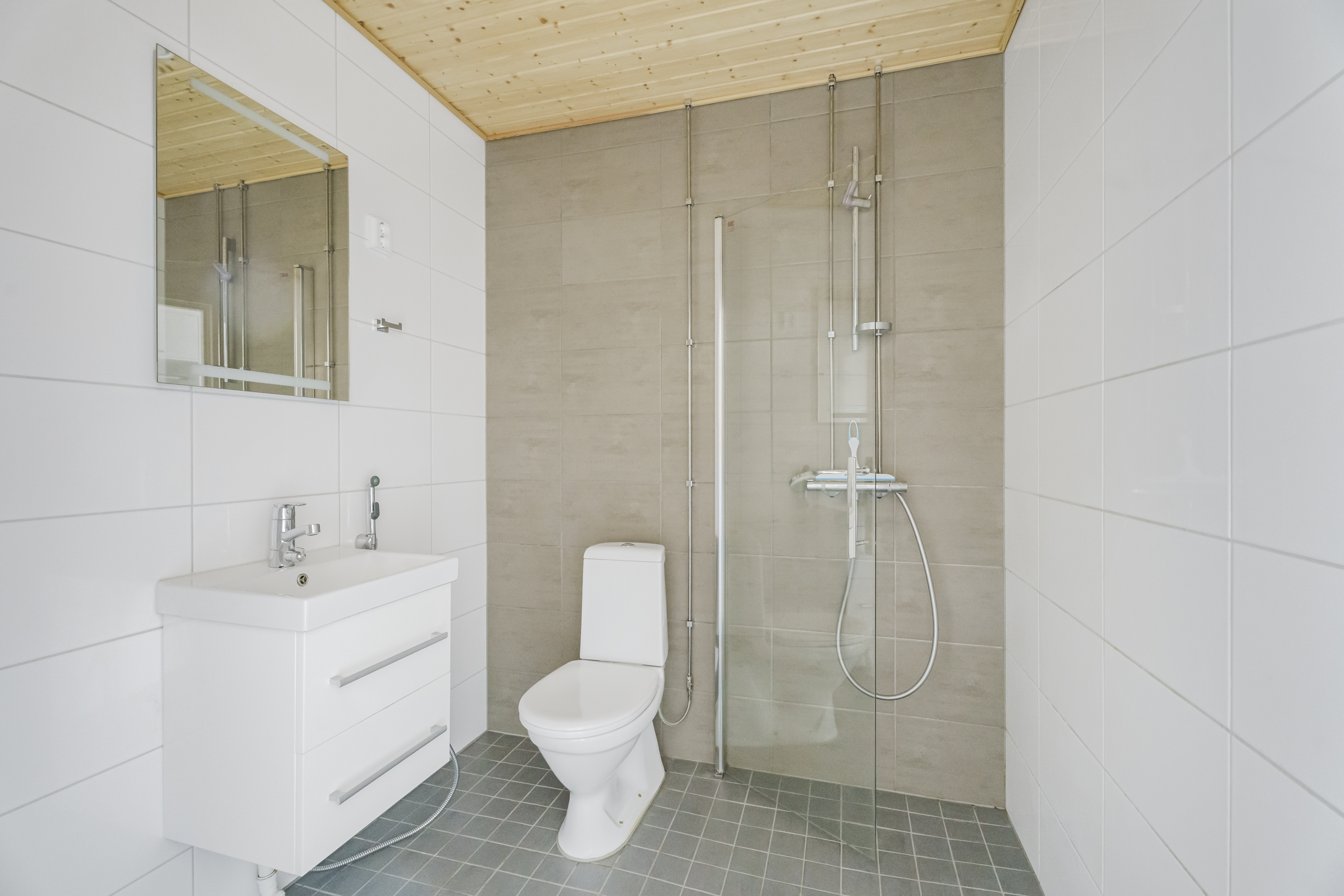 | Kylpyhuoneen kuvaus | WC-istuin, suihku, bidee-suihku, allaskaappi ja pesukoneliitäntä, seinät (kaakeli), lattiat (laatta) |