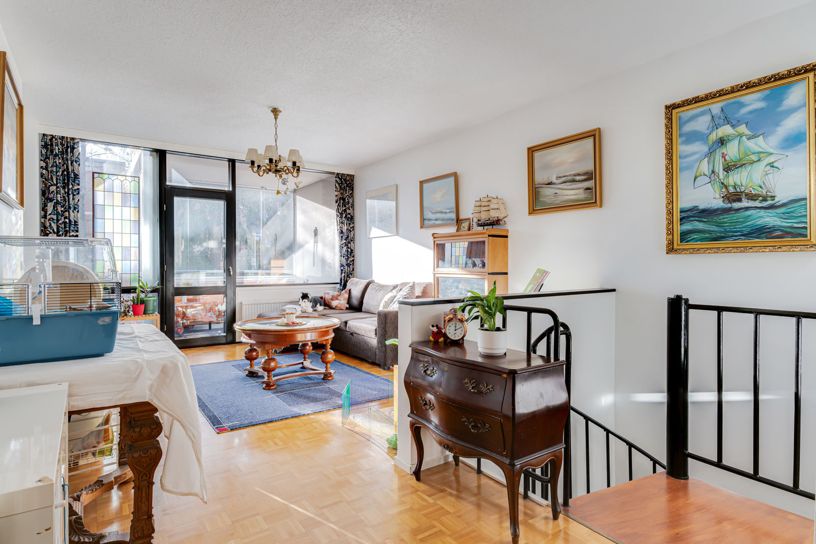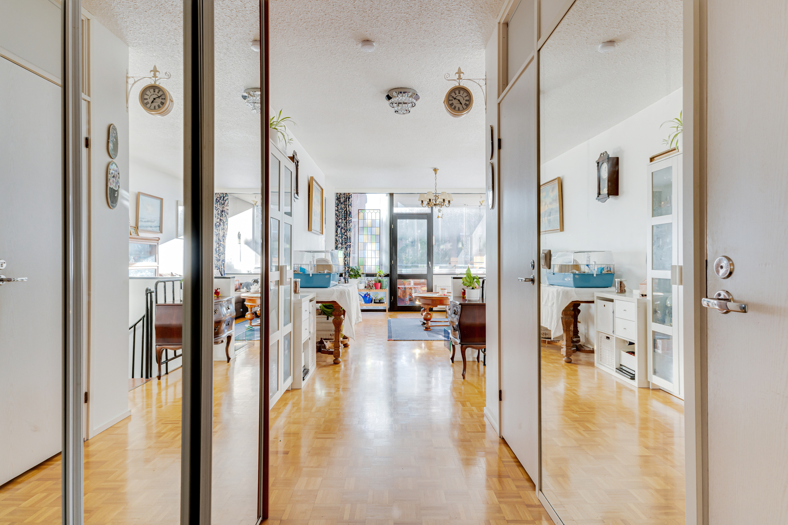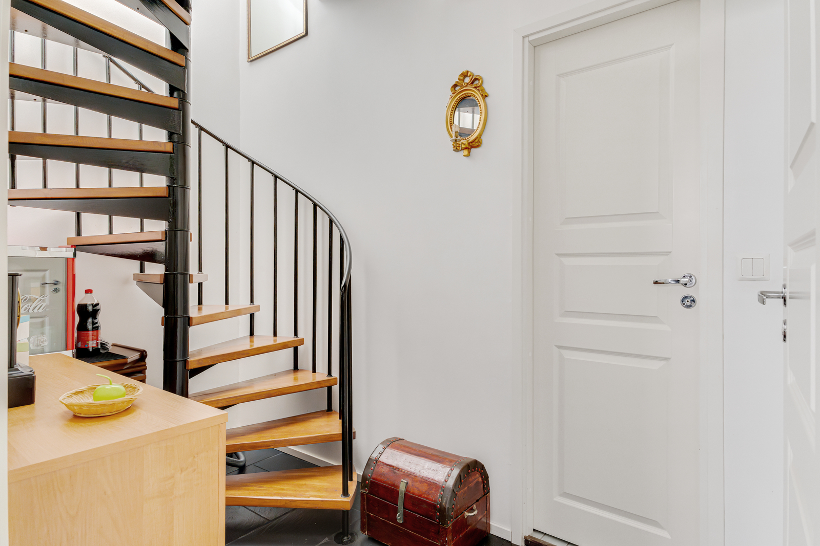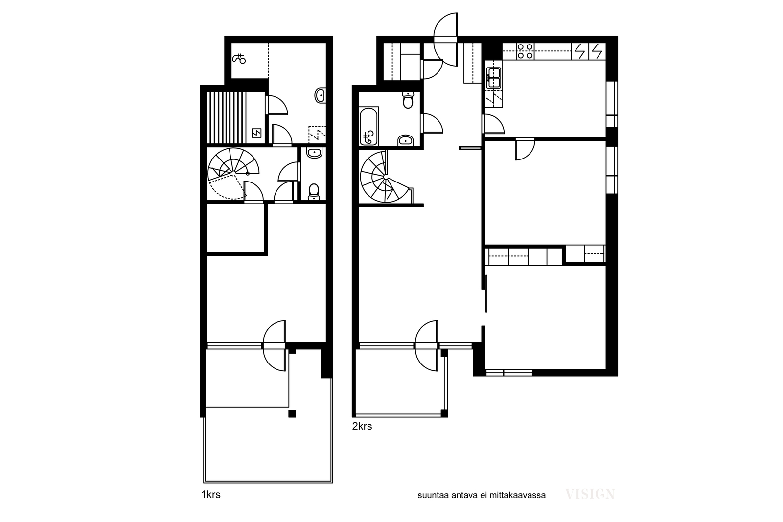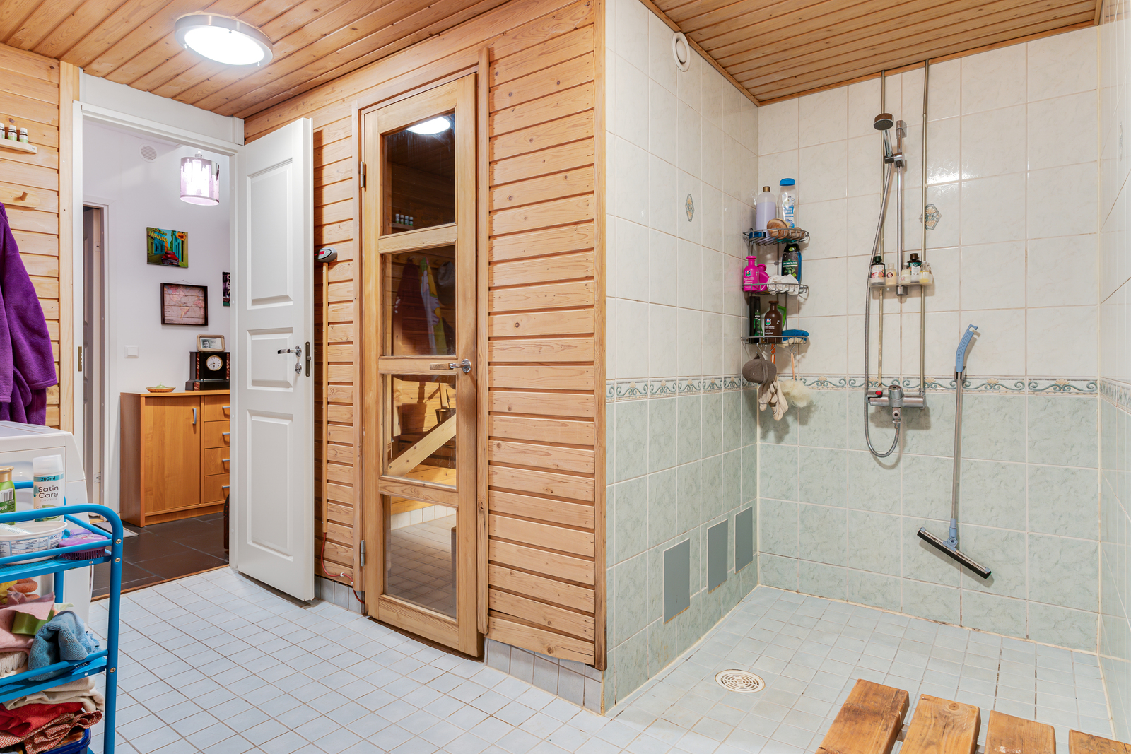 Alakerrassa sijaitsee loistavan kokoinen pukuhuone, jossa oma uloskäynti ja runsaasti kaappitilaa. Huone soveltuu esimerkiksi työhuoneeksi, mutta tällä hetkellä sitä käytetään makuuhuoneena. Lisäksi alakerrassa on saunatilat ja erillinen pieni wc. Kauniit kierreportaat vievät yläkertaan, jossa avara olohuone tulvii luonnonvaloa. Olohuoneesta on käynti lasitetulle parvekkeelle. Yläkerrassa on kaksi makuuhuonetta, tilava keittiö, vaatehuone sekä kylpyhuone, jossa asunnon toinen wc.
