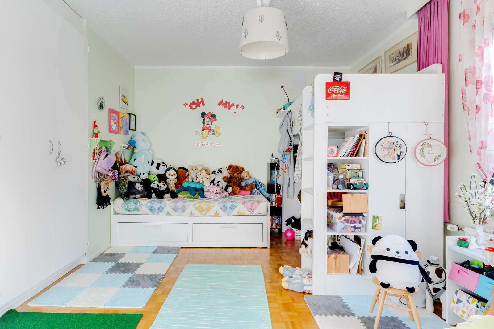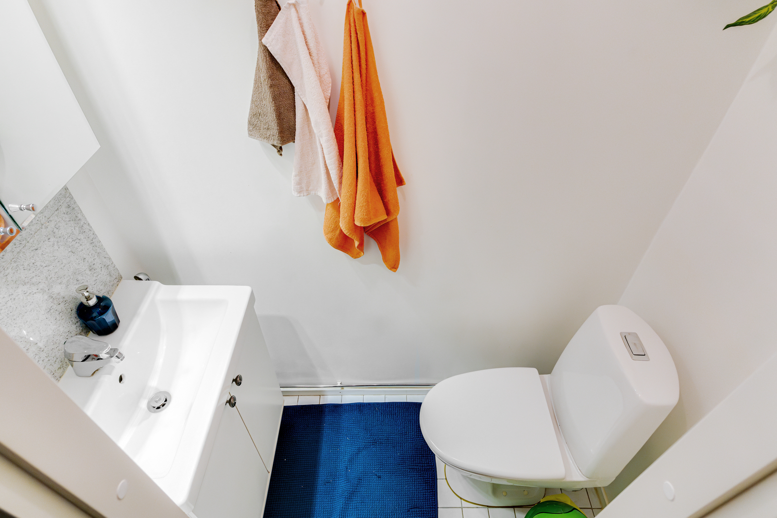 | Makuuhuoneen kuvaus | Alakerran pesuhuone, nyt “makuuhuone” käytössä olevat kaapit annetaan asunnon mukana, jos ostaja haluaa, sillä integroitu seinään |