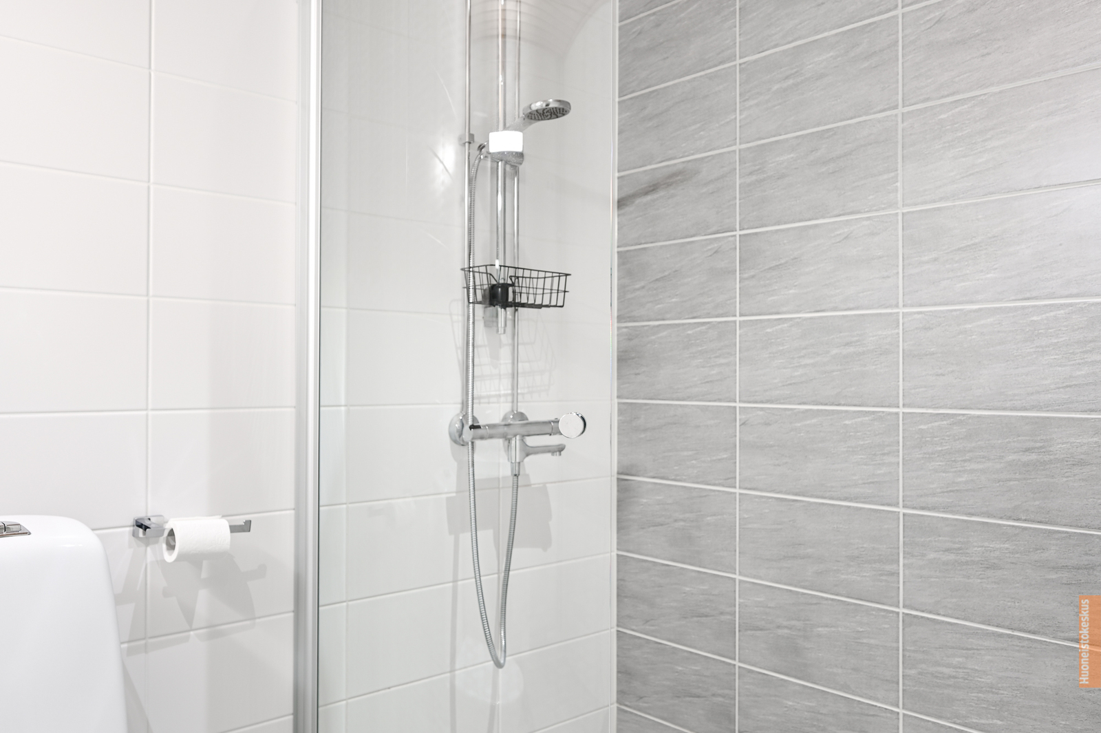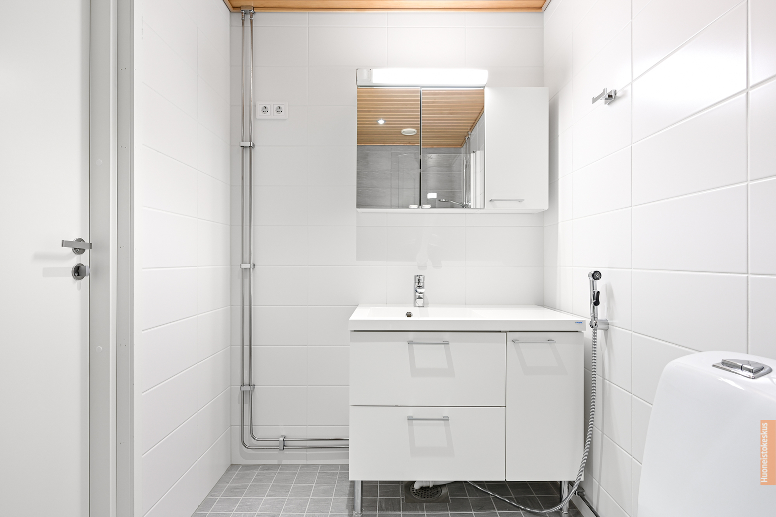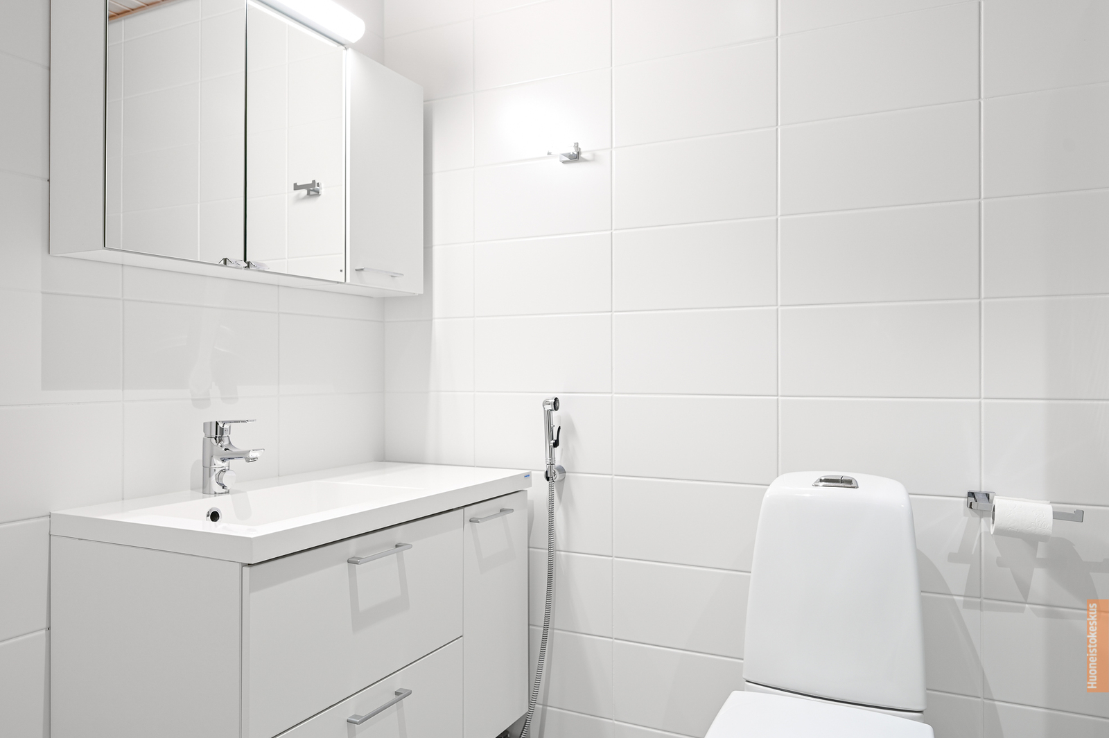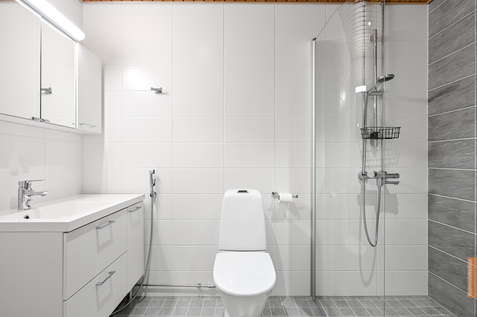 Lattialämmitys, pesukoneliitäntä, suihku ja wc-istuin, seinät (kaakeli), lattiat (laatta) |