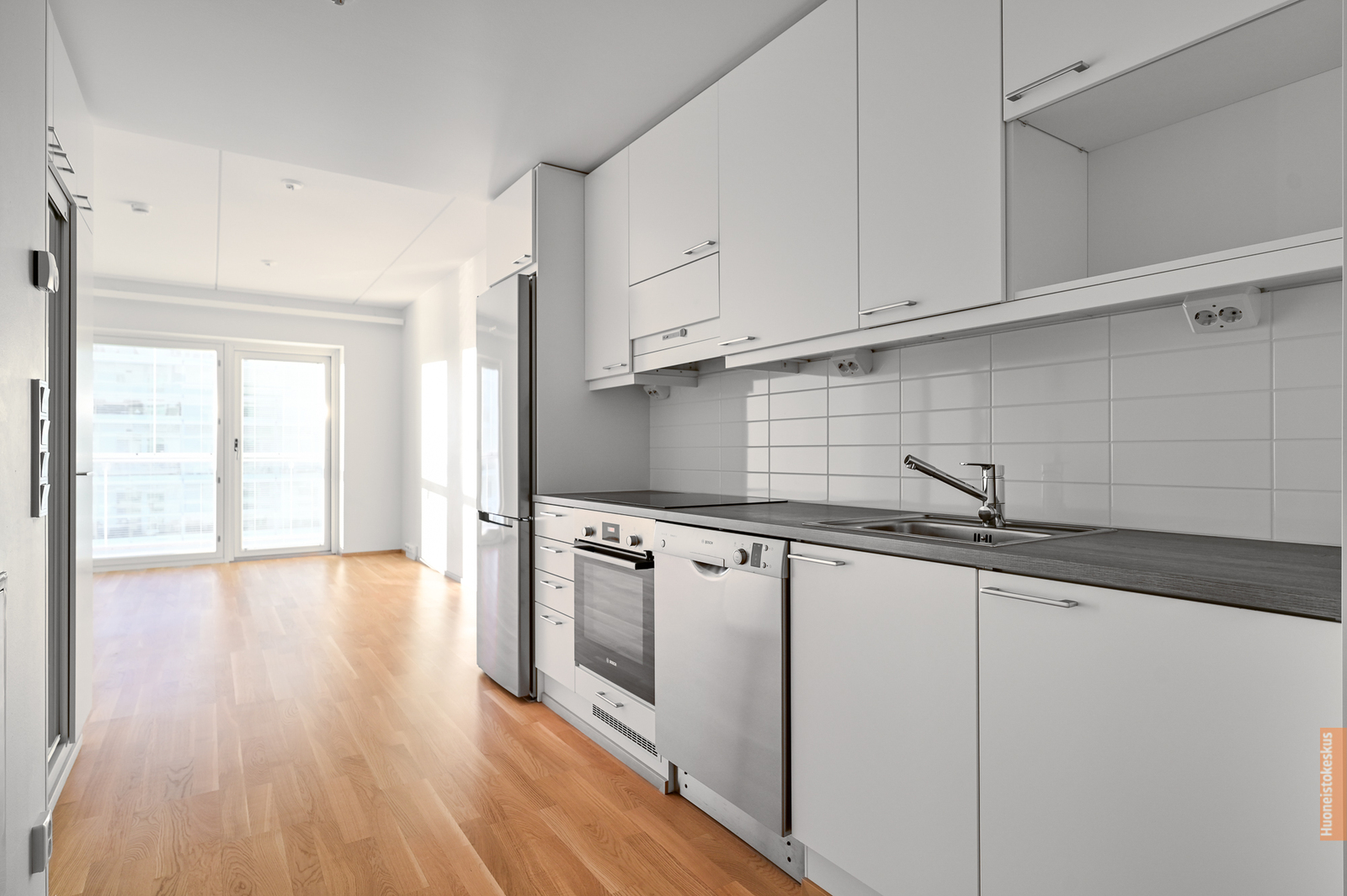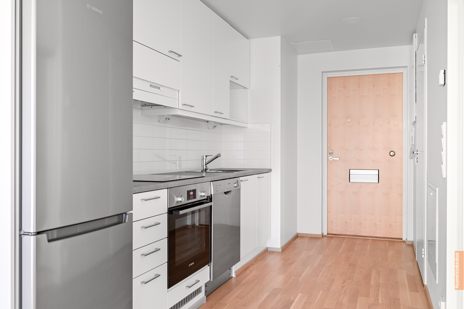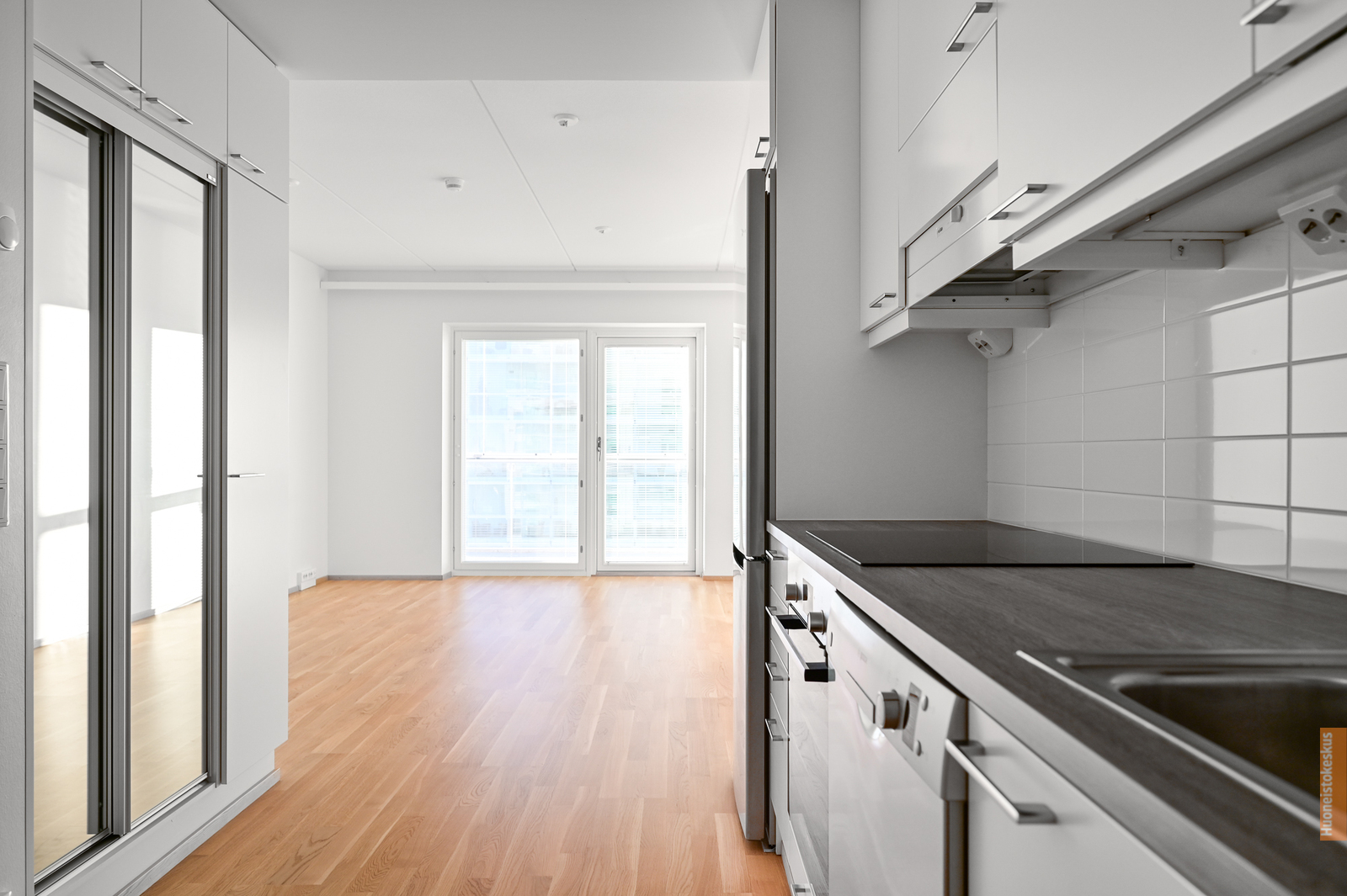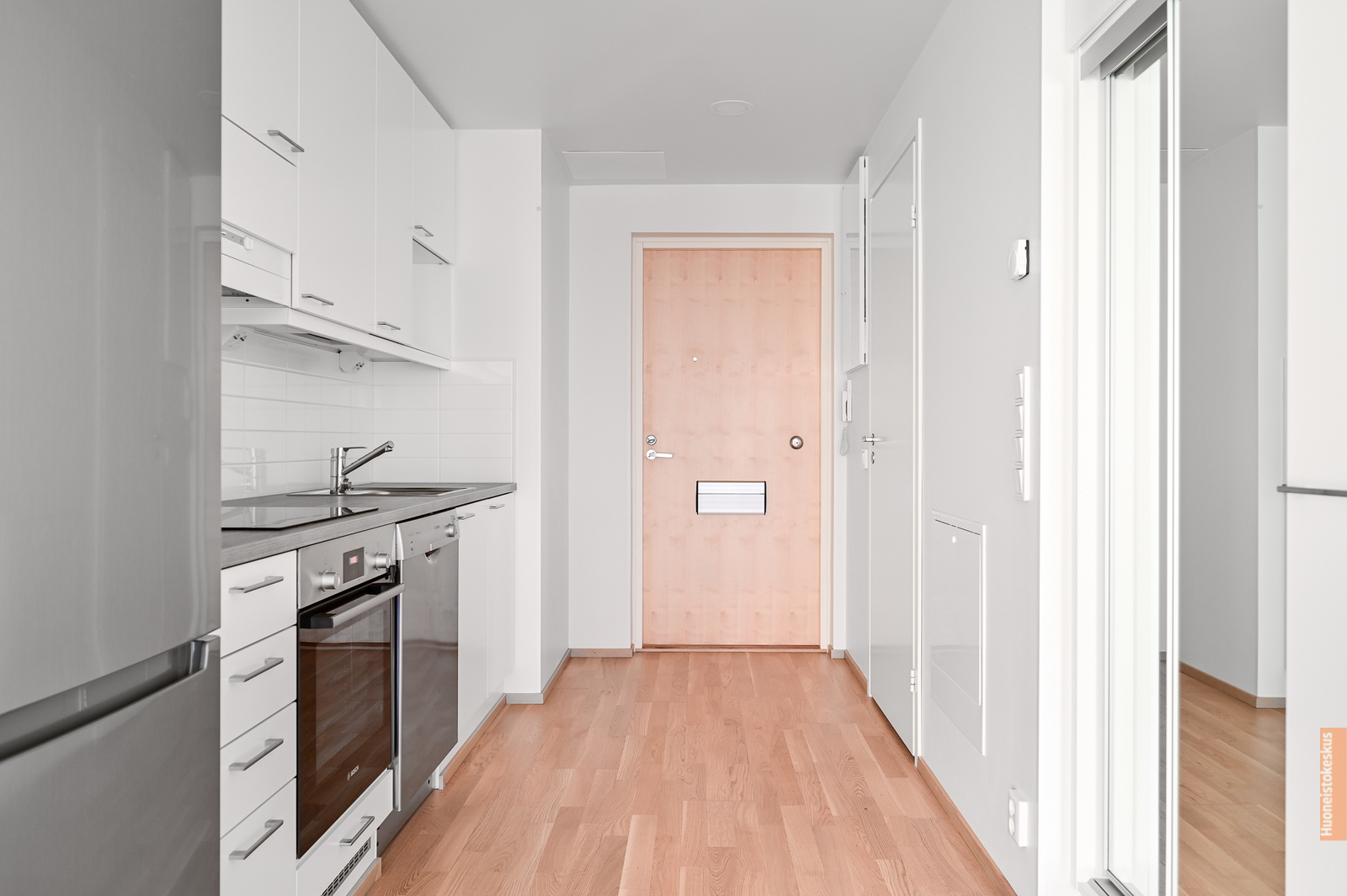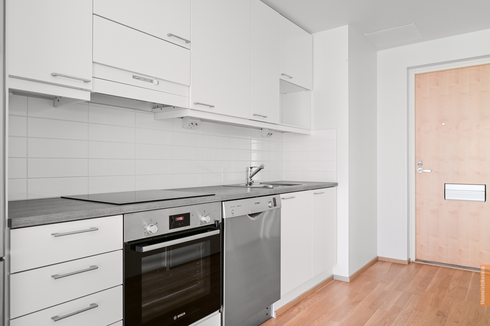Liesi (Induktioliesi), työtasot (laminaatti), seinät (maali), lattiat (laminaatti ja parketti), astianpesukone, liesituuletin, liesi ja jääkaappipakastin |