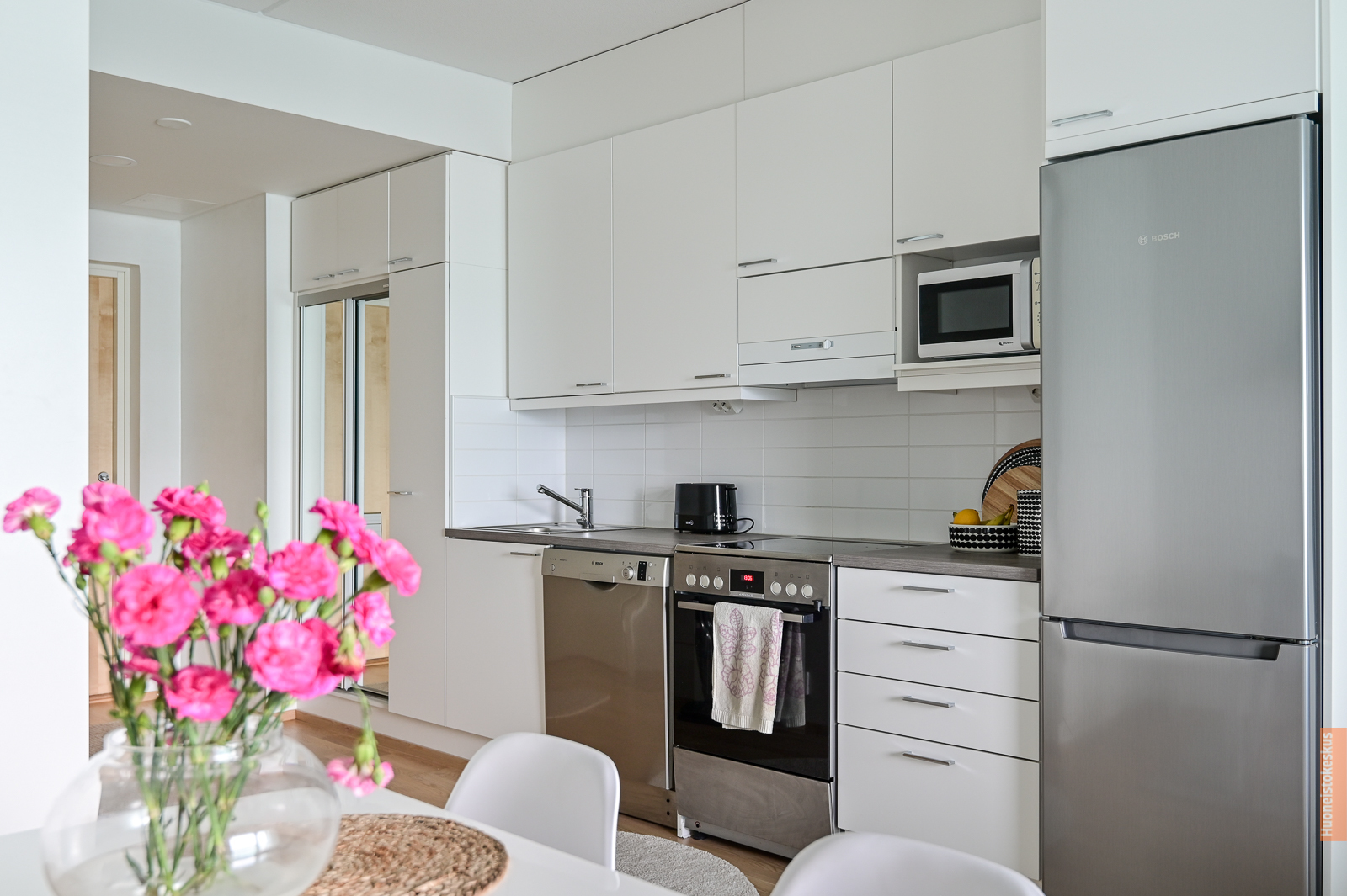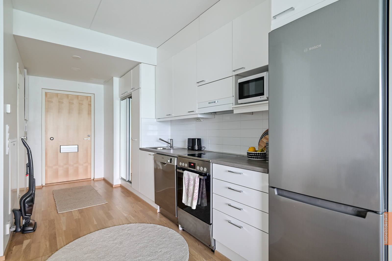 Liesi (Keraaminen liesi), työtasot (laminaatti), seinät (maali), lattiat (parketti), liesituuletin, jääkaappipakastin ja astianpesukone |