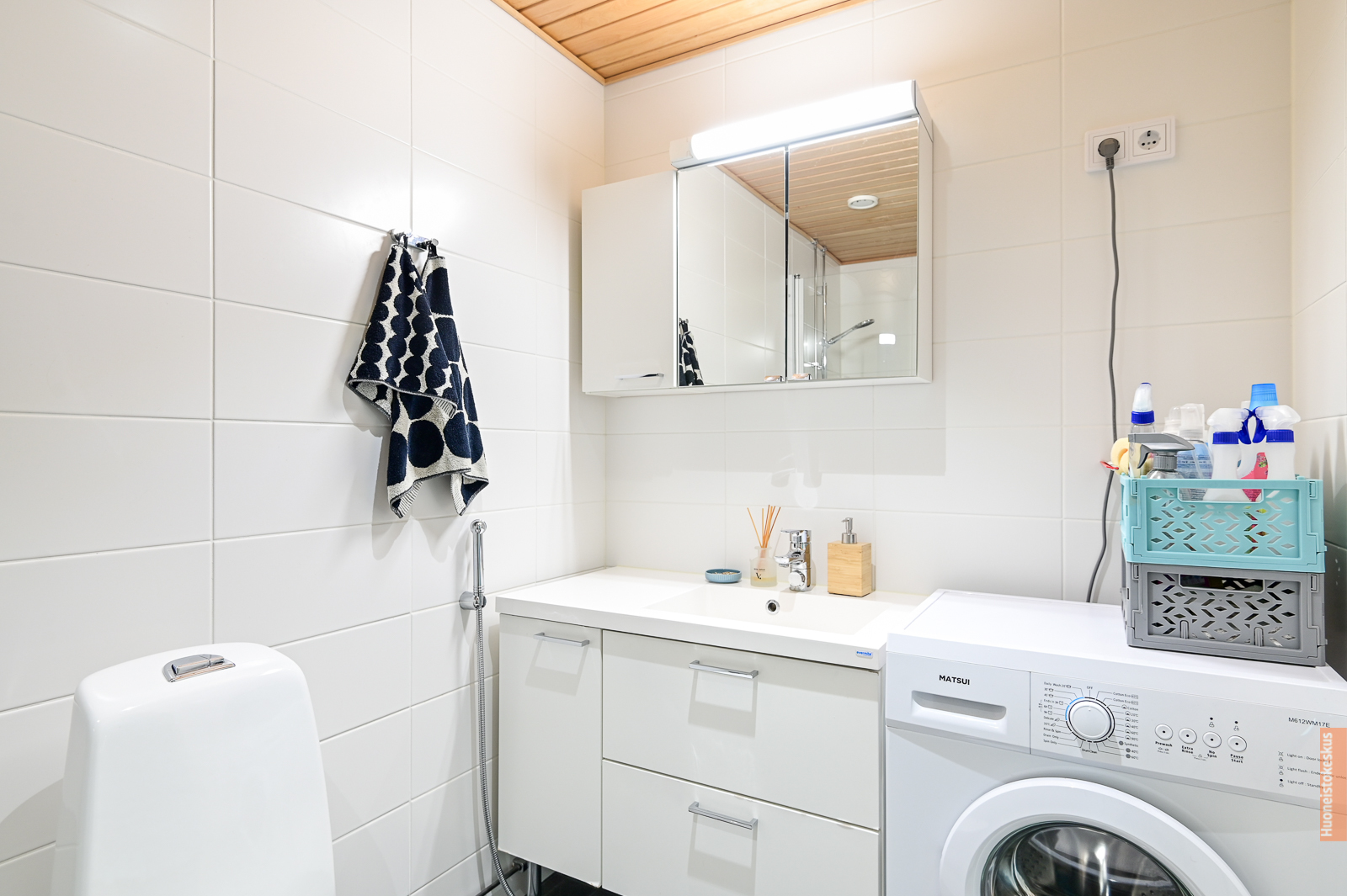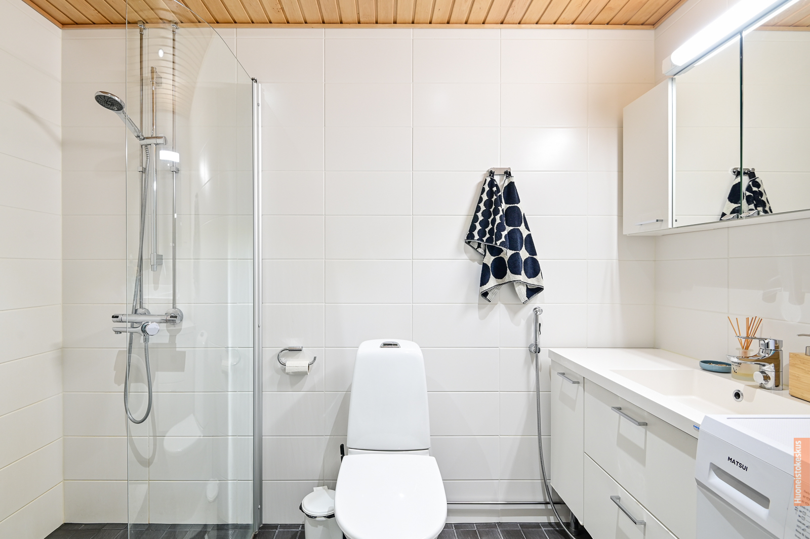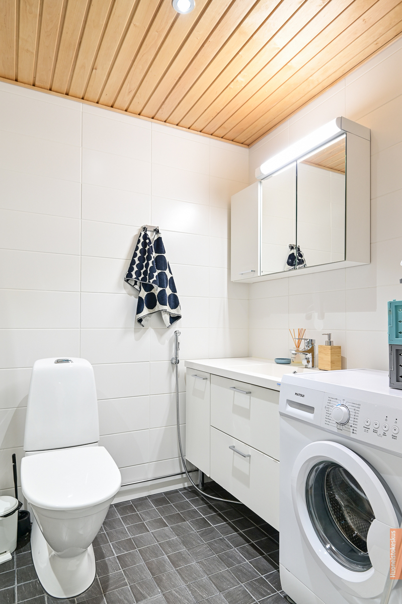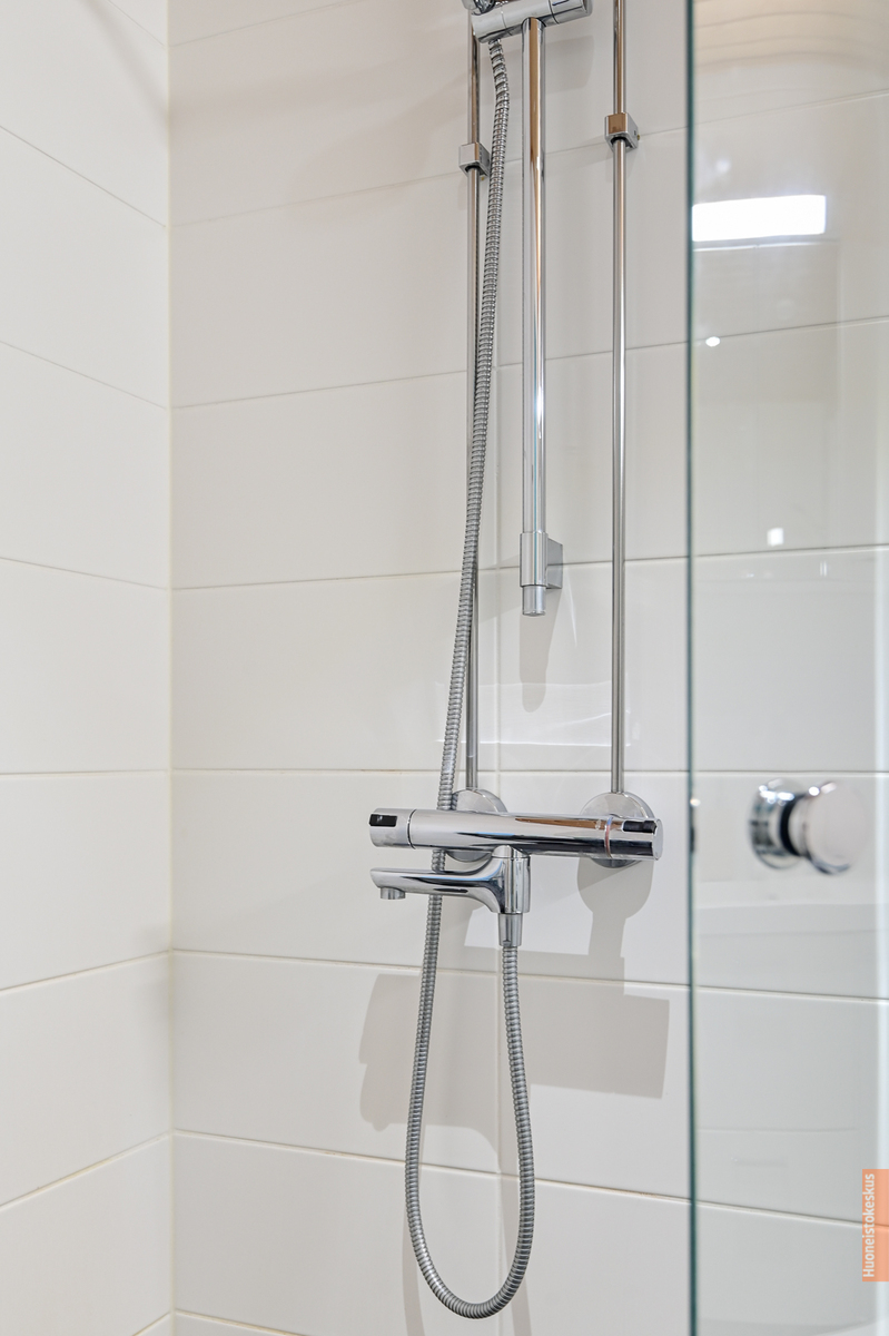 Suihku, lattialämmitys, suihkuseinä, peilikaappi ja pesukoneliitäntä, seinät (kaakeli), lattiat (laatta) |