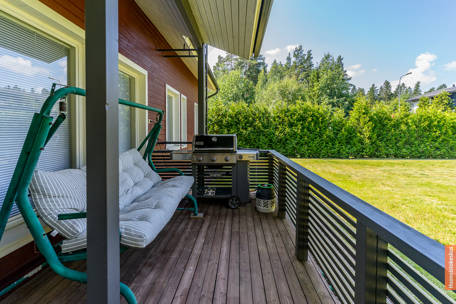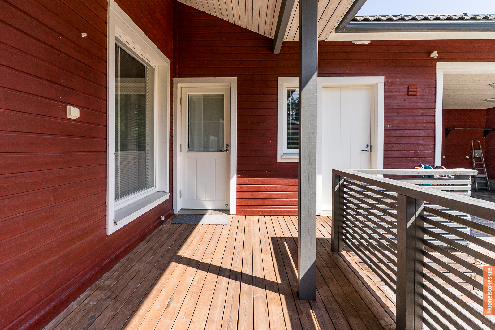 Säilytystiloina suuret liukuovikaapistot eteisessä sekä kaapistot kolmessa makuuhuoneessa. Autokatos kahdelle autolle ja sen yhteydessä on myös hyvän kokoinen lämmin varastotila / tekninen tila. Myös pääoven edustalla on käytännöllinen katettu terassi ja piha-aluetta kadun suuntaan suojaa tuija-aita.
