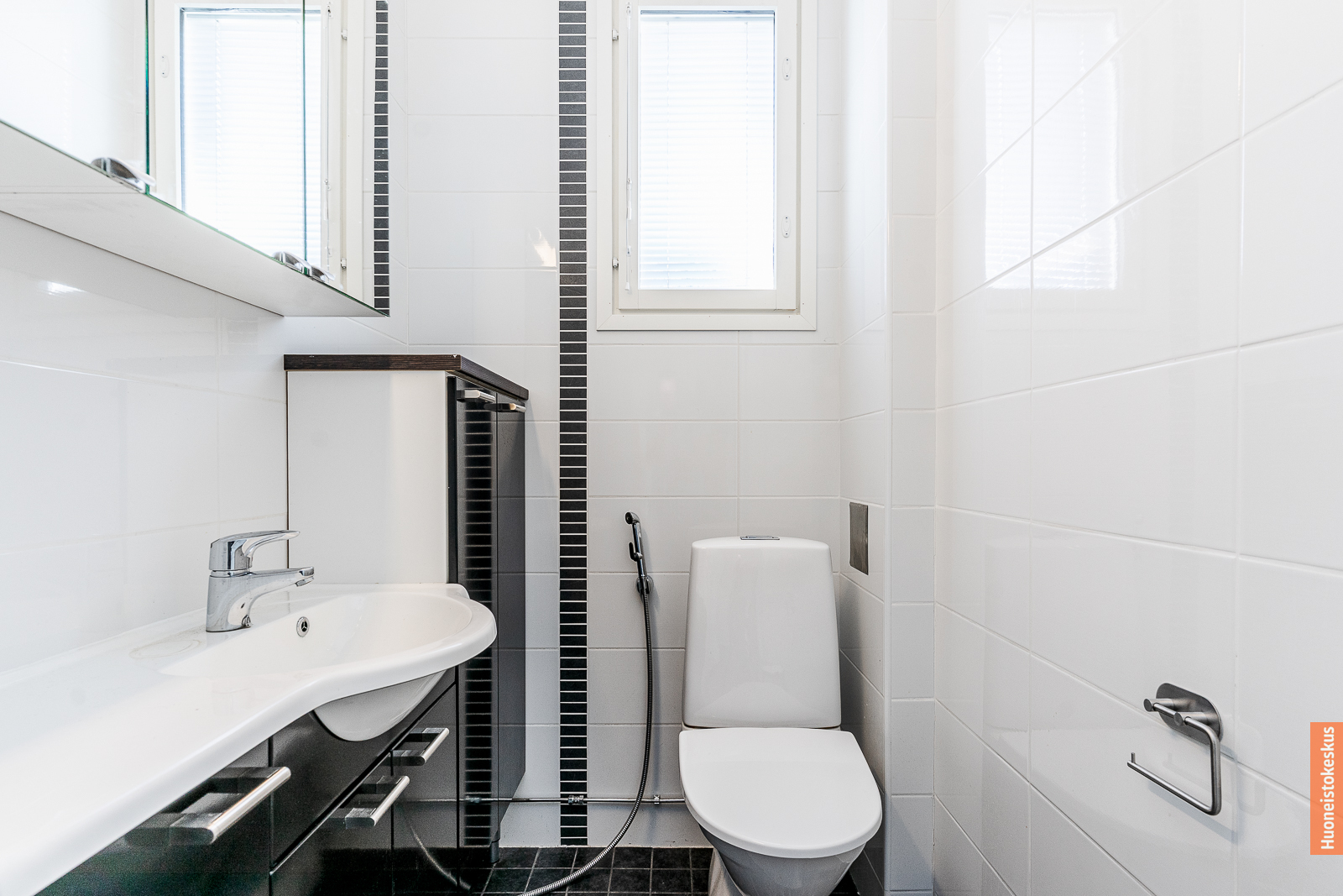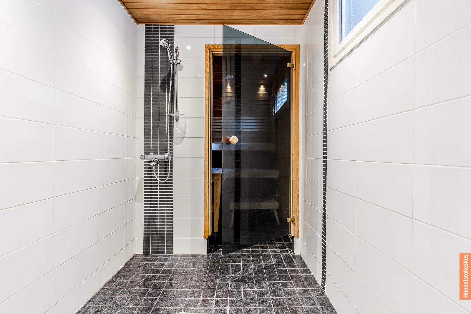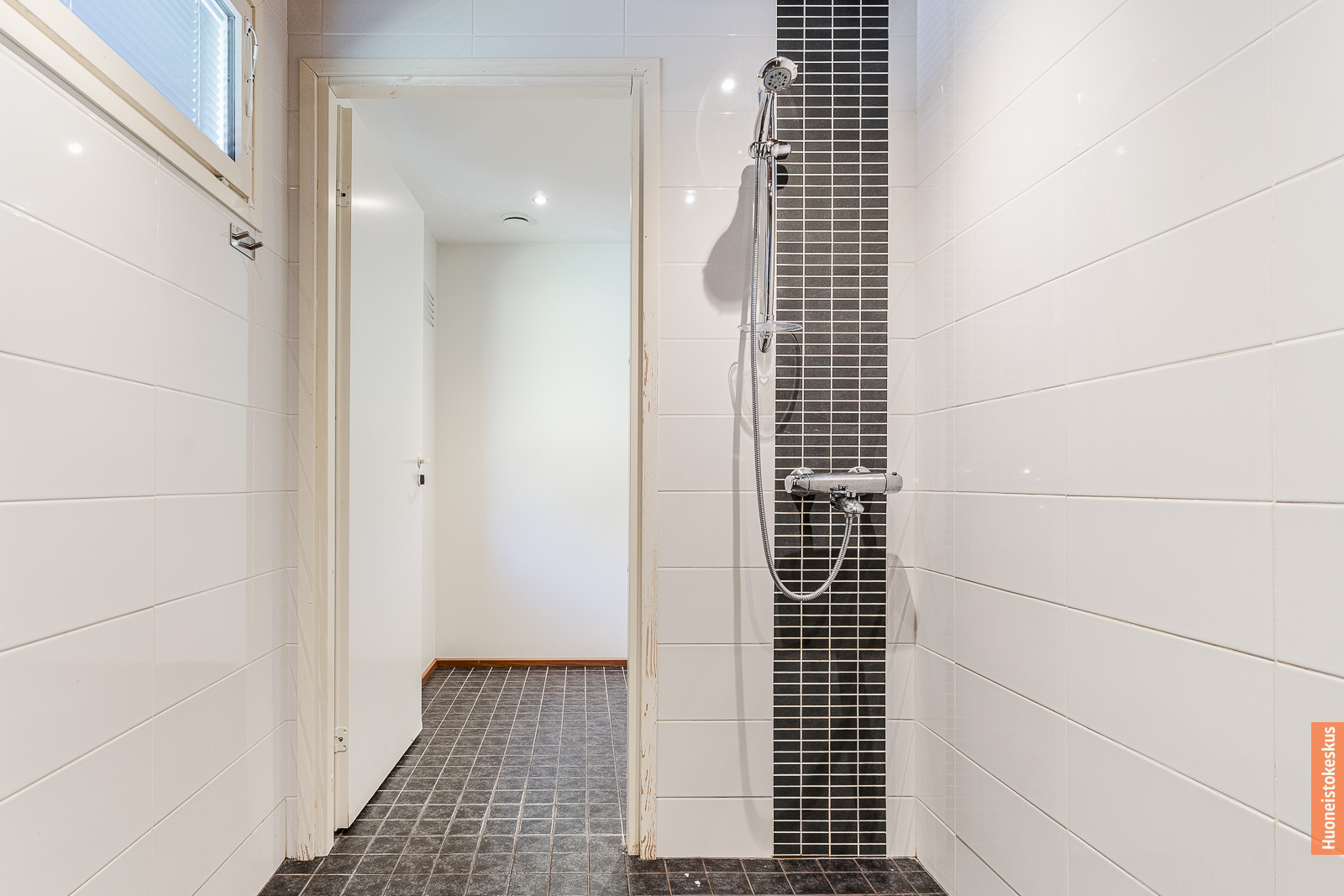 | Kylpyhuoneen kuvaus | Lattialämmitys, suihku ja kiinteät valaisimet, seinät (kaakeli), lattiat (laatta) |