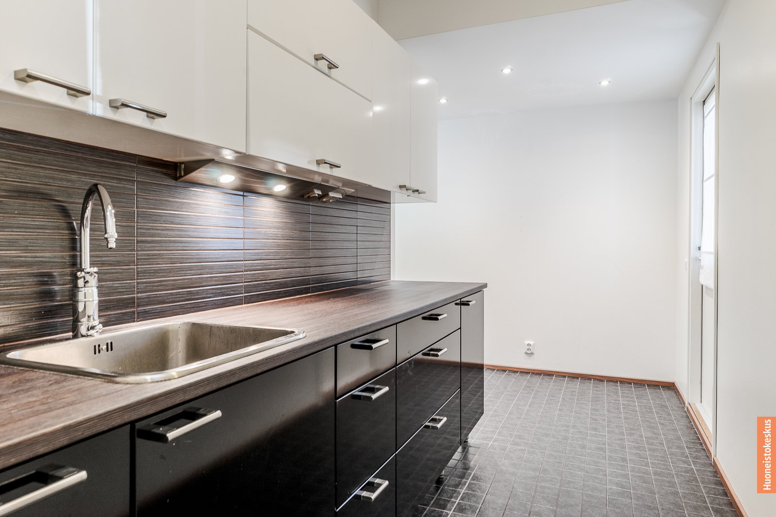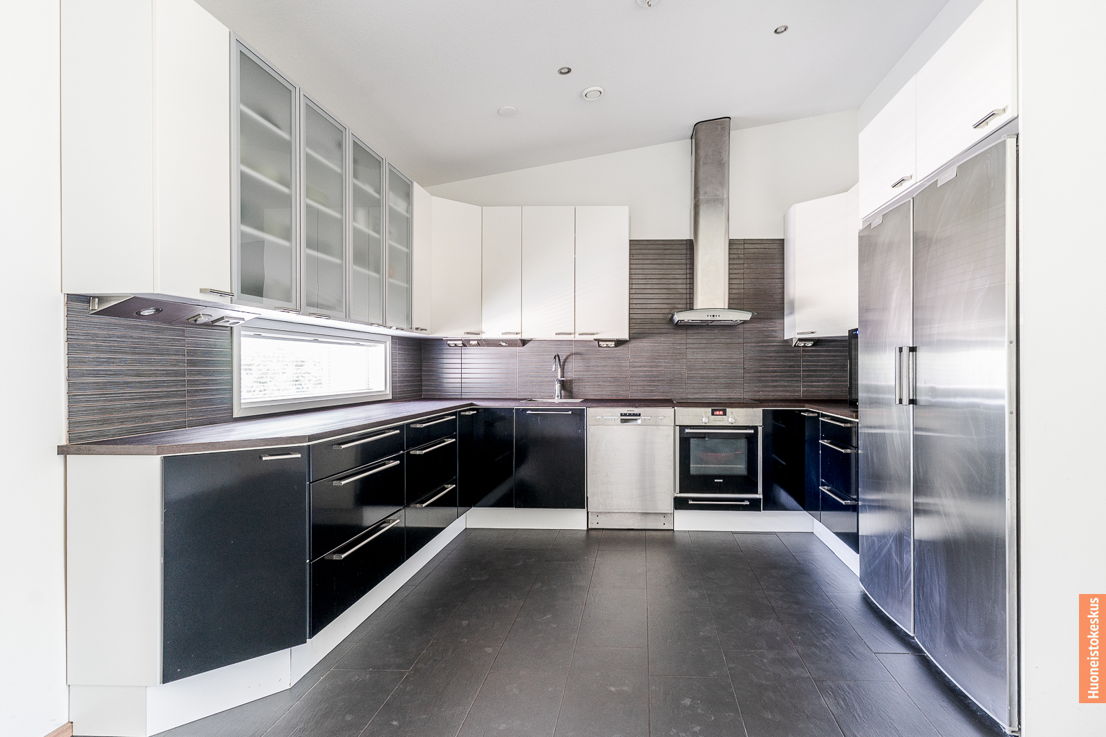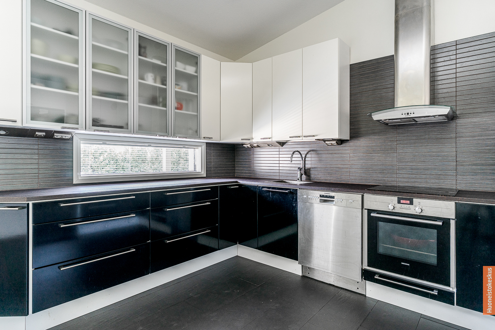 | Keittiön kuvaus | Liesi (Keraaminen liesi ja erillisuuni), työtasot (laminaatti), seinät (maali), lattiat (laminaatti), erillisuuni, liesituuletin, erillinen pakastin, astianpesukone, jääkaappi ja kiinteät valaisimet |