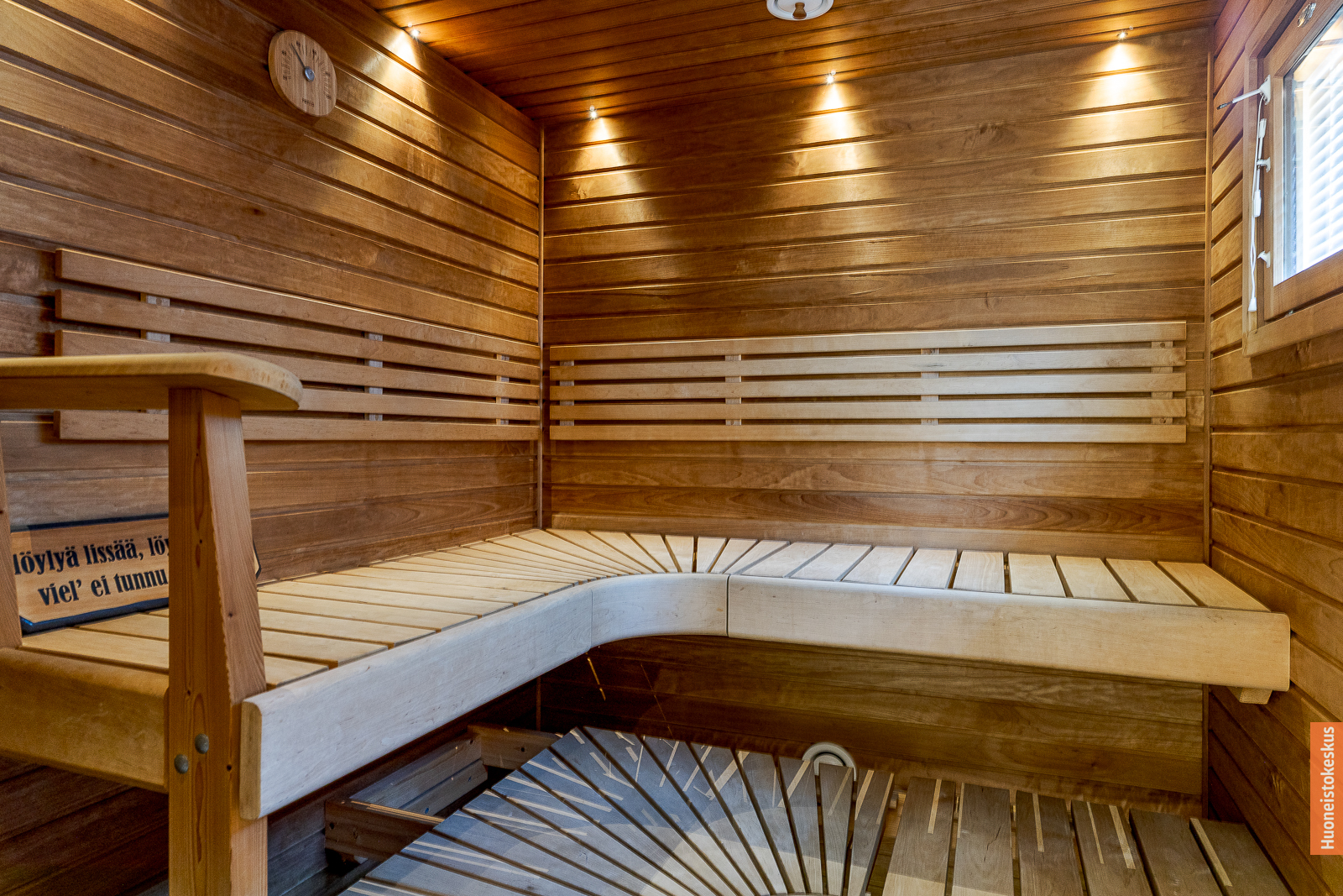 | Saunan kuvaus | Seinät (puu), lattiat (laatta), Sähkökiuas |