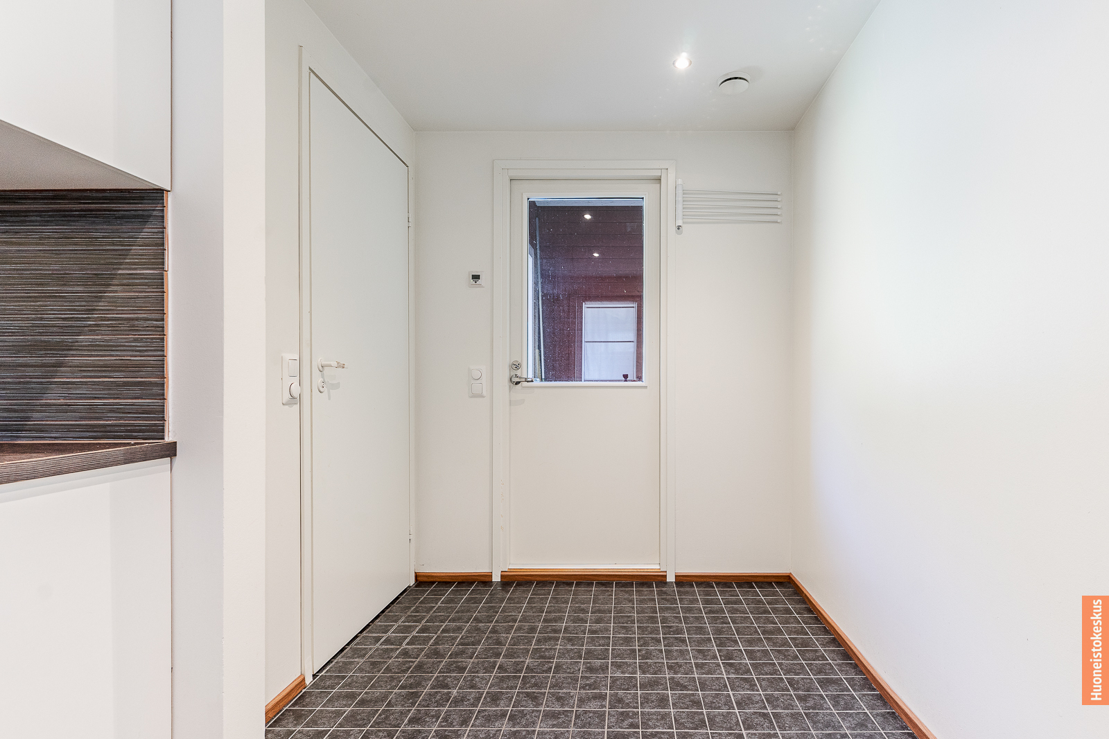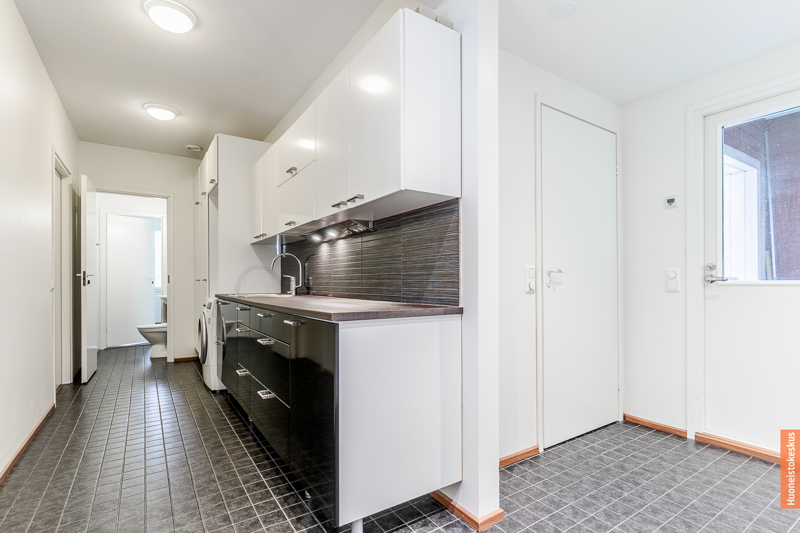 | Kodinhoitohuoneen kuvaus | Lattialämmitys, pöytätaso, pesukoneliitäntä ja pesuallas, lattiat (laatta), seinät (kaakeli) |