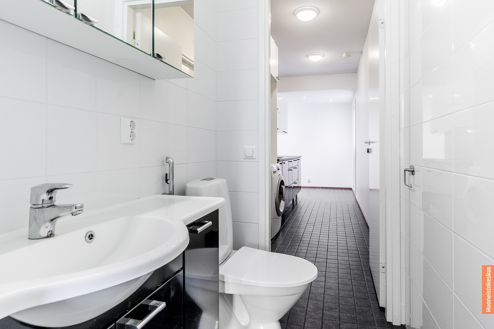 Kodinhoitohuone on tilava ja sieltä on käynti ulos. Kylpytilat, sauna ja pesuhuone, ovat talon tyylin mukaisesti hyvin suunniteltu ja laadukkaasti toteutettu.