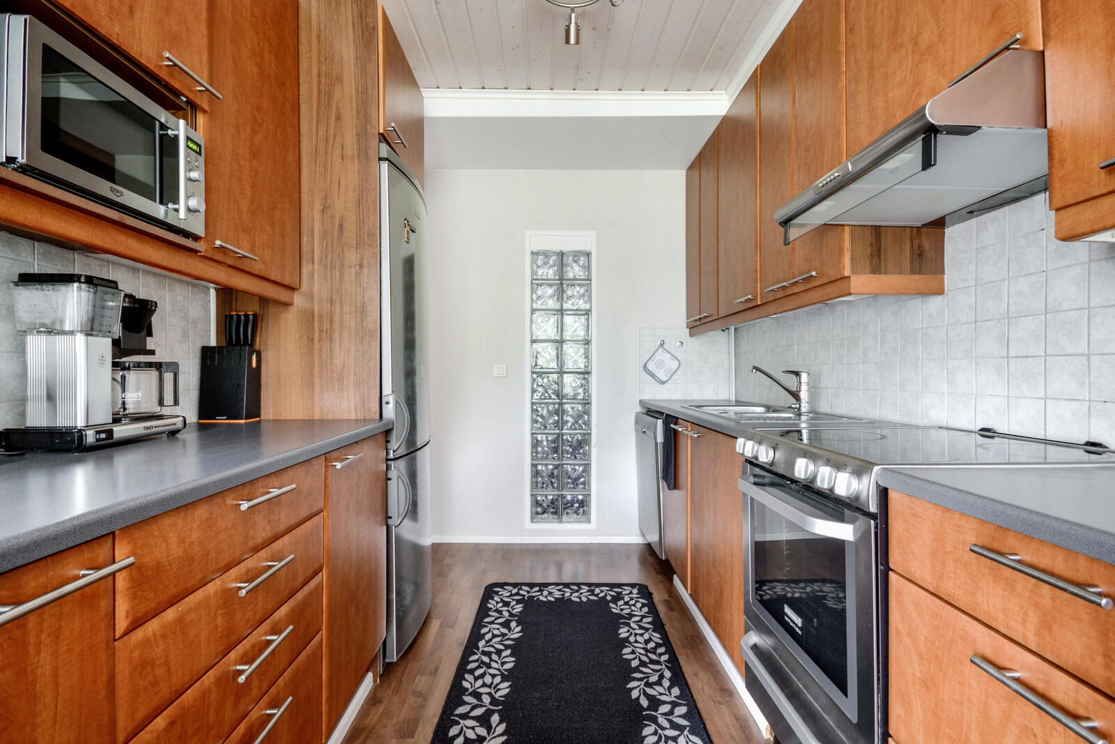 Liesi (Keraaminen liesi), seinät (maali ja lasikuitutapetti), lattiat (laminaatti), astianpesukone, jääkaappipakastin ja kiinteät valaisimet |