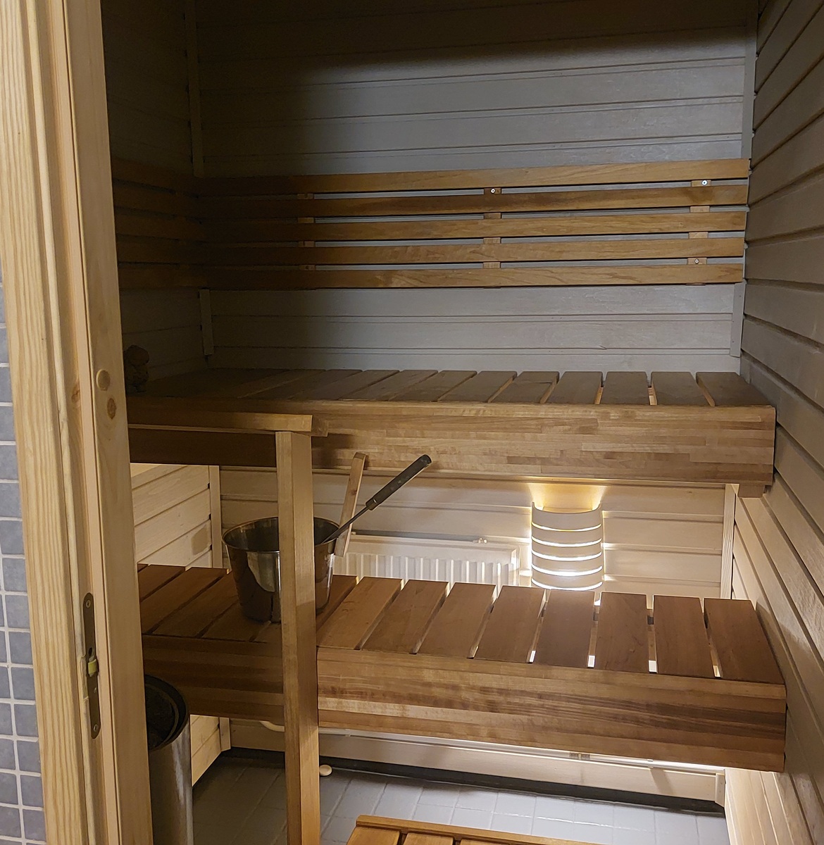 Seinät (puu), lattiat (laatta), Sähkökiuas, uusittu saunan lauteet , paneleita uusittu ja käsitelty 2022, saunan lattia maalattu-22 |