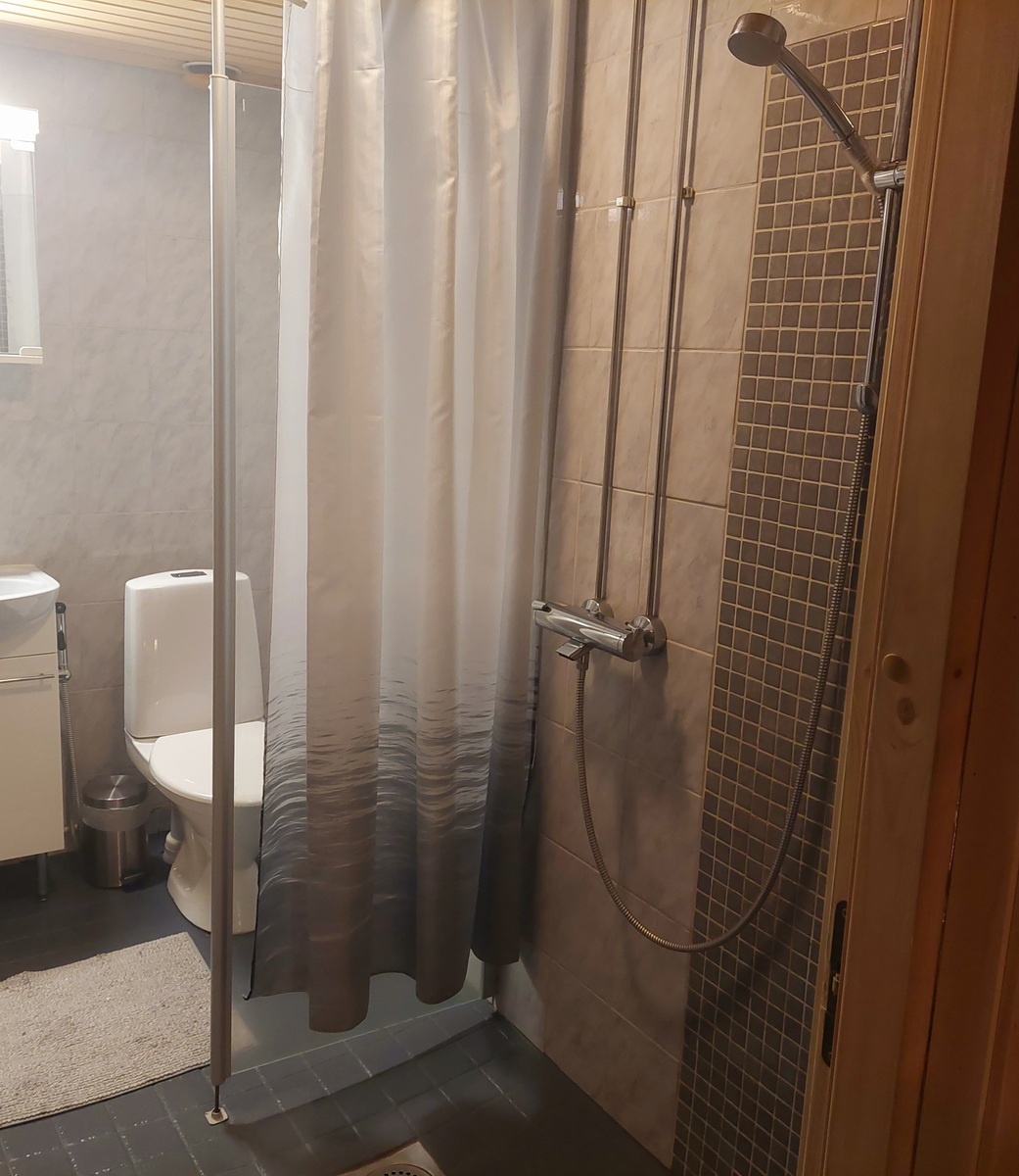 WC-istuin, suihkuseinä, peilikaappi, suihku ja kiinteät valaisimet, seinät (kaakeli), lattiat (laatta) |