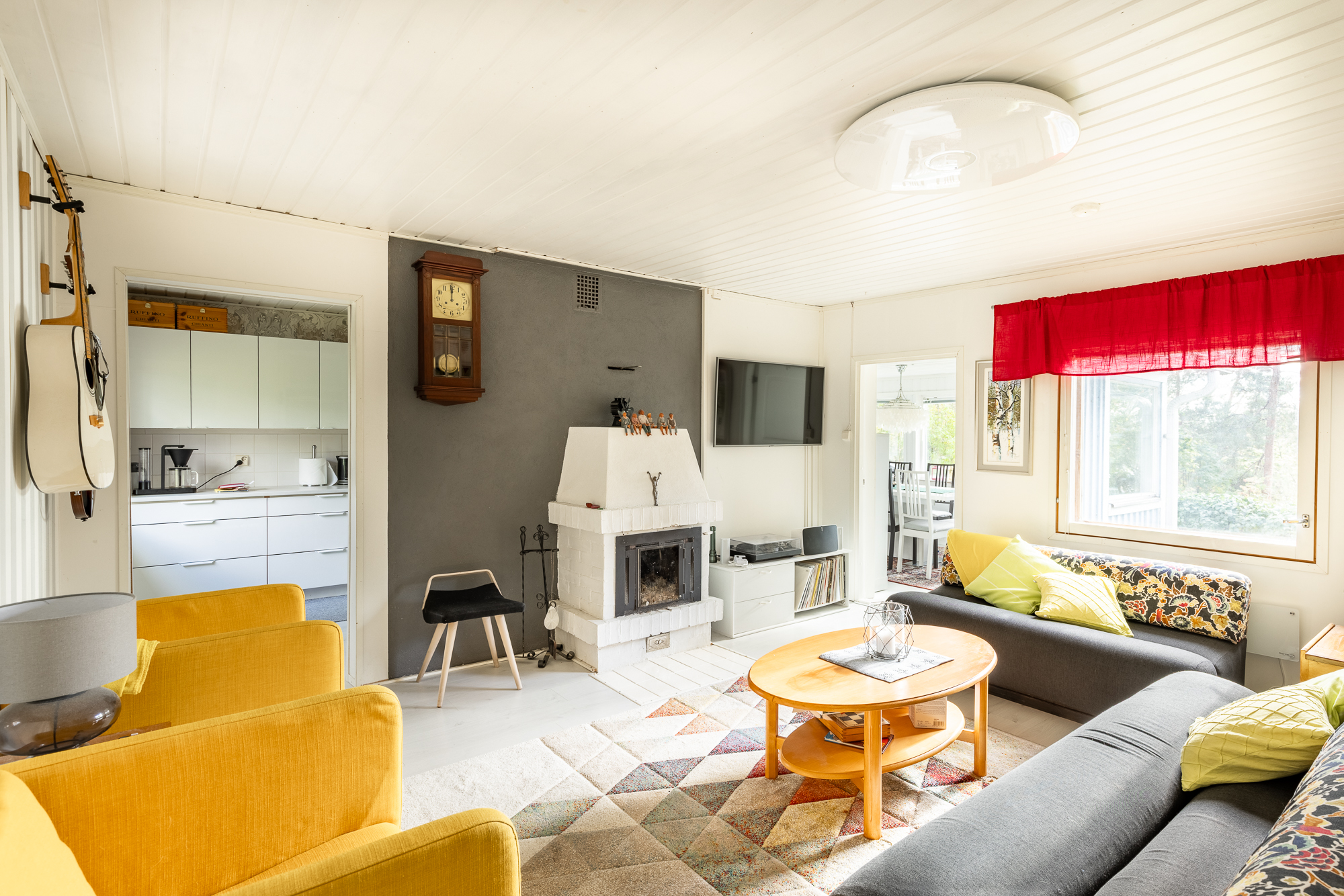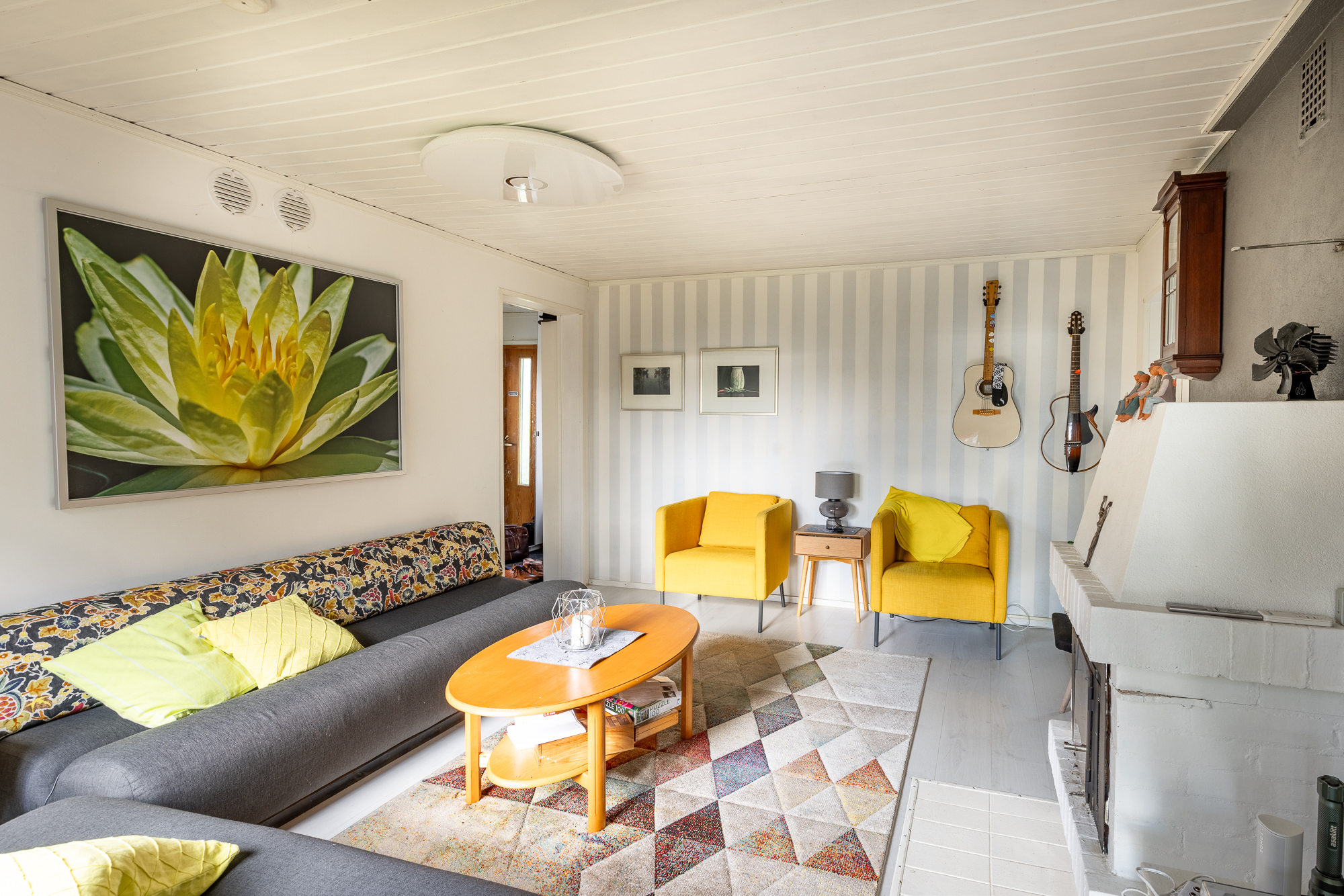 ilmalämpöpumppu, ja tunnelmaa tuo takka olohuoneessa.