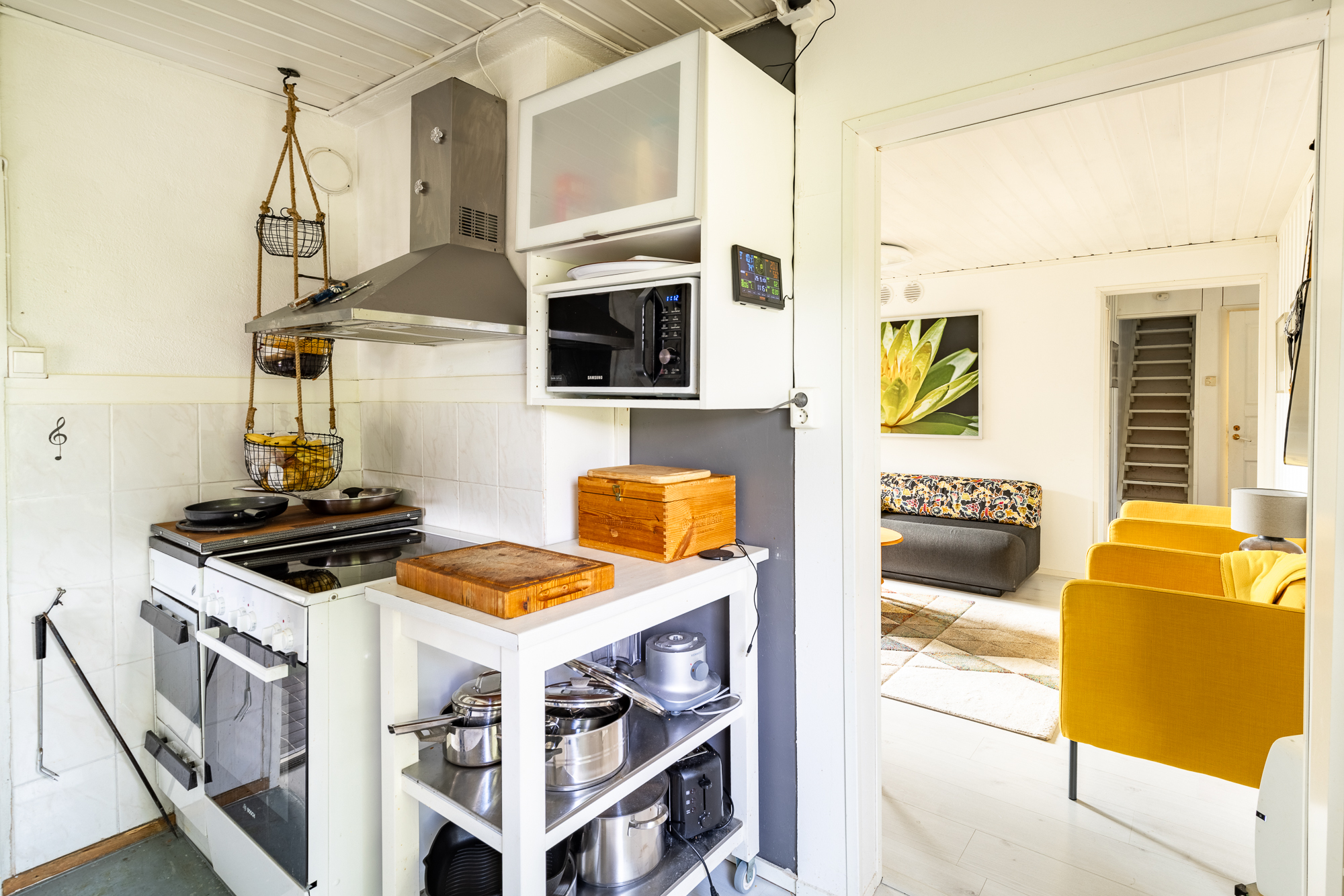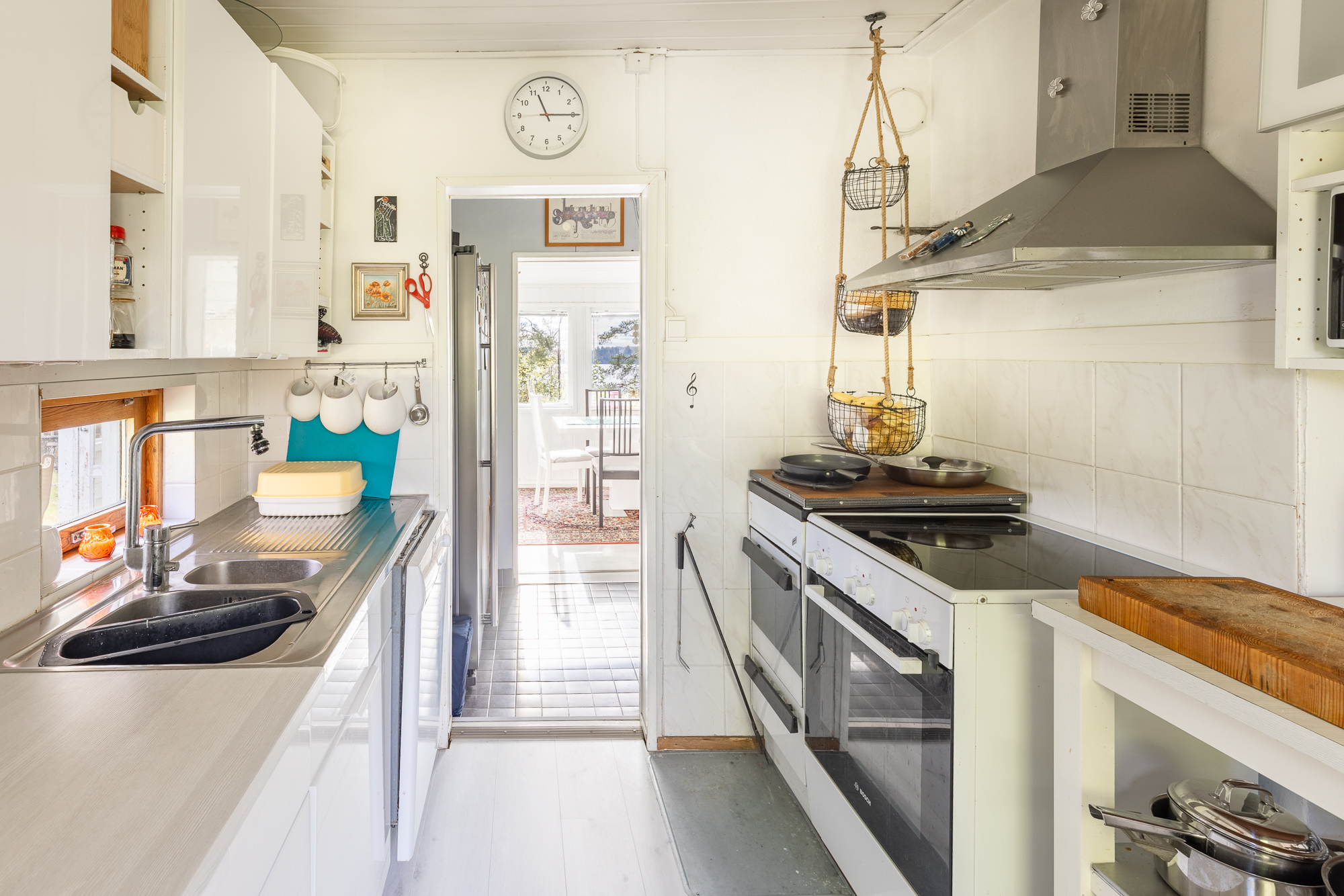 Liesi (Keraaminen liesi), työtasot (laminaatti), seinät (kaakeli ja maali), lattiat (laminaatti), jääkaappi, erillinen pakastin, liesi, liesituuletin ja puuliesi |