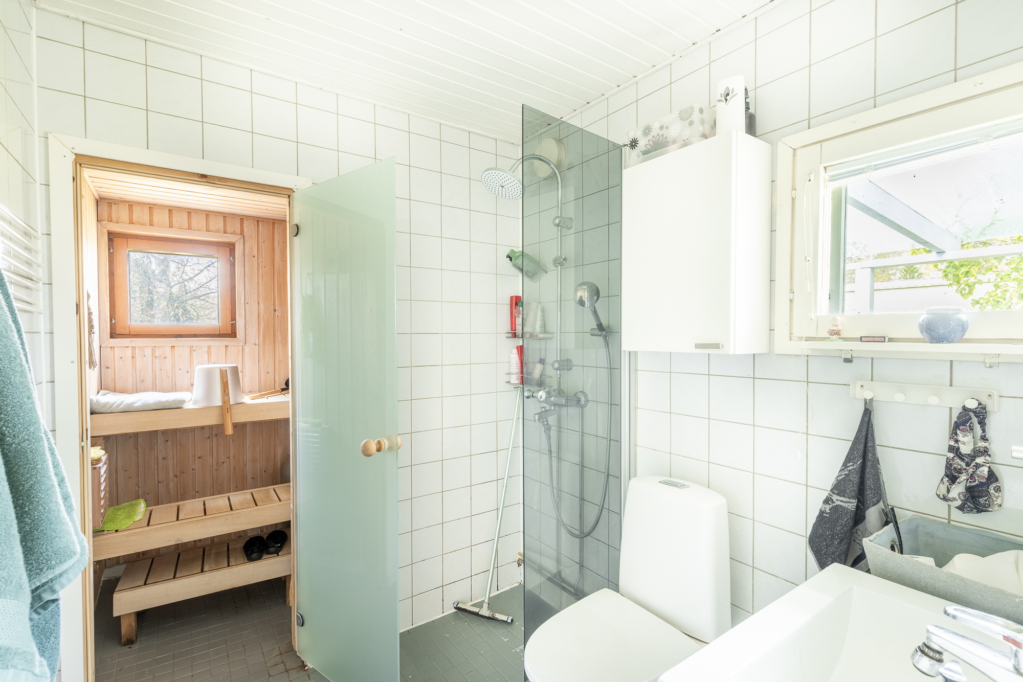 Seinät (kaakeli ja maali), lattiat (laatta), Sähkökiuas |