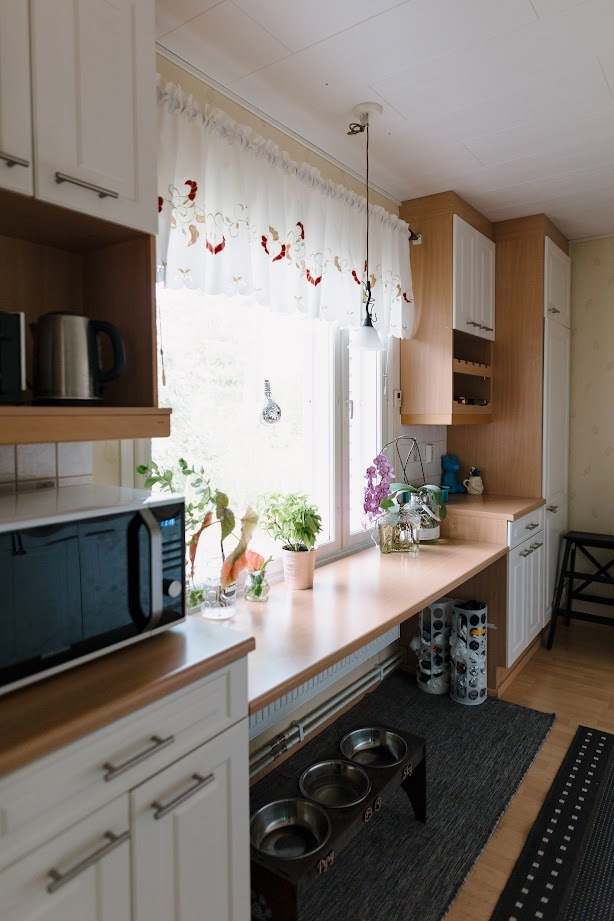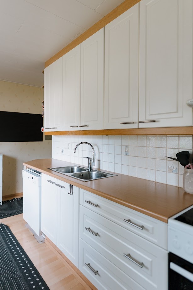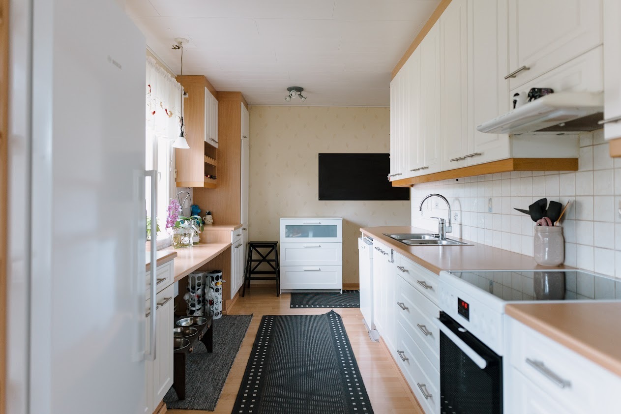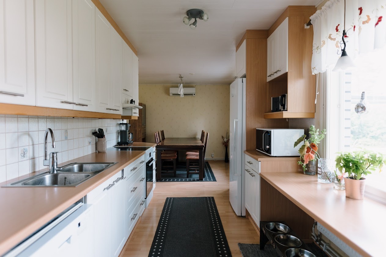 Liesi (Induktioliesi), työtasot (laminaatti), seinät (tapetti), lattiat (laminaatti), jääkaappi, liesi, astianpesukone ja liesituuletin / hormi |