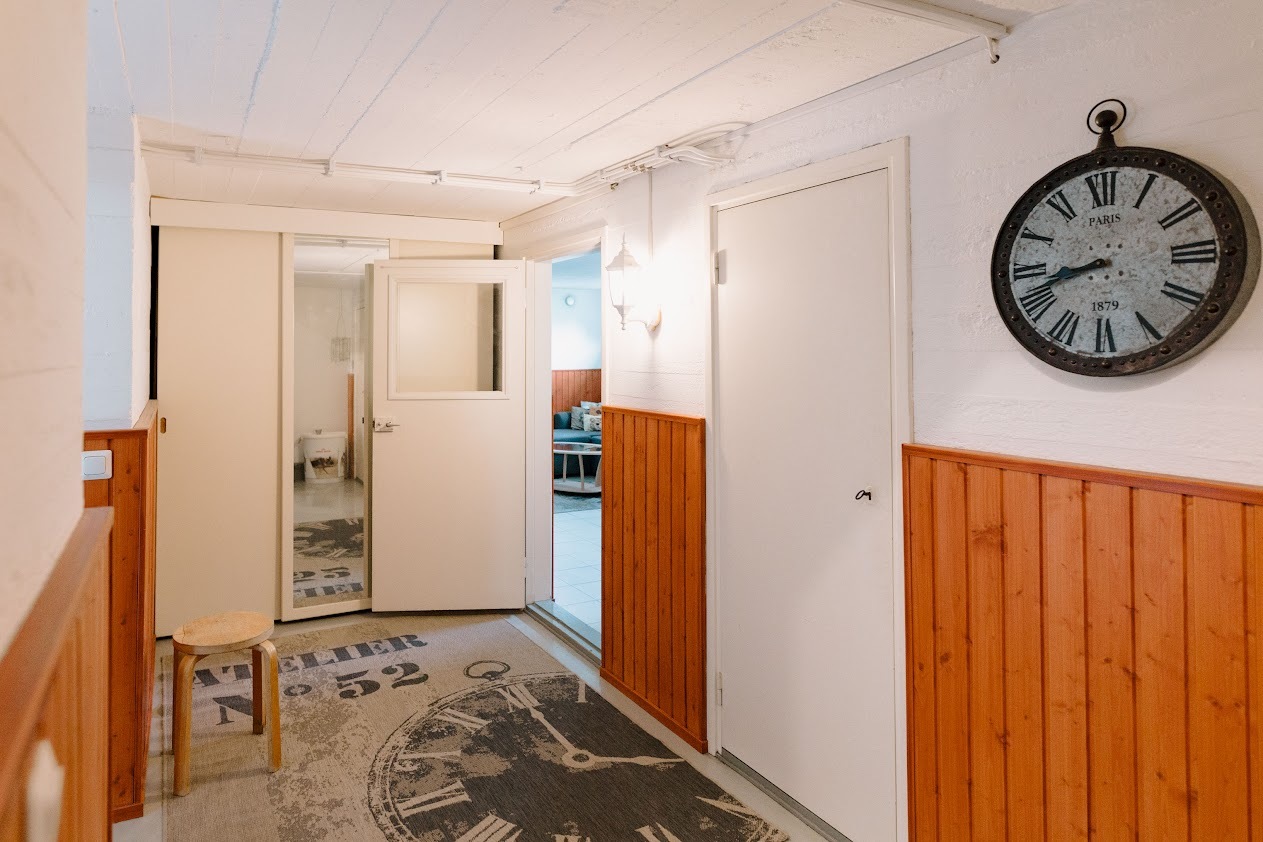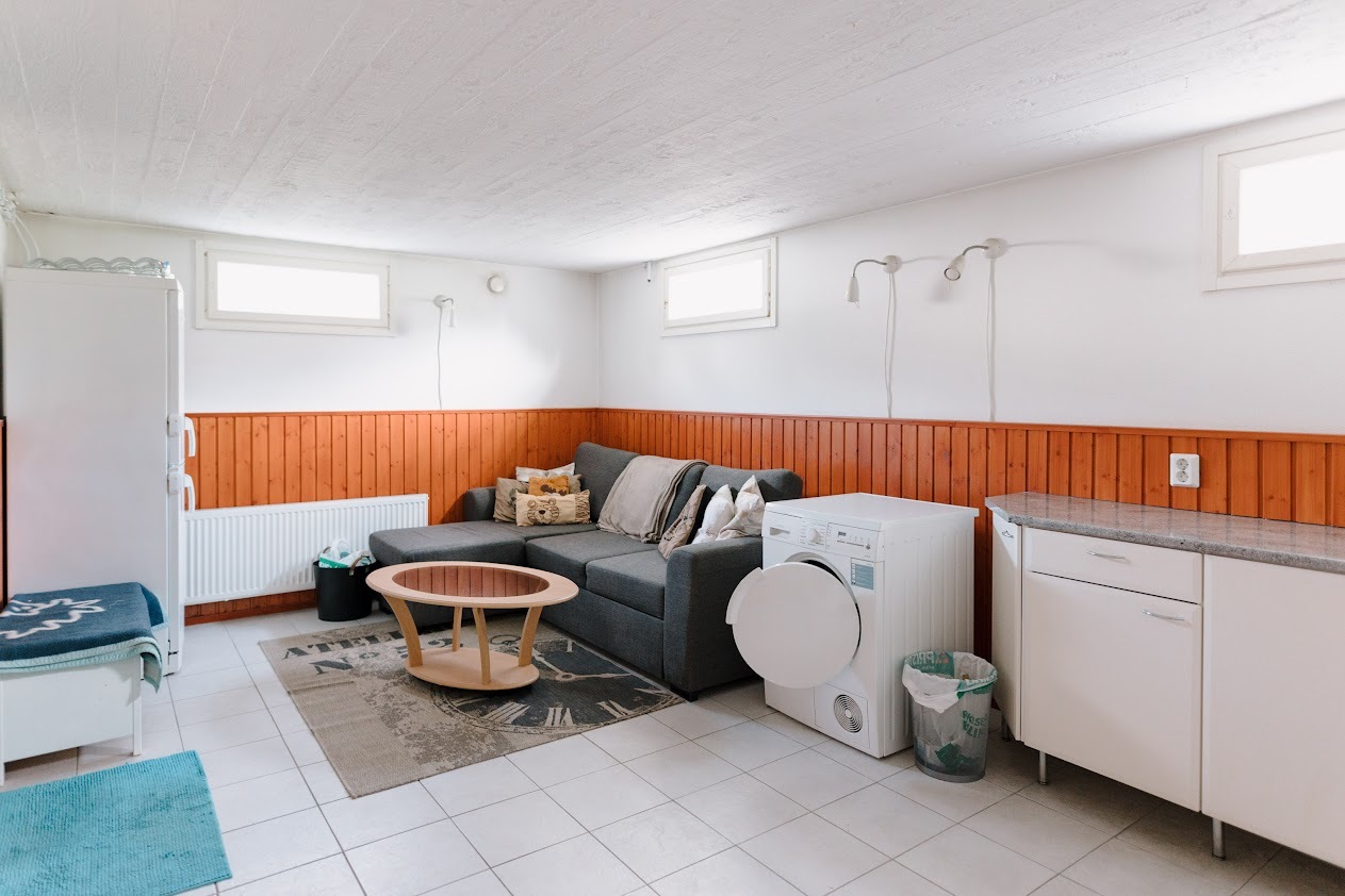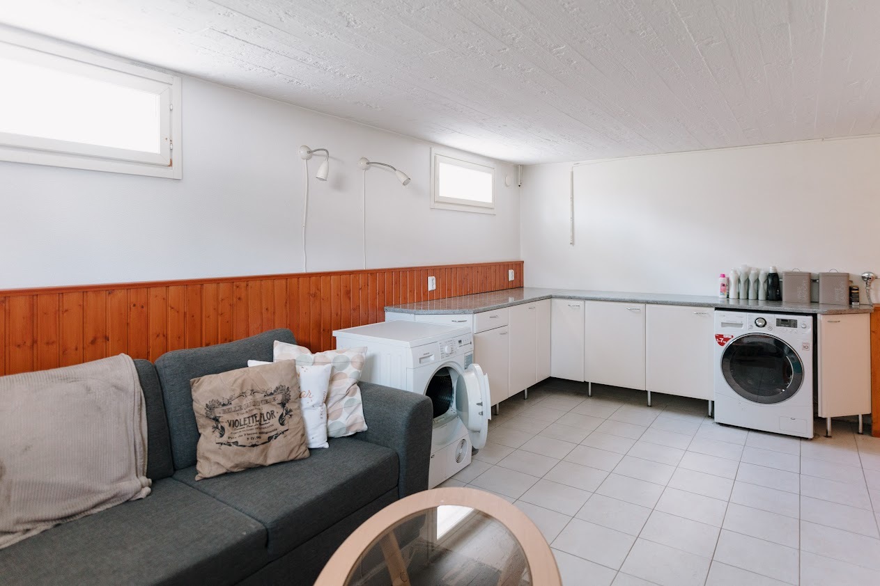 Keskuspölynimuri, lattialämmitys ja pesukoneliitäntä, lattiat (laatta), seinät (puolipaneeli) |