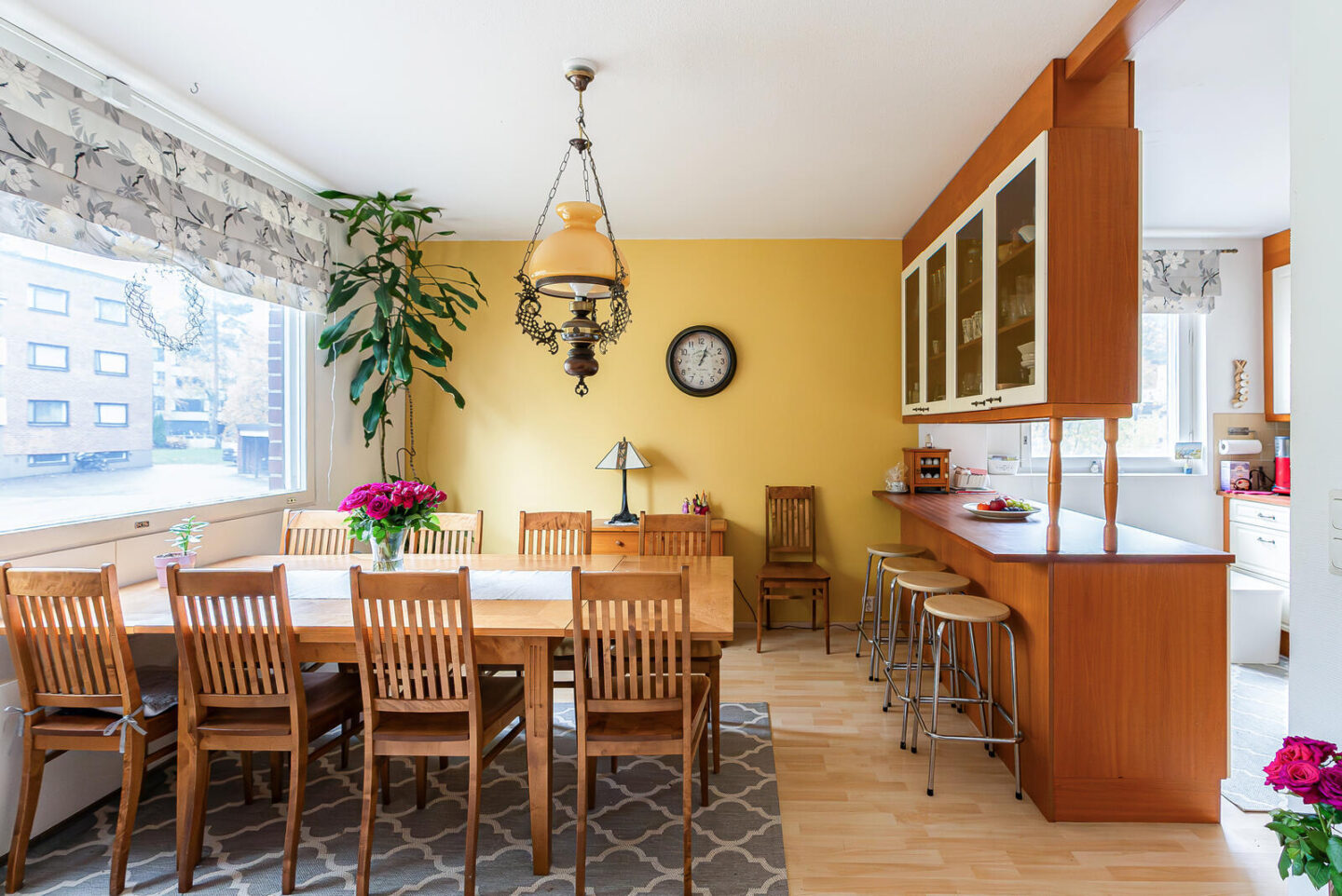 Tilava koti, jossa iso keittiö ja iso ruokasali, josta voi tehdä myös neljännen makuuhuoneen.