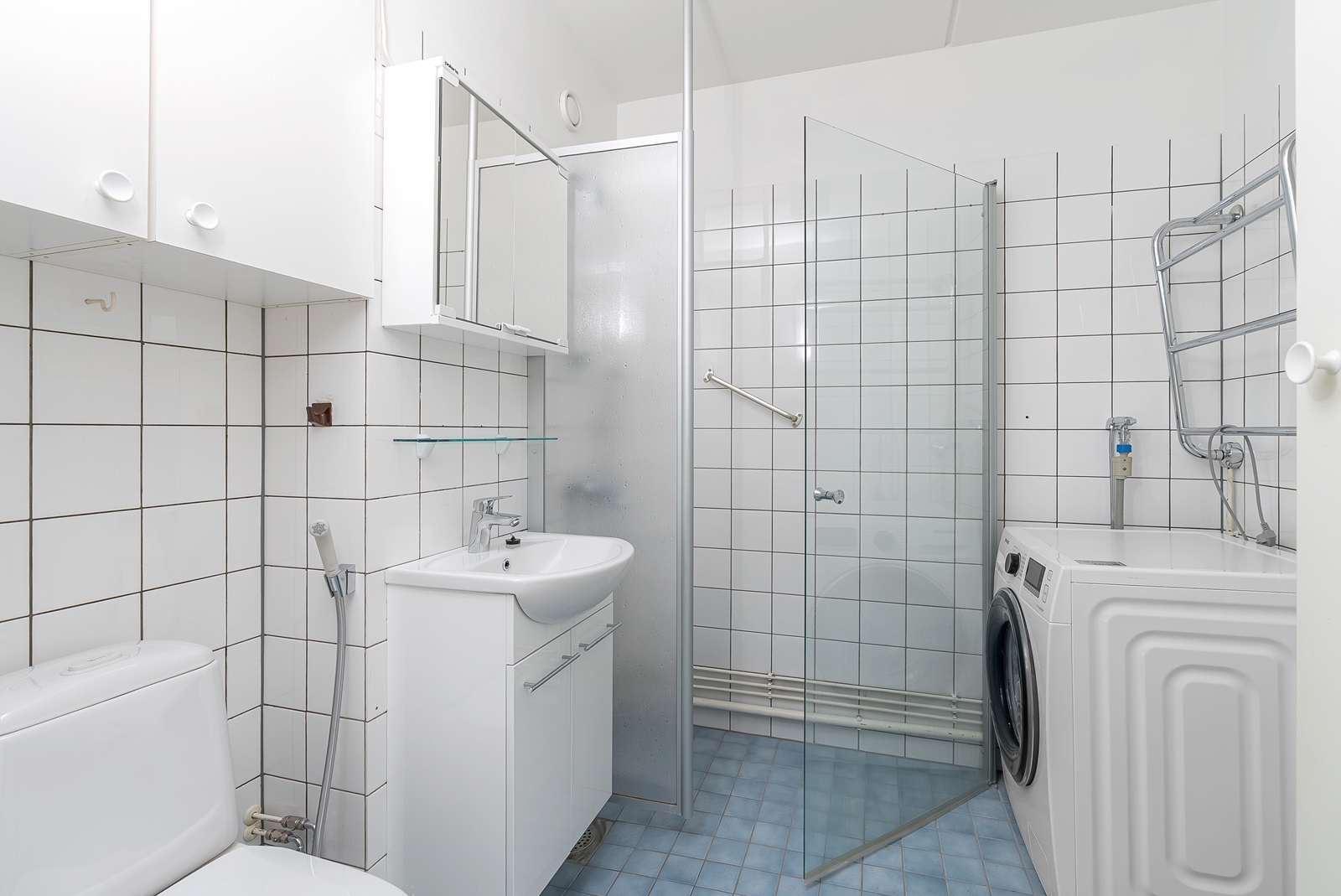 | Kylpyhuoneen kuvaus | WC-istuin, pesukoneliitäntä ja suihku, seinät (kaakeli), lattiat (laatta) |