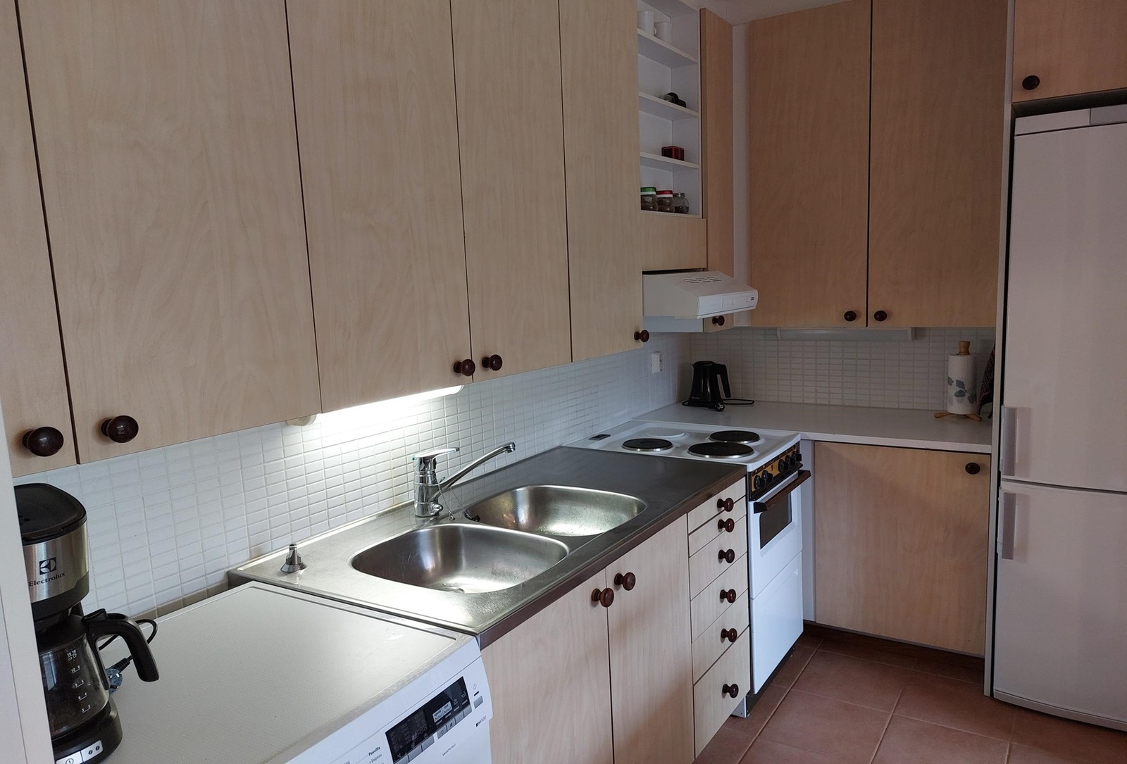 Liesi (sähköliesi), seinät (maali), lattiat (laatta ja laminaatti), liesi, jääkaappipakastin, liesituuletin ja kiinteät valaisimet, – pyykinpesukone ei kuulu kauppaan |