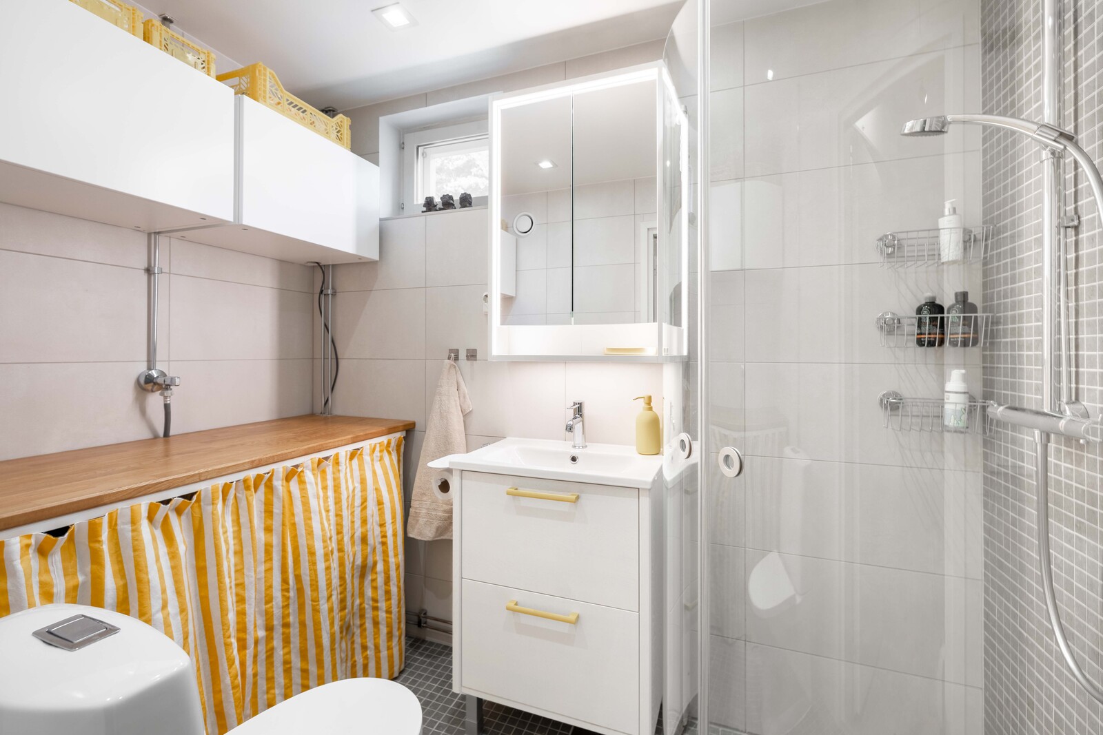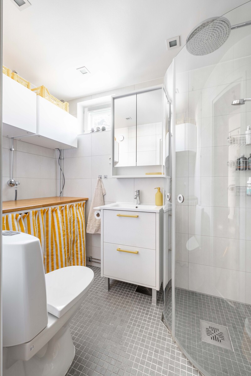 | Kylpyhuoneen kuvaus | Suihkuseinä, lattialämmitys, suihku, pesukoneliitäntä, wc-istuin ja peilikaappi, seinät (kaakeli), lattiat (laatta), seinät vaalea/harmaa laatta, lattia harmaa laatta, kylpyhuoneessa ikkuna, taso, kaapit |